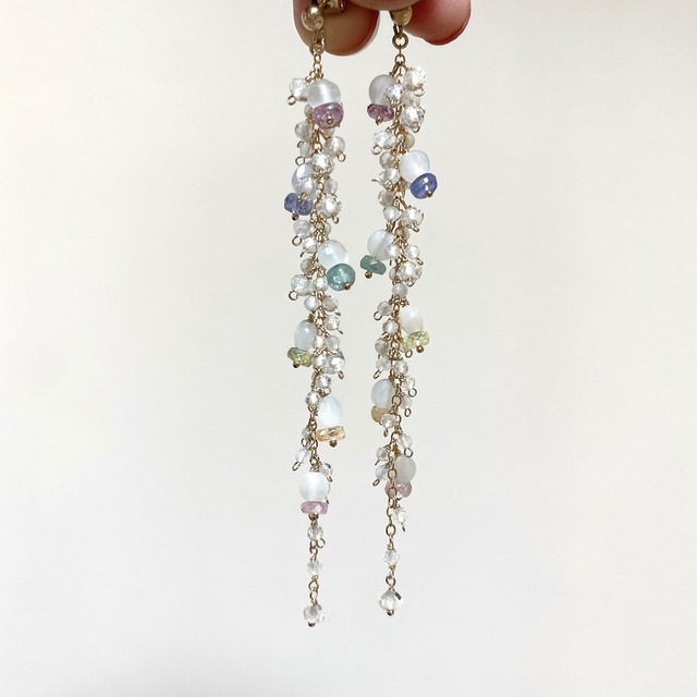 真っ白な雪景色に、色が少しずつ戻ってくるような、季節のはじまりをイメージして仕立てた新シリーズ。 雪のようなコイン型のホワイトムーンストーンに、エメラルド、タンザナイト、カラフルなサファイアを重ねるようにあしらい、虹を思わせる華やかな雰囲気に仕上げました。 ラインには、大粒のホワイトトパーズを主役に、小粒のクリスタルとホワイトカルセドニーをたっぷり散りばめ、クリアで爽やかな印象に。 揺れるたびに光を受けて瑞々しく輝き、ロングならではの華やかさに加え、お顔周りを上品に明るく見せてくれます。 ______ 長さ約8.5cm(金具込み)/all14kgf ホワイトムーンストーン サファイア(パープル/セージグリーン/ゴールデンピーチ/ライトピンク) タンザナイト/エメラルド(濃いグリーン) ホワイトトパーズ/クリスタル/ホワイトカルセドニー ✴︎金具や天然石の煌めきを長くお楽しみ頂けますよう、ご使用後は柔らかい布で優しく拭くことや、ジュエリーボックスへの保管等をおすすめ致します。 ジュエリークロス「セーム革」 https://violabijou.theshop.jp/items/65945050 【ご購入時の注意点 】 ∇スムーズな発送を行うために以下のURLをご一読ください。 https://violabijou.theshop.jp/items/25256161 ∇有料ラッピングご希望のお客様 https://violabijou.theshop.jp/items/29772124 ∇天然石の素材をそのままの状態で使用しておりますので、稀ですが多少の傷や黒ずみがある場合があることや、1つ1つ手作業で制作しているため、色や形に若干の違いが生じる場合がございます。予めご了承ください。 ∇お使いの端末や閲覧環境により、写真と実物の色味や質感やサイズ感が多少異なって見えることがございます。 ∇デリケートな作品ですので、強い力を加えたり、浸水、ドライヤーなどの高温にご注意下さい。 ∇使用している素材は比較的金属アレルギーの方も安心してお使い頂けるとは思いますが、お肌に合わない・異常が出た場合は使用をお控え下さい。 ∇商品は、個人使用を目的とした範囲でのみ購入が可能です。第三者への転売を目的としたご購入はご遠慮ください。 その他ご不明な点がございましたらご注文前にお気軽にご質問ください。