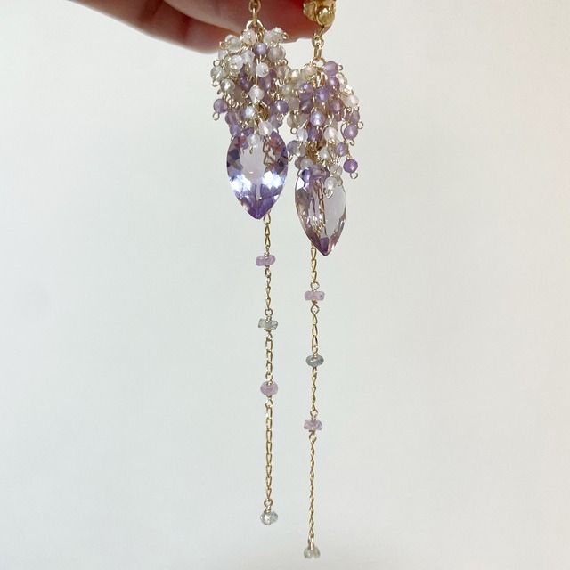 春にしとしとと降る、やわらかく繊細な雨を思わせる、優美なロングピアス。 リーフ型の大粒アメジストを主役に、揺れるたびに繊細なきらめきを放つ、印象的なデザインに仕上げました。 トップには、小粒のピンクアメジスト、ローズクォーツ、レモンクォーツを贅沢にあしらい、やさしい色の重なりが春雨のようなみずみずしさとふわりと広がる華やかさを表現しました。 チェーン部分には、ライトピンクとミントグリーンのサファイアを添え、爽やかで透明感のある色合わせに。 ロング丈ならではの優雅な揺れ感が、耳元にエレガントでラグジュアリーな存在感を添えてくれる一点です。 ______ 長さ約9cm(金具込み)/all14kgf アメジスト約15×10mm ピンクアメジスト/ローズクォーツ/レモンクォーツ ライトピンクサファイア/ミントグリーンサファイア ✴︎金具や天然石の煌めきを長くお楽しみ頂けますよう、ご使用後は柔らかい布で優しく拭くことや、ジュエリーボックスへの保管等をおすすめ致します。 ジュエリークロス「セーム革」 https://violabijou.theshop.jp/items/65945050 【ご購入時の注意点 】 ∇スムーズな発送を行うために以下のURLをご一読ください。 https://violabijou.theshop.jp/items/25256161 ∇有料ラッピングご希望のお客様 https://violabijou.theshop.jp/items/29772124 ∇天然石の素材をそのままの状態で使用しておりますので、稀ですが多少の傷や黒ずみがある場合があることや、1つ1つ手作業で制作しているため、色や形に若干の違いが生じる場合がございます。予めご了承ください。 ∇お使いの端末や閲覧環境により、写真と実物の色味や質感やサイズ感が多少異なって見えることがございます。 ∇デリケートな作品ですので、強い力を加えたり、浸水、ドライヤーなどの高温にご注意下さい。 ∇使用している素材は比較的金属アレルギーの方も安心してお使い頂けるとは思いますが、お肌に合わない・異常が出た場合は使用をお控え下さい。 ∇商品は、個人使用を目的とした範囲でのみ購入が可能です。第三者への転売を目的としたご購入はご遠慮ください。 その他ご不明な点がございましたらご注文前にお気軽にご質問ください。