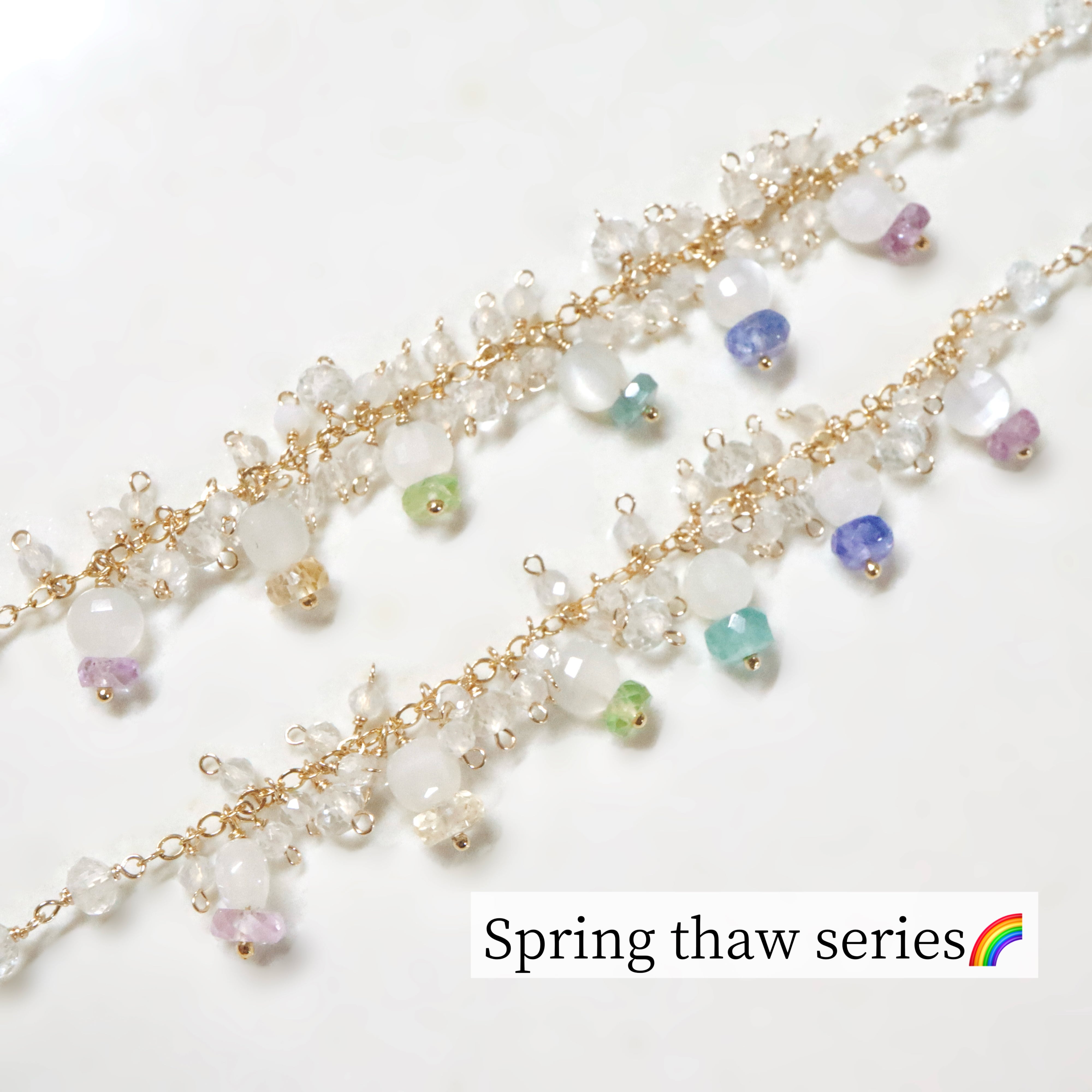 真っ白な雪景色に、色が少しずつ戻ってくるような、季節のはじまりをイメージして仕立てた新シリーズ。 雪のようなコイン型のホワイトムーンストーンに、エメラルド、タンザナイト、カラフルなサファイアを重ねるようにあしらい、虹を思わせる華やかな雰囲気に仕上げました。 ラインには、大粒のホワイトトパーズを主役に、小粒のクリスタルとホワイトカルセドニーをたっぷり散りばめ、クリアで爽やかな印象に。 手元が動くたびに瑞々しくきらめき、多彩な差し色が気分を高めてくれる一点です。 _________ ご希望の金具(14kgfカンもしくは14kgfマグネット+カン)をカーソルでお選び頂けます。 掲載ラスト2ページに装置方法を記載しております。 マグネット操作時の皮膚トラブル等、当店では責任を負いかねますのでご了承下さいませ。 ご不明な点がございましたらお問い合わせ下さい。 ______ 約18.5cm(内約3cm調節可)/all14kgf ホワイトムーンストーン サファイア(パープル/セージグリーン/ゴールデンピーチ/ライトピンク) タンザナイト/エメラルド(濃いグリーン) ホワイトトパーズ/クリスタル/ホワイトカルセドニー ✴︎金具や天然石の煌めきを長くお楽しみ頂けますよう、ご使用後は柔らかい布で優しく拭くことや、ジュエリーボックスへの保管等をおすすめ致します。 ________ 【ご購入前にご一読ください】 ∇ショッピングガイド https://violabijou.theshop.jp/p/00001 ∇ギフトバッグ https://violabijou.theshop.jp/items/84774682 ▽素材やケアグッズについて https://violabijou.theshop.jp/p/00004 ∇天然石の素材をそのままの状態で使用しておりますので、稀ですが多少の傷や黒ずみがある場合があることや、1つ1つ手作業で制作しているため、色や形に若干の違いが生じる場合がございます。予めご了承ください。 ∇お使いの端末や閲覧環境により、写真と実物の色味や質感やサイズ感が多少異なって見えることがございます。 ∇デリケートな作品ですので、強い力を加えたり、浸水、ドライヤーなどの高温にご注意下さい。 ∇使用している素材は比較的金属アレルギーの方も安心してお使い頂けるとは思いますが、お肌に合わない・異常が出た場合は使用をお控え下さい。 ∇商品は、個人使用を目的とした範囲でのみ購入が可能です。第三者への転売を目的としたご購入はご遠慮ください。 その他ご不明な点がございましたらご注文前にお気軽にご質問ください。 ▶︎ violaアクセサリーの着用画像は、Instagram(@viola_bijou)ハイライトにてご紹介しています。 https://www.instagram.com/viola_bijou