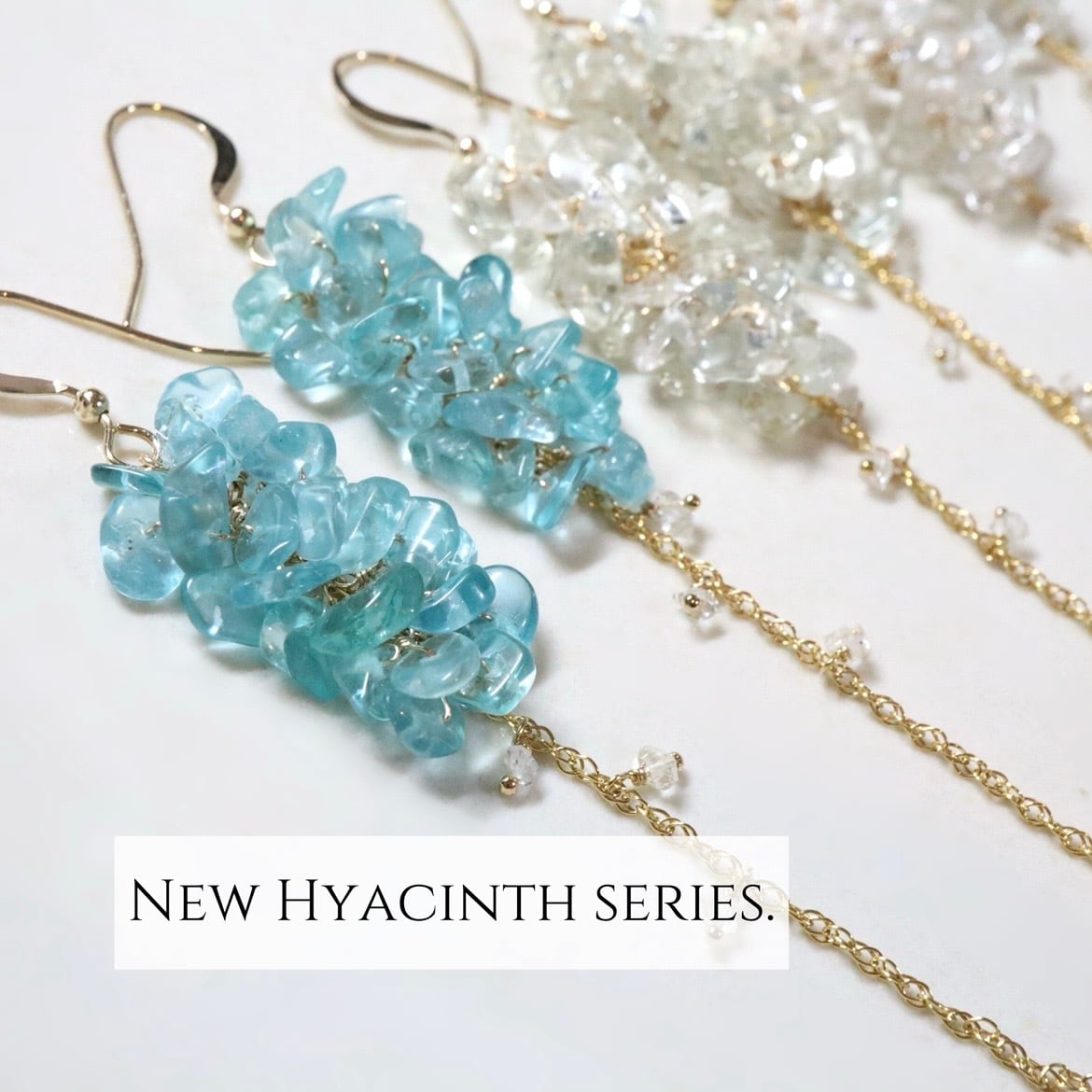 春に咲く華やかなヒヤシンスからイマジネーションを膨らませ、まるで冬に咲く氷のような神秘的なヒヤシンスピアスに。 鮮やかなネオンブルーが印象的なブルーアパタイトのチップをたっぷりと使用し、小花が連なったようなふわりとしたシルエットに。 チップならではの艶やかな光沢が透明感と華やかさをプラスしてくれます。 ボトムのチェーンには小粒のハーキマーダイヤモンドを添え、茎に滴る雫を表現。 優美な揺れ感と軽やかな着け心地は、エレガント〜カジュアルまで幅広いお洋服に合わせてお使い頂けます。 ______ 長さ約8cm(金具込み)/all14kgf ブルーアパタイト ハーキマーダイヤモンド ✴︎金具や天然石の煌めきを長くお楽しみ頂けますよう、ご使用後は柔らかい布で優しく拭くことや、ジュエリーボックスへの保管等をおすすめ致します。 ジュエリークロス「セーム革」 https://violabijou.theshop.jp/items/65945050 【ご購入時の注意点 】 ∇スムーズな発送を行うために以下のURLをご一読ください。 https://violabijou.theshop.jp/items/25256161 ∇有料ラッピングご希望のお客様 https://violabijou.theshop.jp/items/29772124 ∇天然石の素材をそのままの状態で使用しておりますので、稀ですが多少の傷や黒ずみがある場合があることや、1つ1つ手作業で制作しているため、色や形に若干の違いが生じる場合がございます。予めご了承ください。 ∇お使いの端末や閲覧環境により、写真と実物の色味や質感やサイズ感が多少異なって見えることがございます。 ∇デリケートな作品ですので、強い力を加えたり、浸水、ドライヤーなどの高温にご注意下さい。 ∇使用している素材は比較的金属アレルギーの方も安心してお使い頂けるとは思いますが、お肌に合わない・異常が出た場合は使用をお控え下さい。 ∇商品は、個人使用を目的とした範囲でのみ購入が可能です。第三者への転売を目的としたご購入はご遠慮ください。 その他ご不明な点がございましたらご注文前にお気軽にご質問ください。