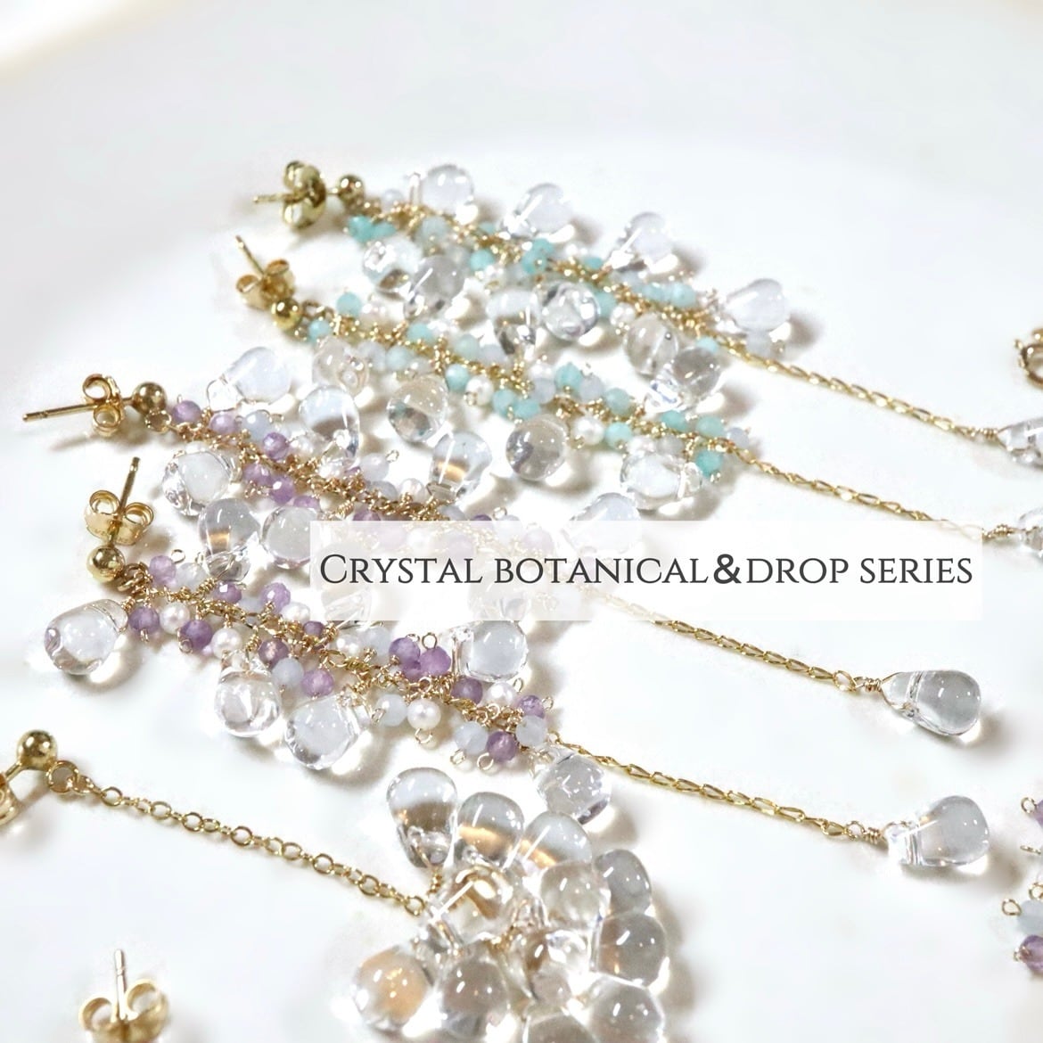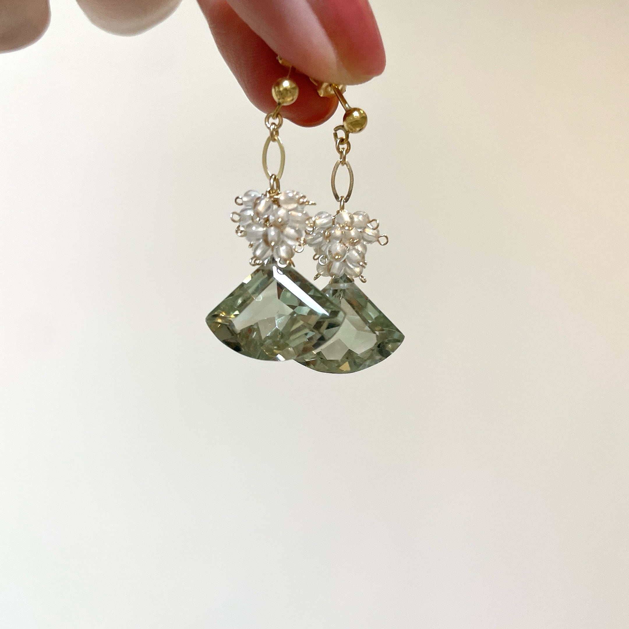 うるうるとしたドロップ型クリスタルを贅沢に連ねた、ボタニカルシリーズです。 アマゾナイトシリカとグレイッシュブルージェードのミントブルーが爽やかにきらめく、軽やかなトーンに仕上げました。 淡水パールの光沢が、耳元にさりげない明るさと上品な印象をプラスしてくれます。 ボトムで揺れるクリスタルが、顔まわりを可憐な印象に。 カジュアルからきれいめまで幅広いコーディネートに合わせやすく、普段のスタイルを品良くアップデートしてくれる一点です。 ______ 装着高さ約8cm /all 14kgf クリスタル7×5mm前後 アマゾナイトシリカ グレイッシュブルージェード 淡水パール ✴︎金具や天然石の煌めきを長くお楽しみ頂けますよう、ご使用後は柔らかい布で優しく拭くことや、ジュエリーボックスへの保管等をおすすめ致します。 ________ 【ご購入前にご一読ください】 ∇ショッピングガイド https://violabijou.theshop.jp/p/00001 ∇ギフトバッグ https://violabijou.theshop.jp/items/84774682 ▽素材やケアグッズについて https://violabijou.theshop.jp/p/00004 ∇天然石の素材をそのままの状態で使用しておりますので、稀ですが多少の傷や黒ずみがある場合があることや、1つ1つ手作業で制作しているため、色や形に若干の違いが生じる場合がございます。予めご了承ください。 ∇お使いの端末や閲覧環境により、写真と実物の色味や質感やサイズ感が多少異なって見えることがございます。 ∇デリケートな作品ですので、強い力を加えたり、浸水、ドライヤーなどの高温にご注意下さい。 ∇使用している素材は比較的金属アレルギーの方も安心してお使い頂けるとは思いますが、お肌に合わない・異常が出た場合は使用をお控え下さい。 ∇商品は、個人使用を目的とした範囲でのみ購入が可能です。第三者への転売を目的としたご購入はご遠慮ください。 その他ご不明な点がございましたらご注文前にお気軽にご質問ください。