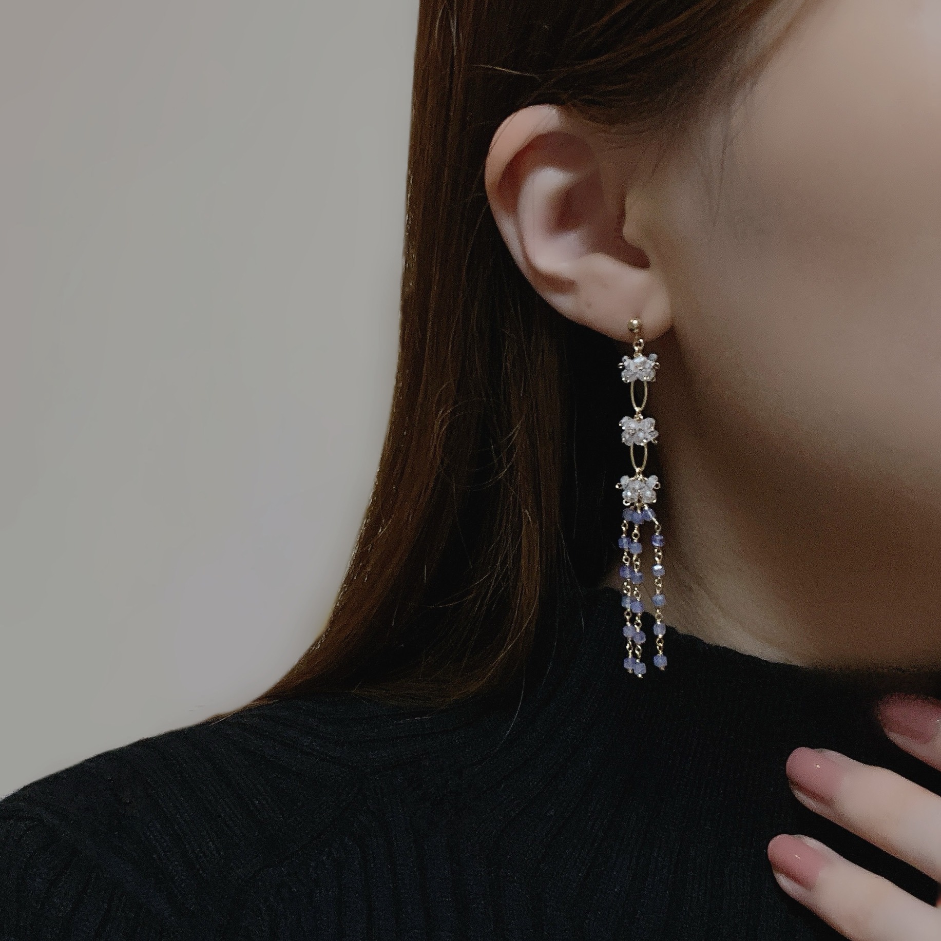 揺れる度に光を反射してキラキラと輝き、秋冬のシックな装いにも映えるデザインです。