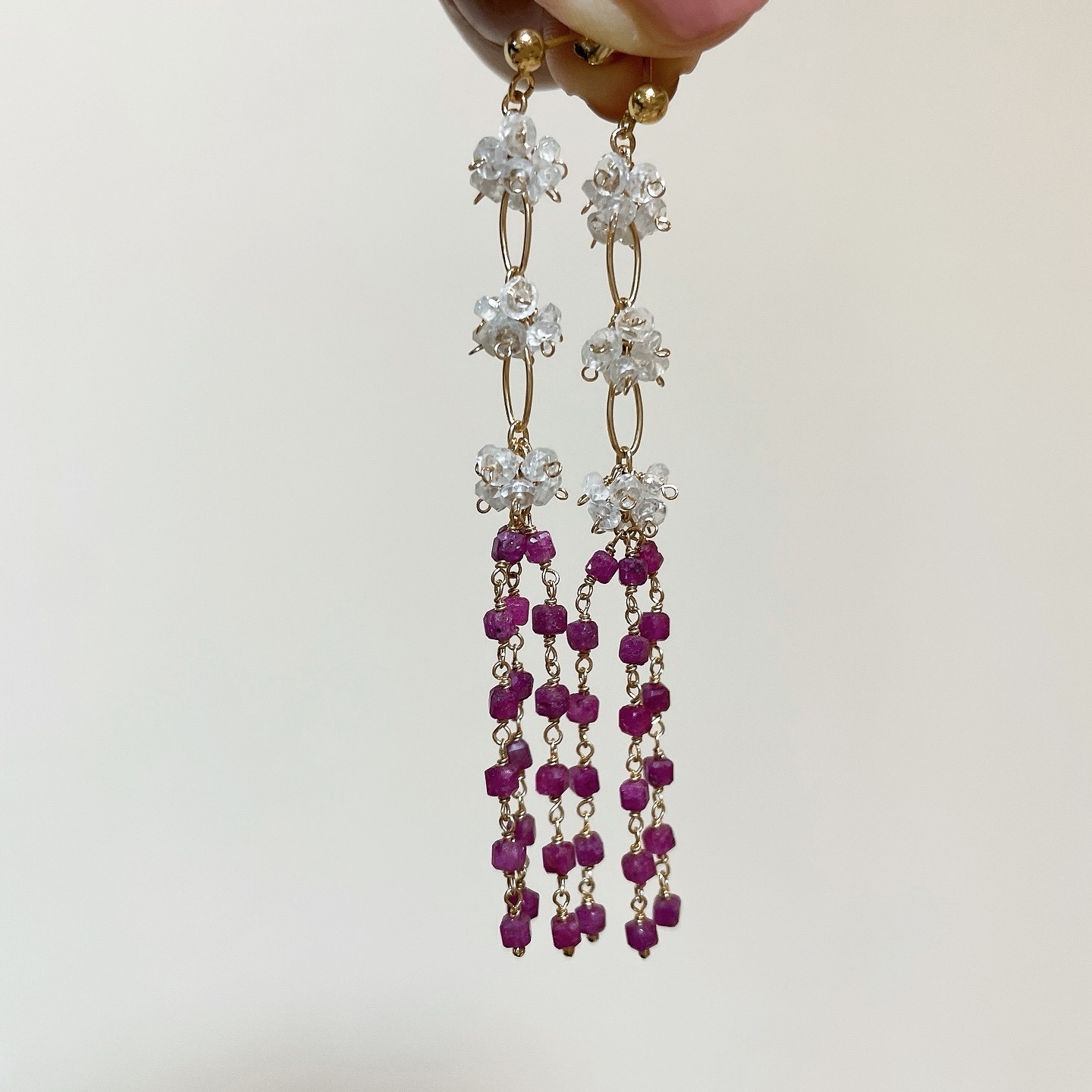 ボトムには極小サイズのキューブカットルビーを贅沢に連ね、女性らしい華やぎと、動くたびにしなやかに揺れる立体的なレイヤードスタイルに仕上げました。