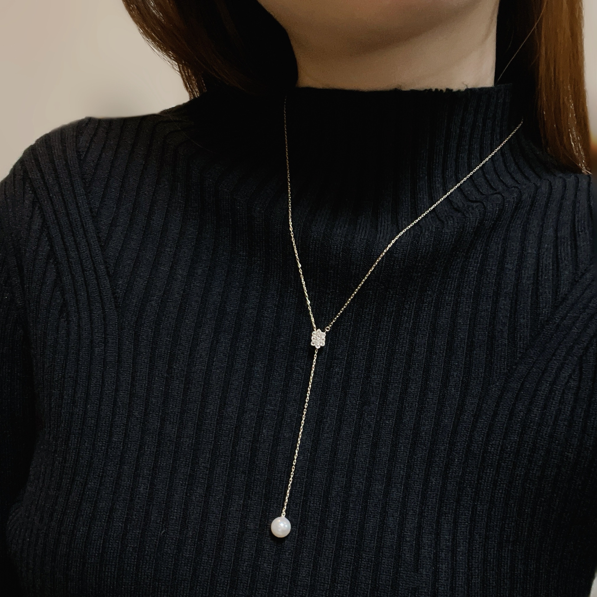 トップ部分のホワイトトパーズからまっすぐにチェーンが伸び、胸元で淡水パールがそっと揺れる、縦のラインが美しいデザイン。