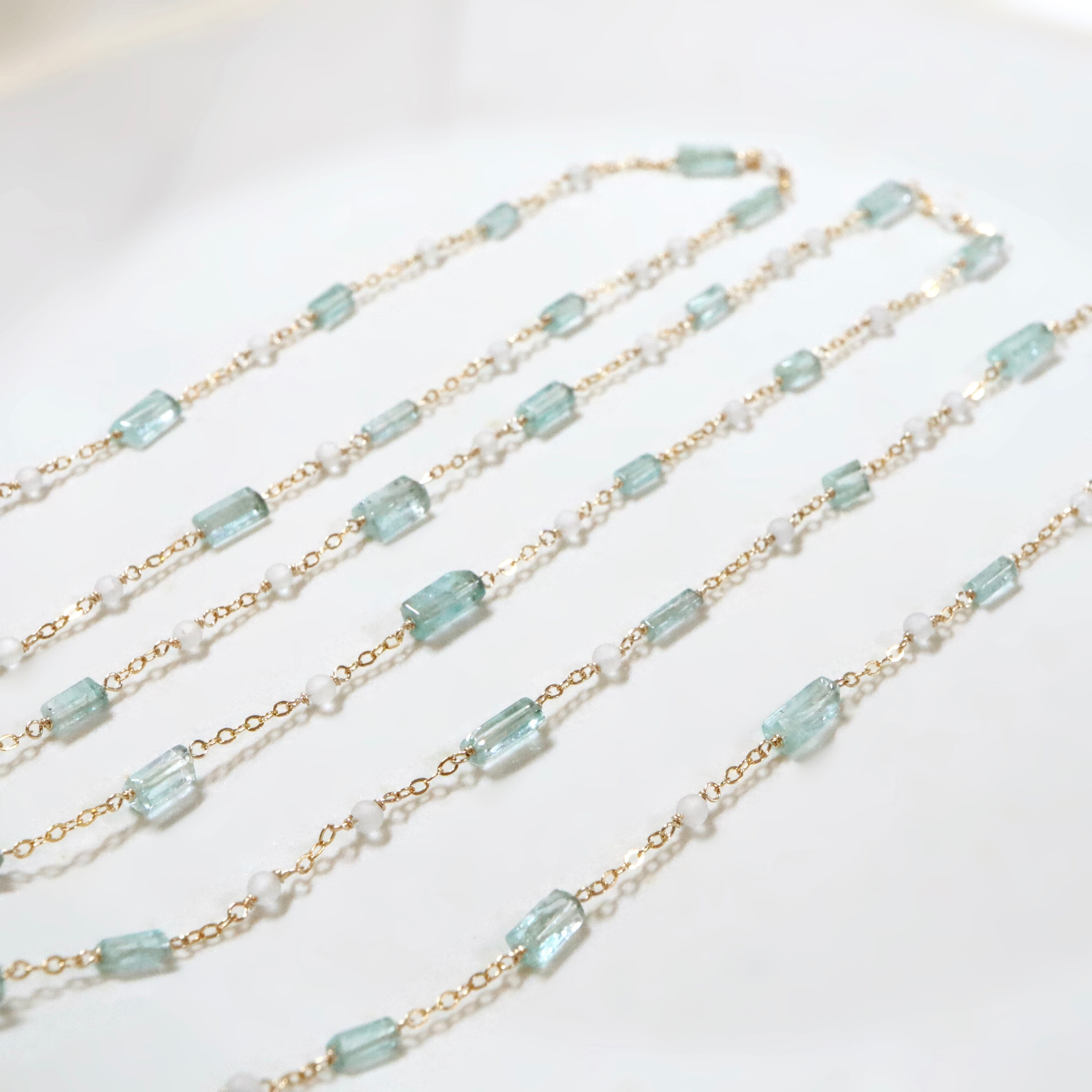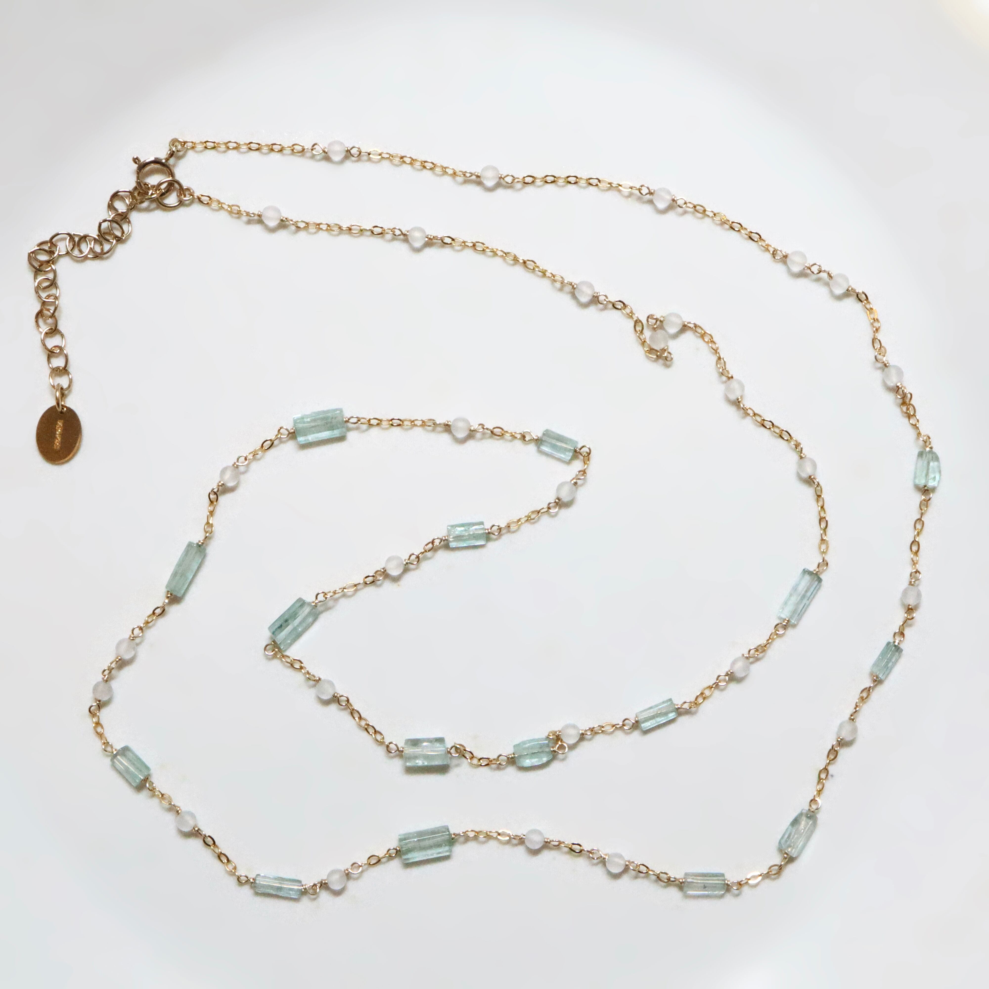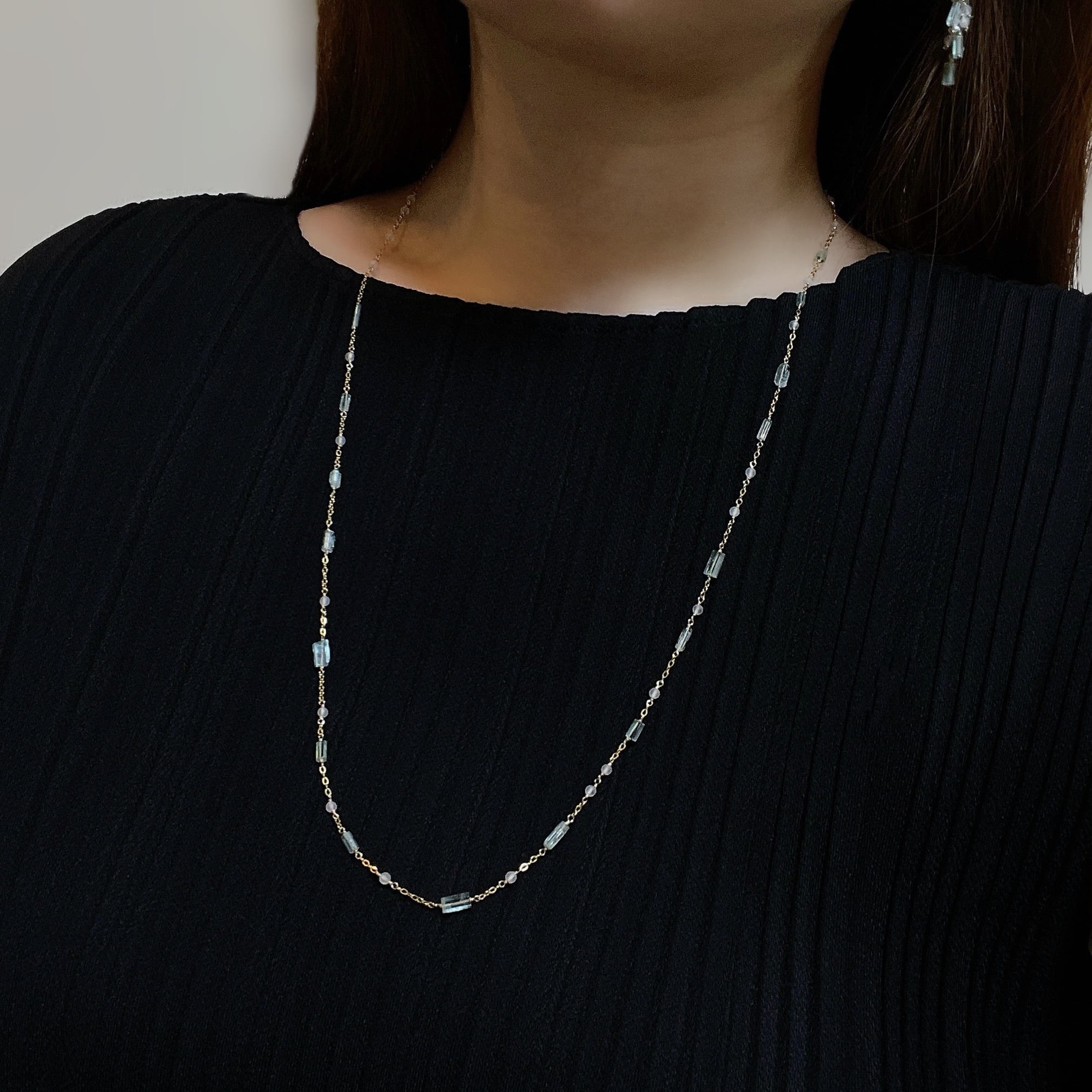 青みがかったグリーンカラーが美しいスティック型のザンビア産エメラルドと、涼しげなフロスト加工を施したフロストクォーツを贅沢に使用し、ランダムに連ねてロングネックレスに仕上げました。