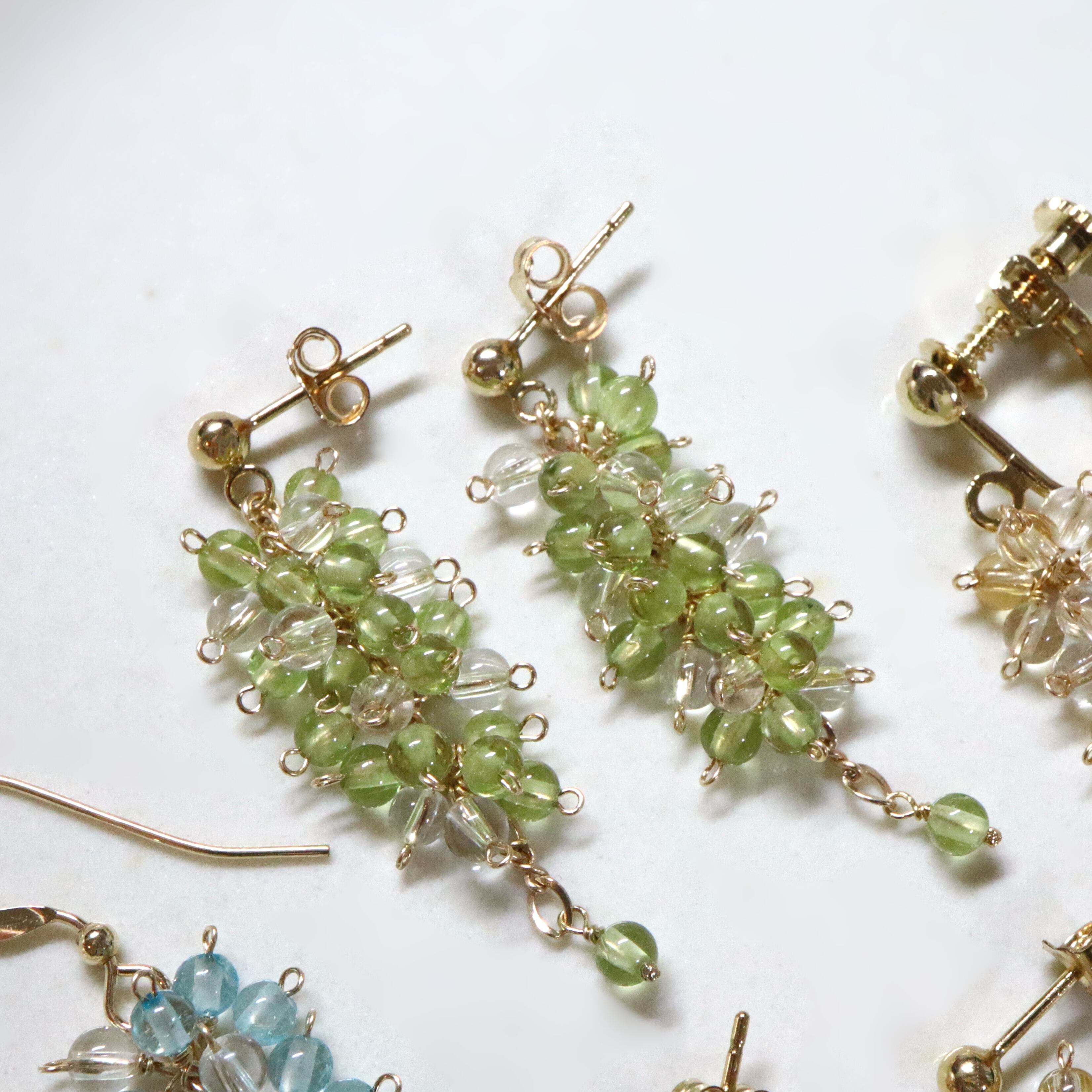 粒がふわりと並んだ軽やかなフォルムが、耳元でやさしく揺れ、コーディネートにそっと彩りを加えてくれます。