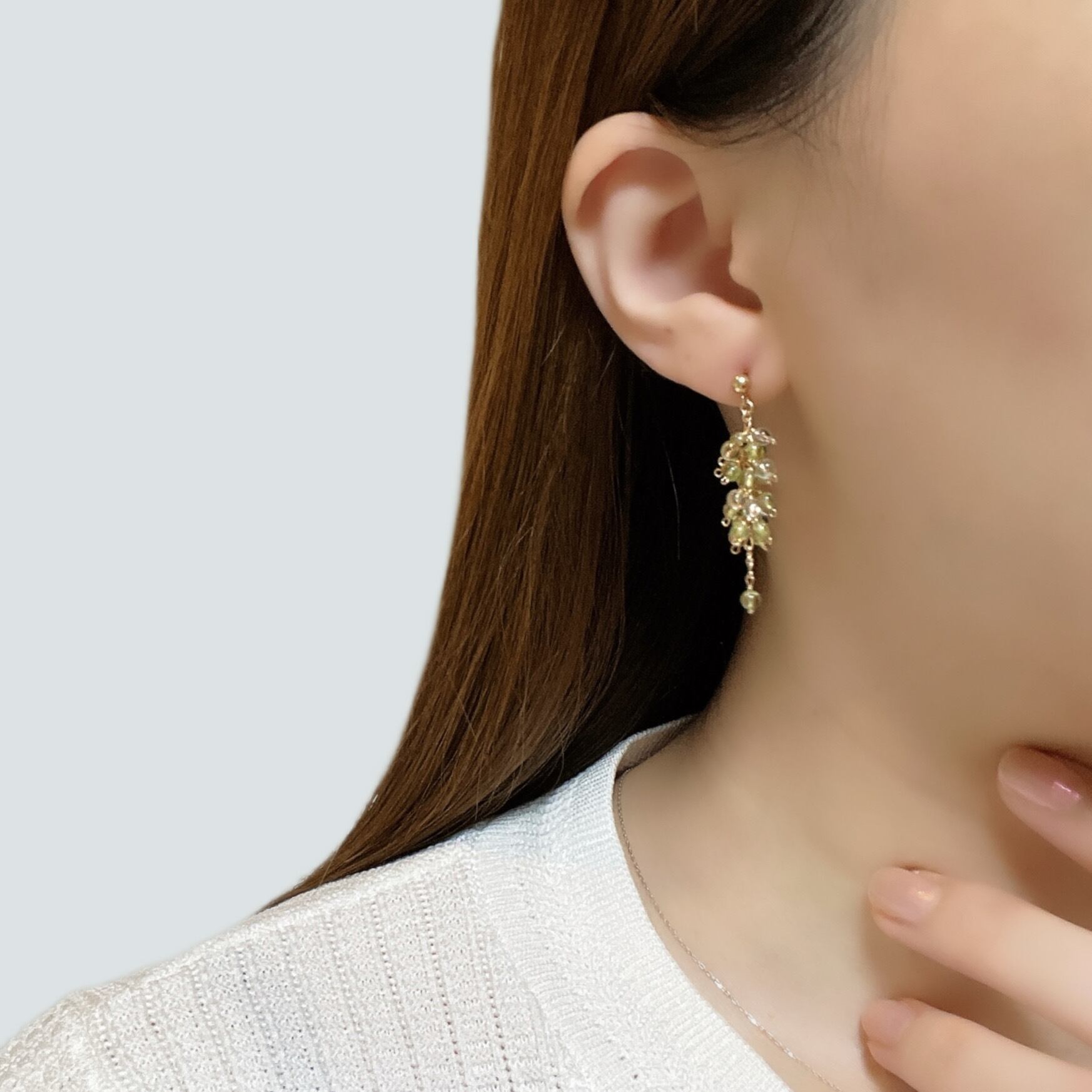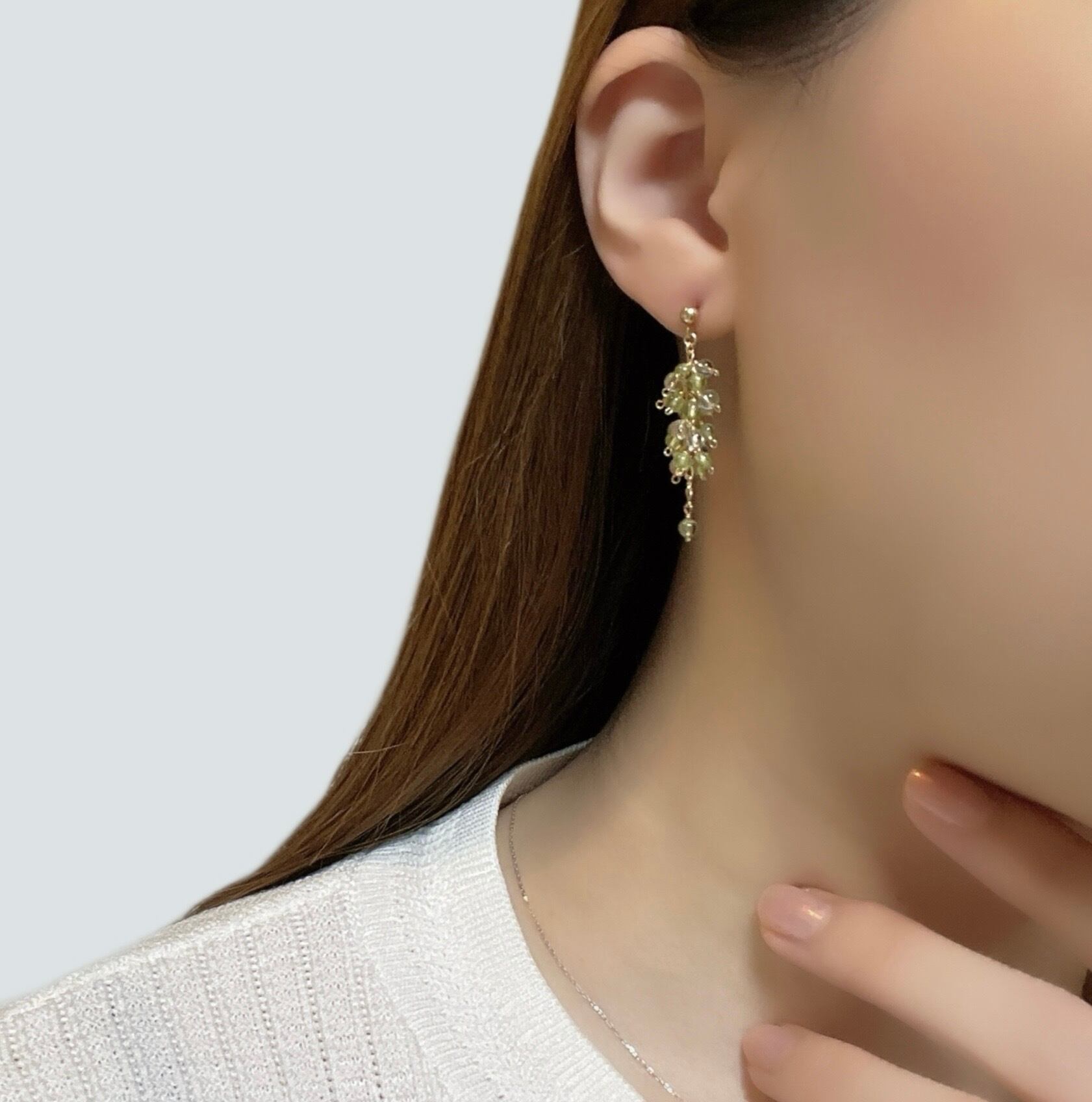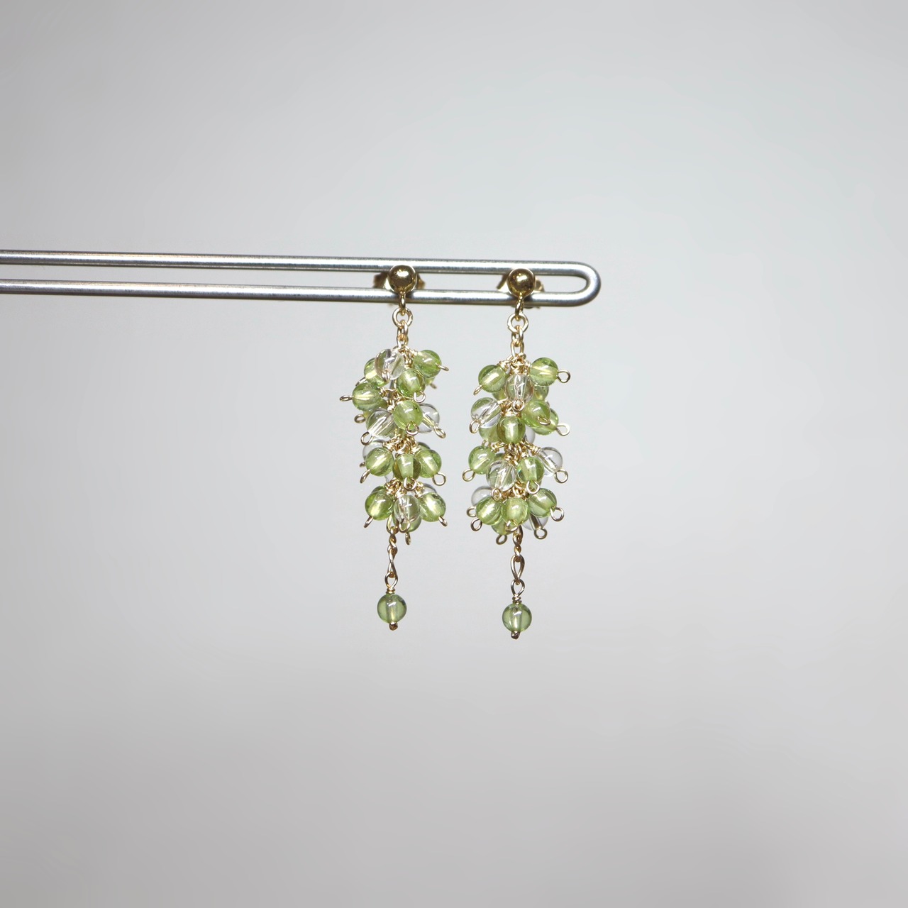 まるで若葉の息吹を閉じ込めたような小粒のペリドットに、透明感のあるクリスタルを重ね、みずみずしく清らかな印象に仕上げたショートピアス。