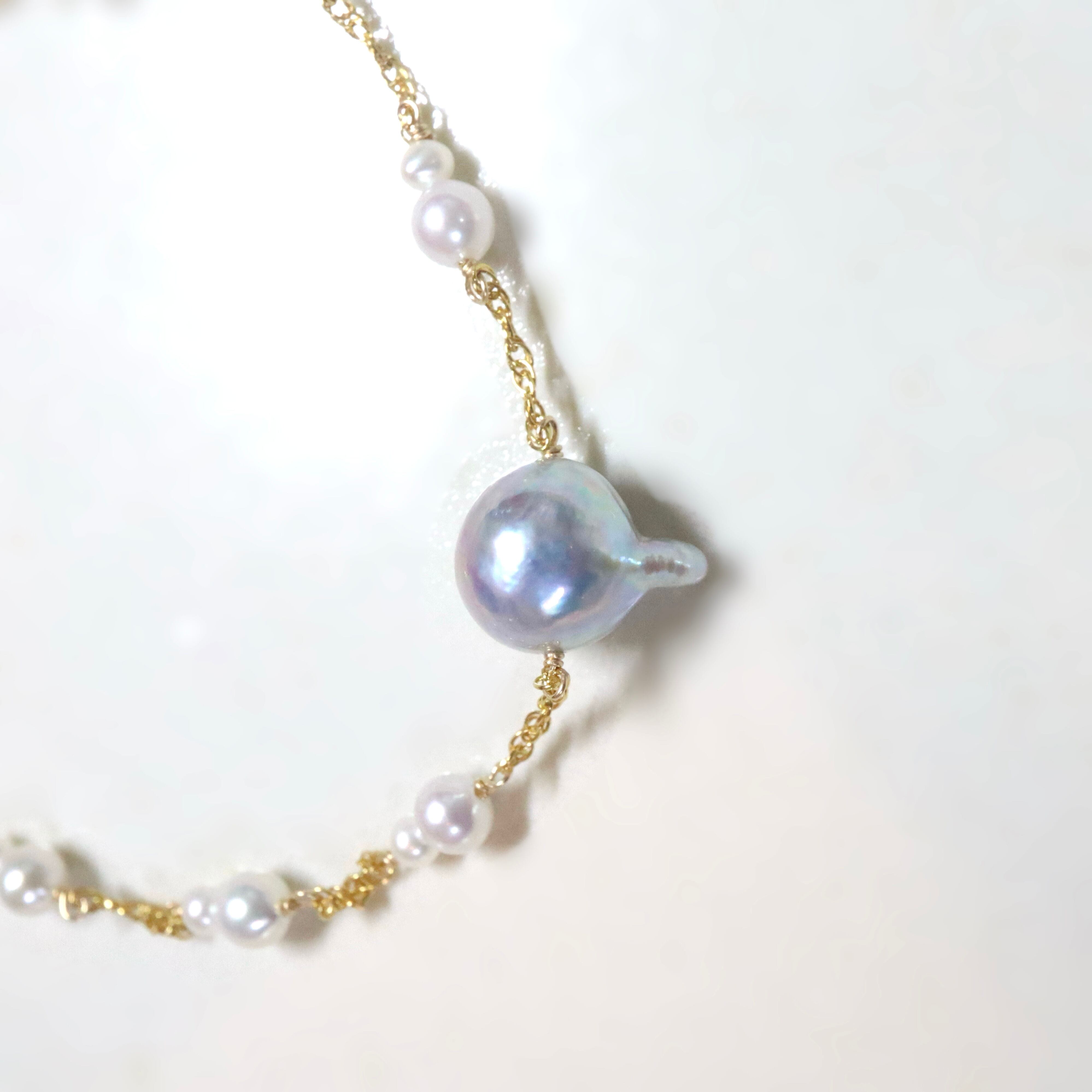 チェーンには、フレッシュな照りを持つサイズの異なる淡水パールをリズムよくあしらい、