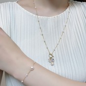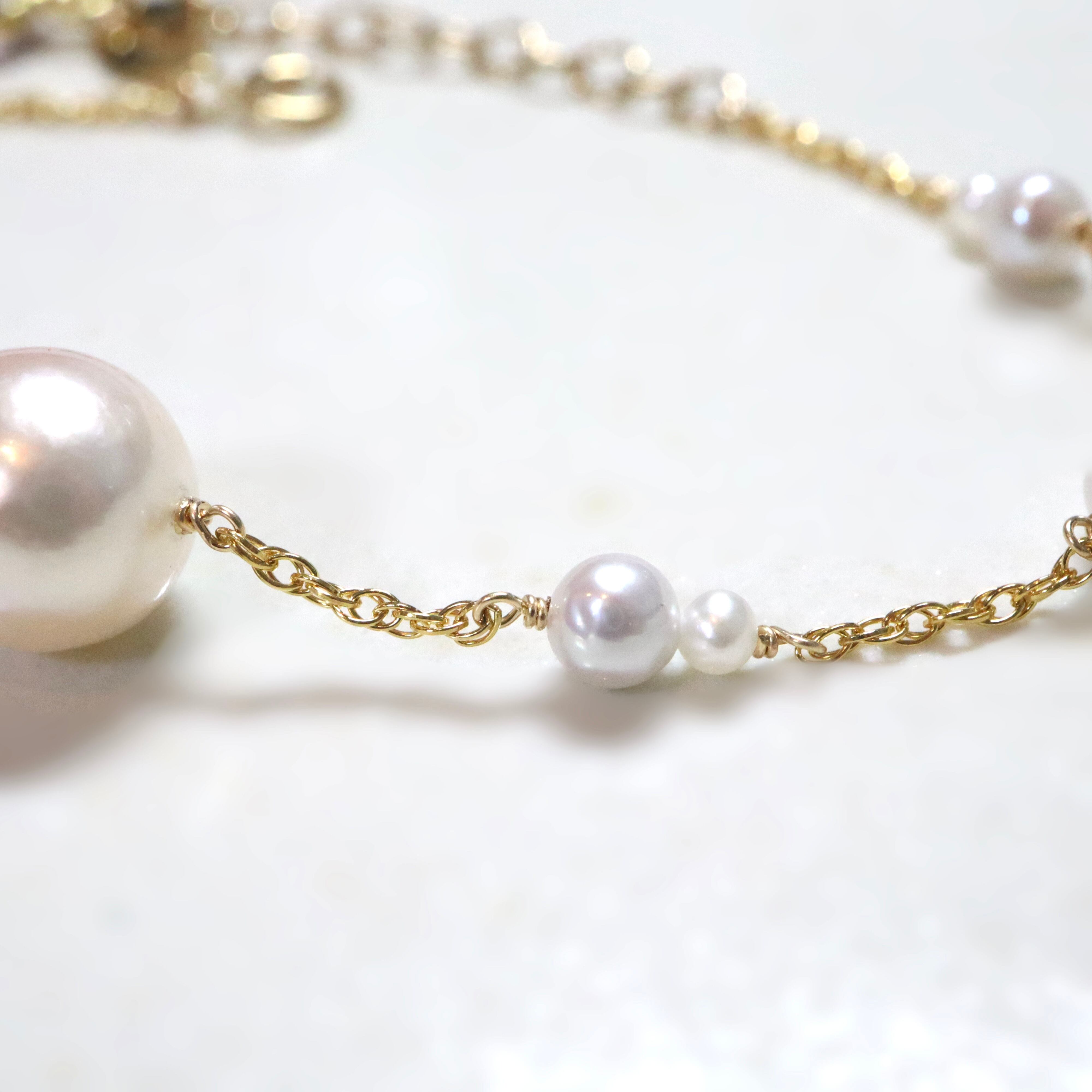 チェーンには、フレッシュな照りを持つサイズの異なる淡水パールをリズムよくあしらい、
