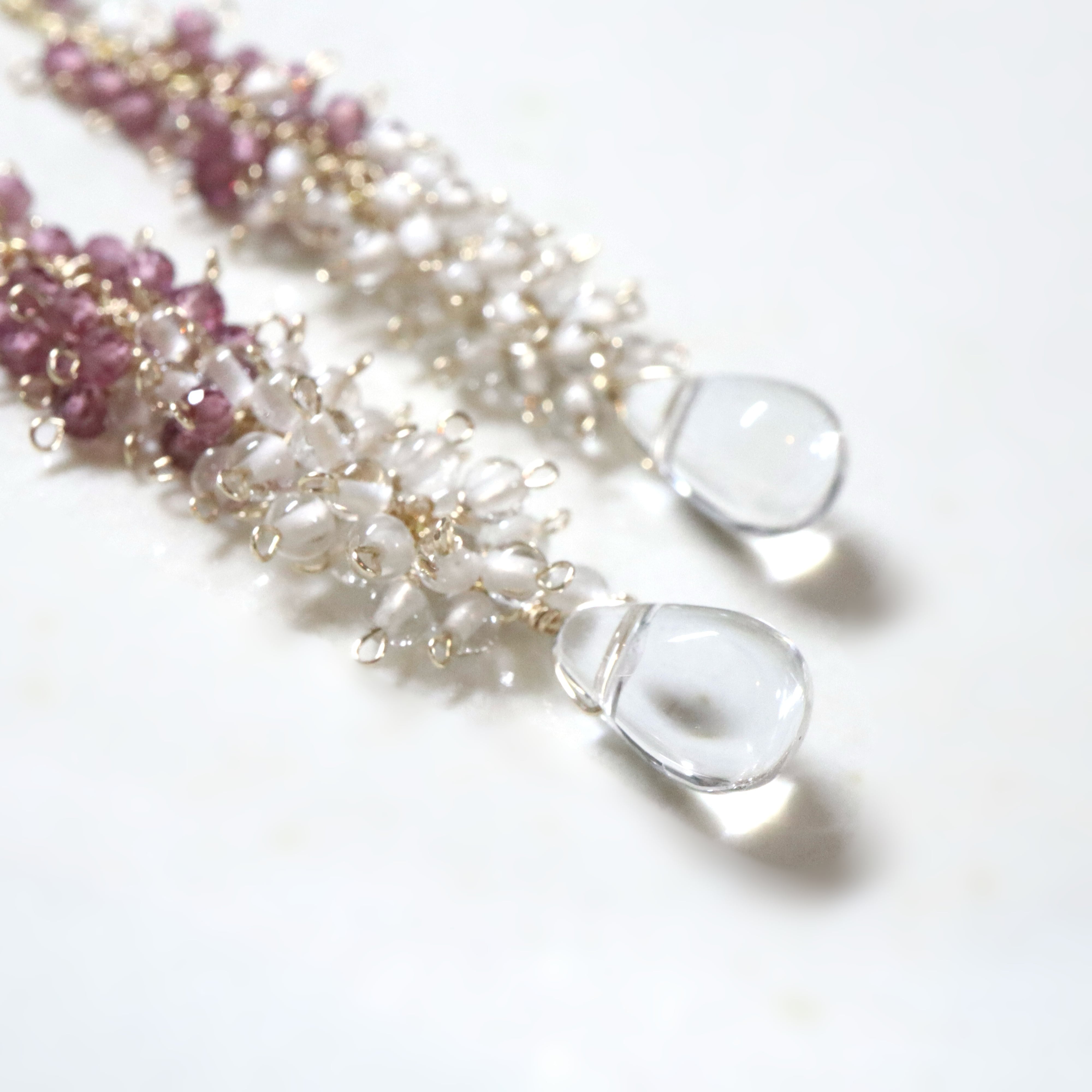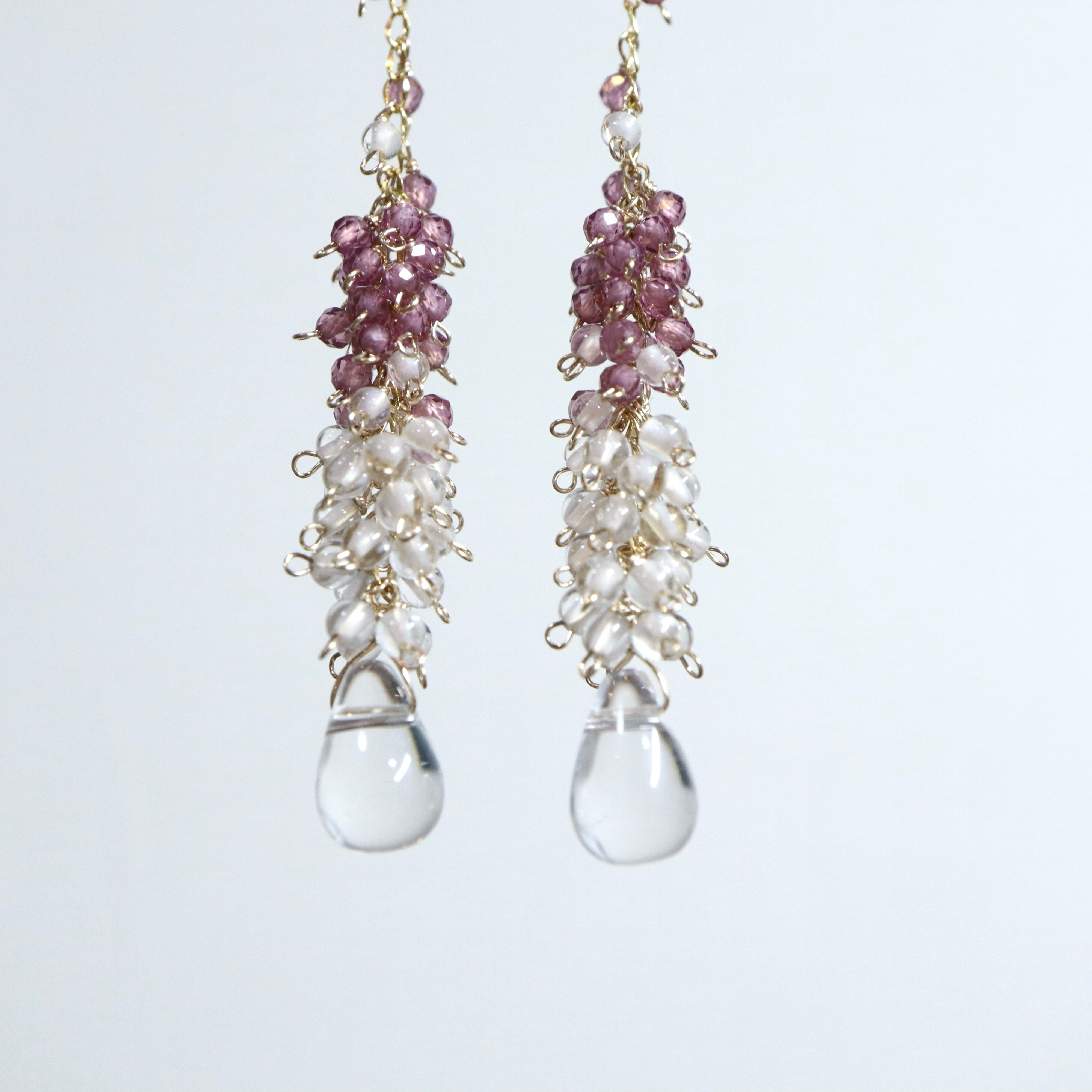 深みのあるワインレッドがしっとりと煌めくロードライトガーネットと、つややかな質感が可愛らしい小粒のクリスタルをたっぷりと散りばめ、繊細で美しい夕暮れ時の海の泡をイメージ。