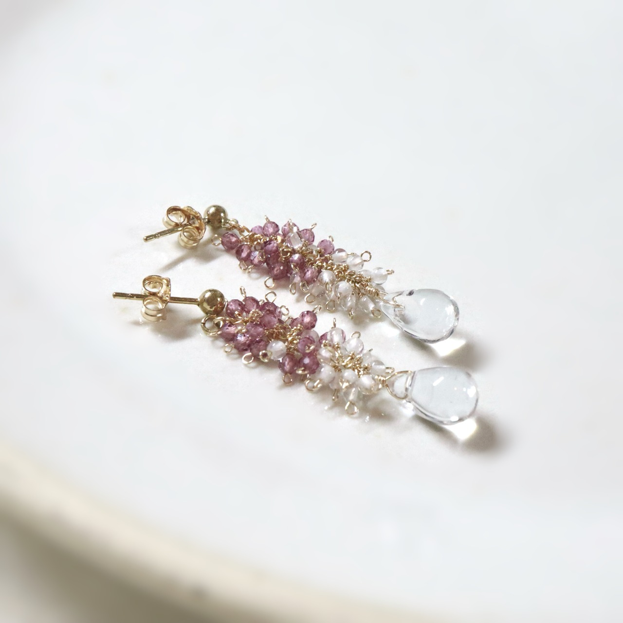 Sea foam drop short earrings/Rhodolite Garnet