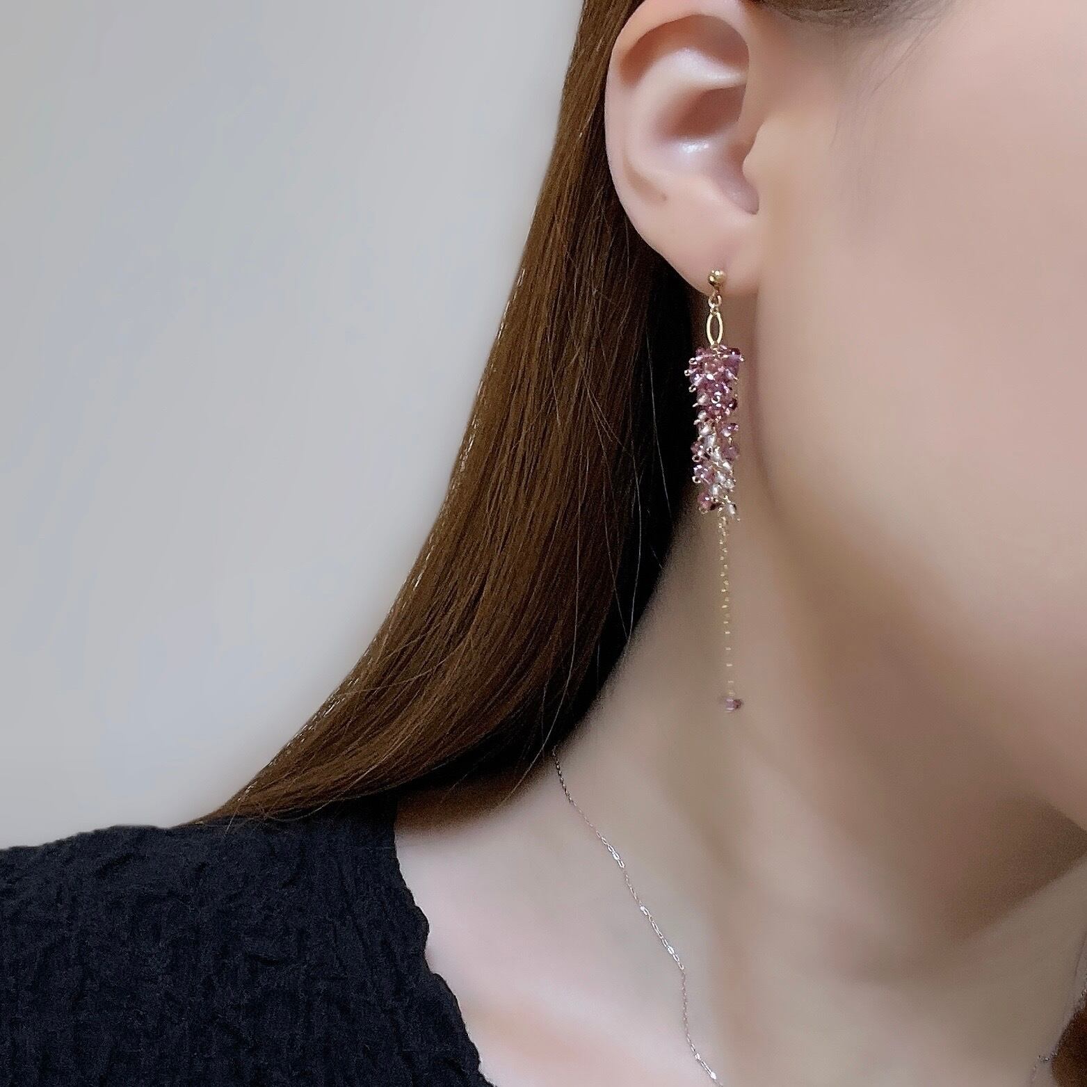 ラインのボトムにあしらった粒が揺れるたびに目を惹き、耳元に印象的な彩りをプラス。