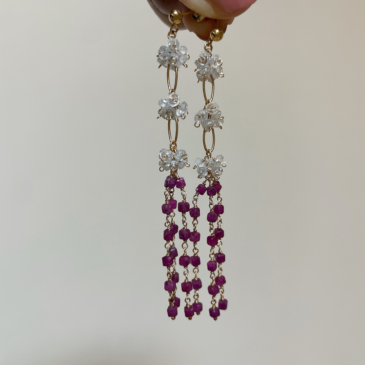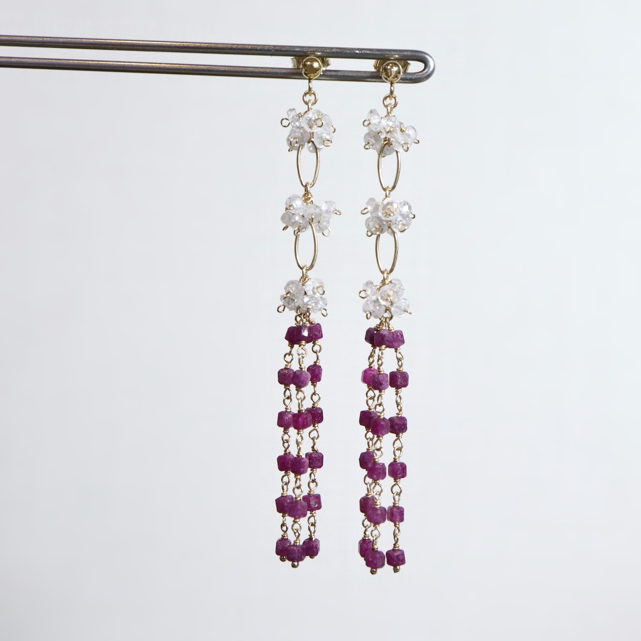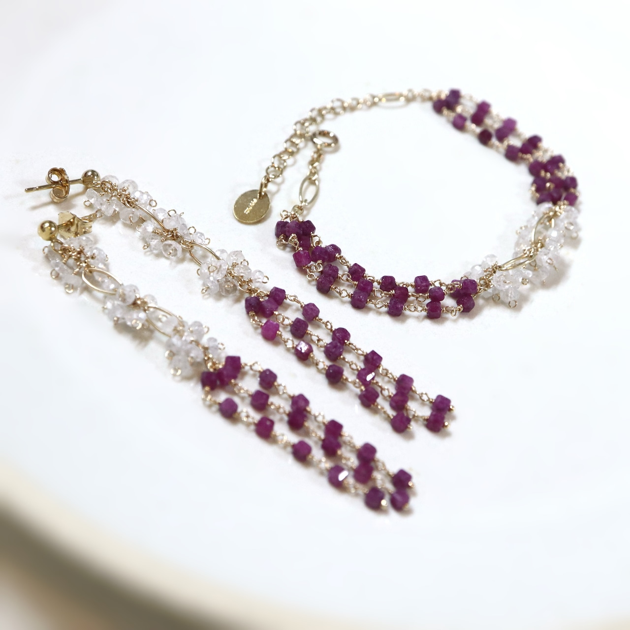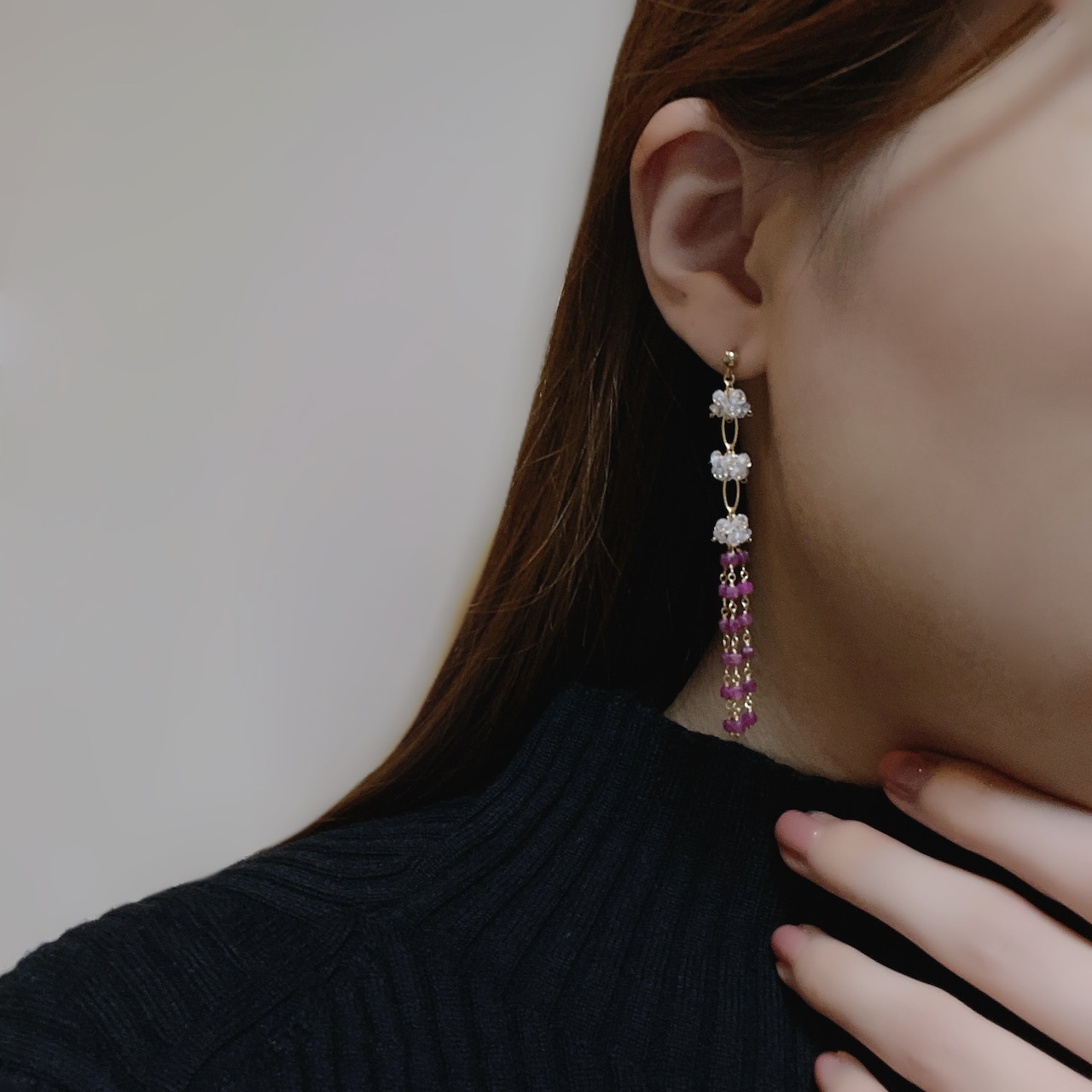 ボトムには極小サイズのキューブカットルビーを贅沢に連ね、女性らしい華やぎと、動くたびにしなやかに揺れる立体的なレイヤードスタイルに仕上げました。