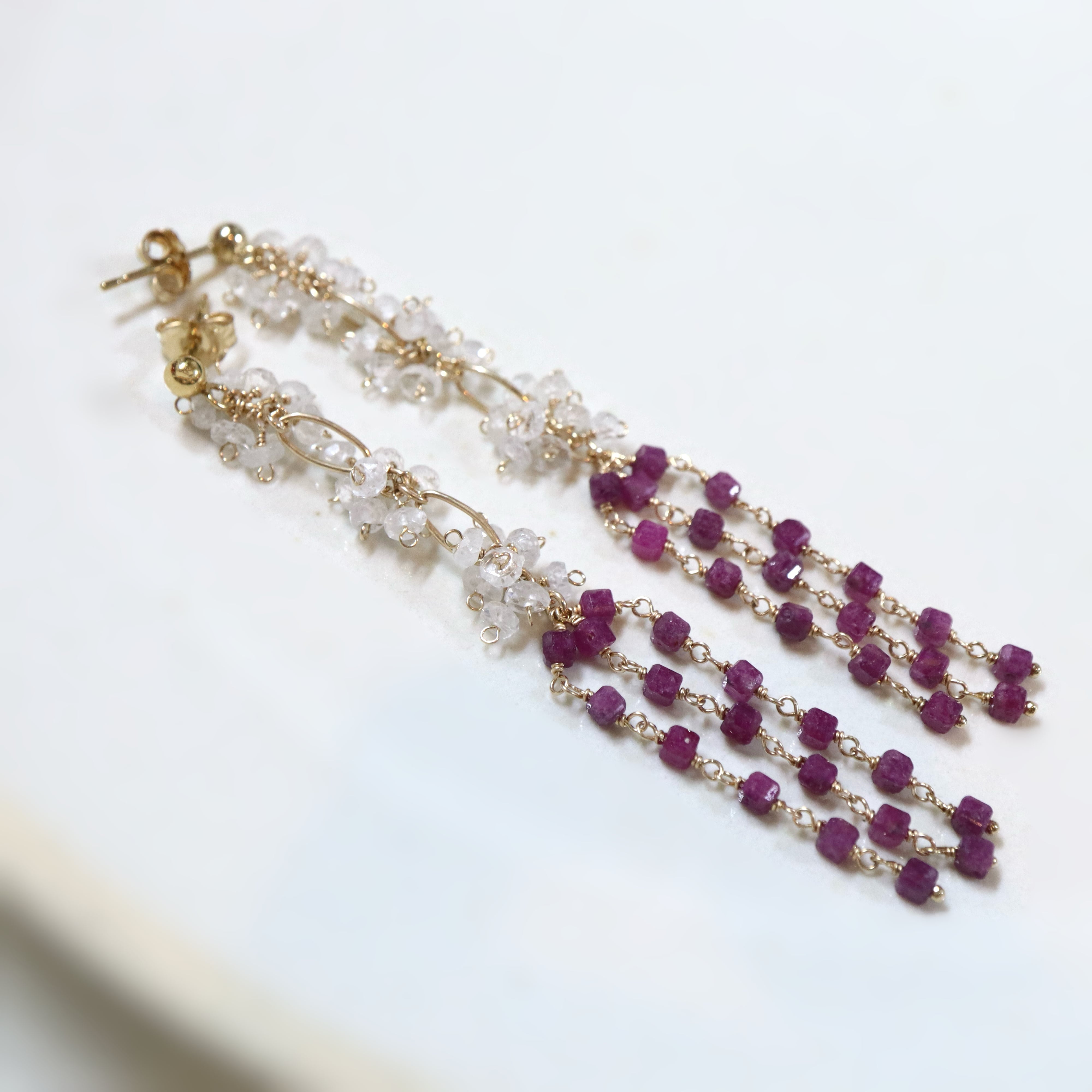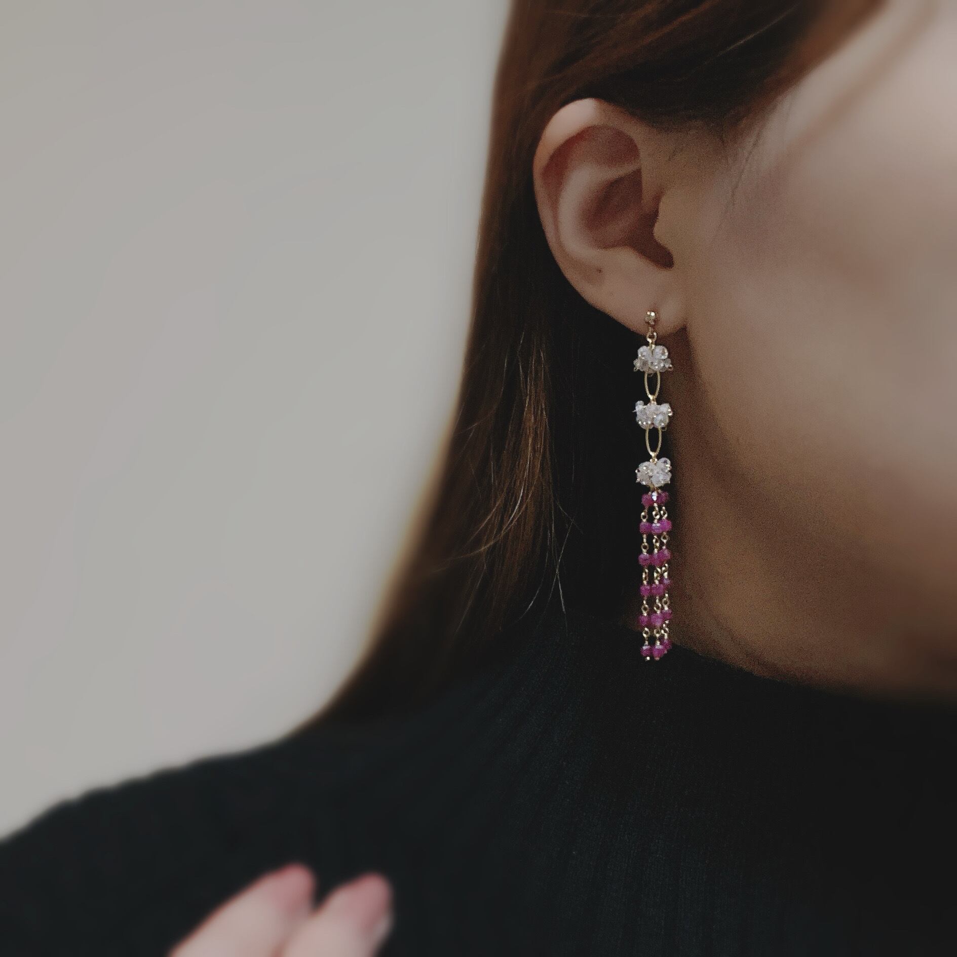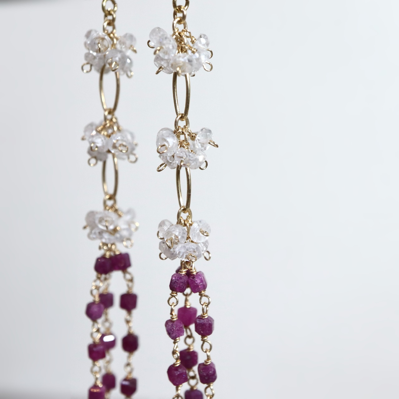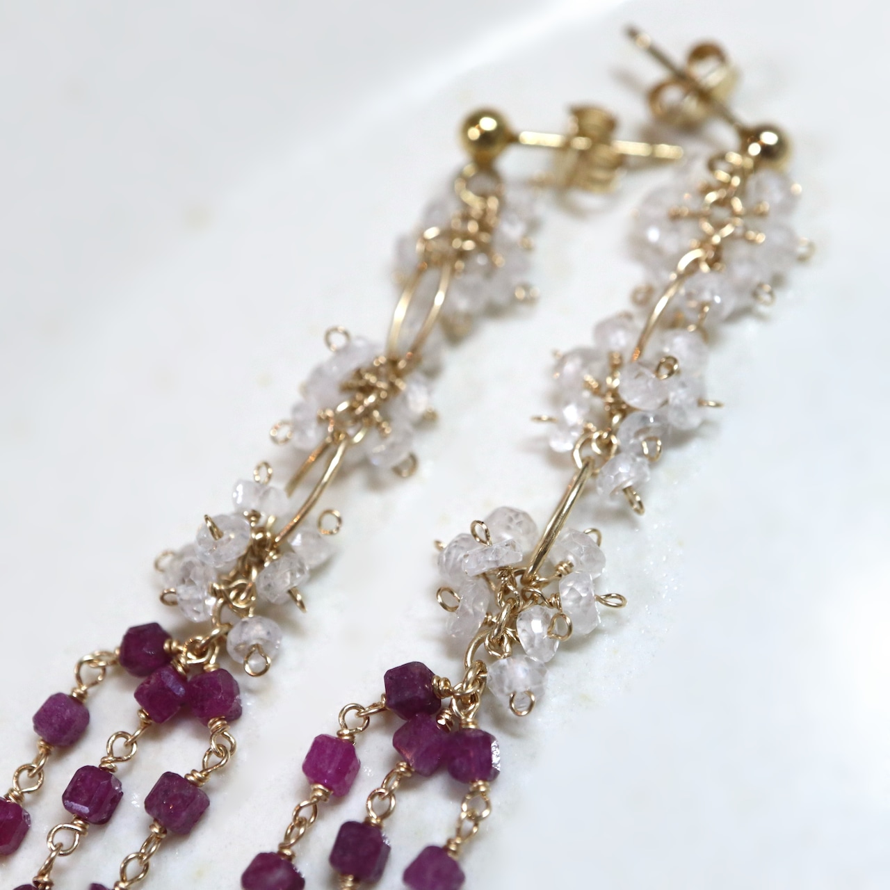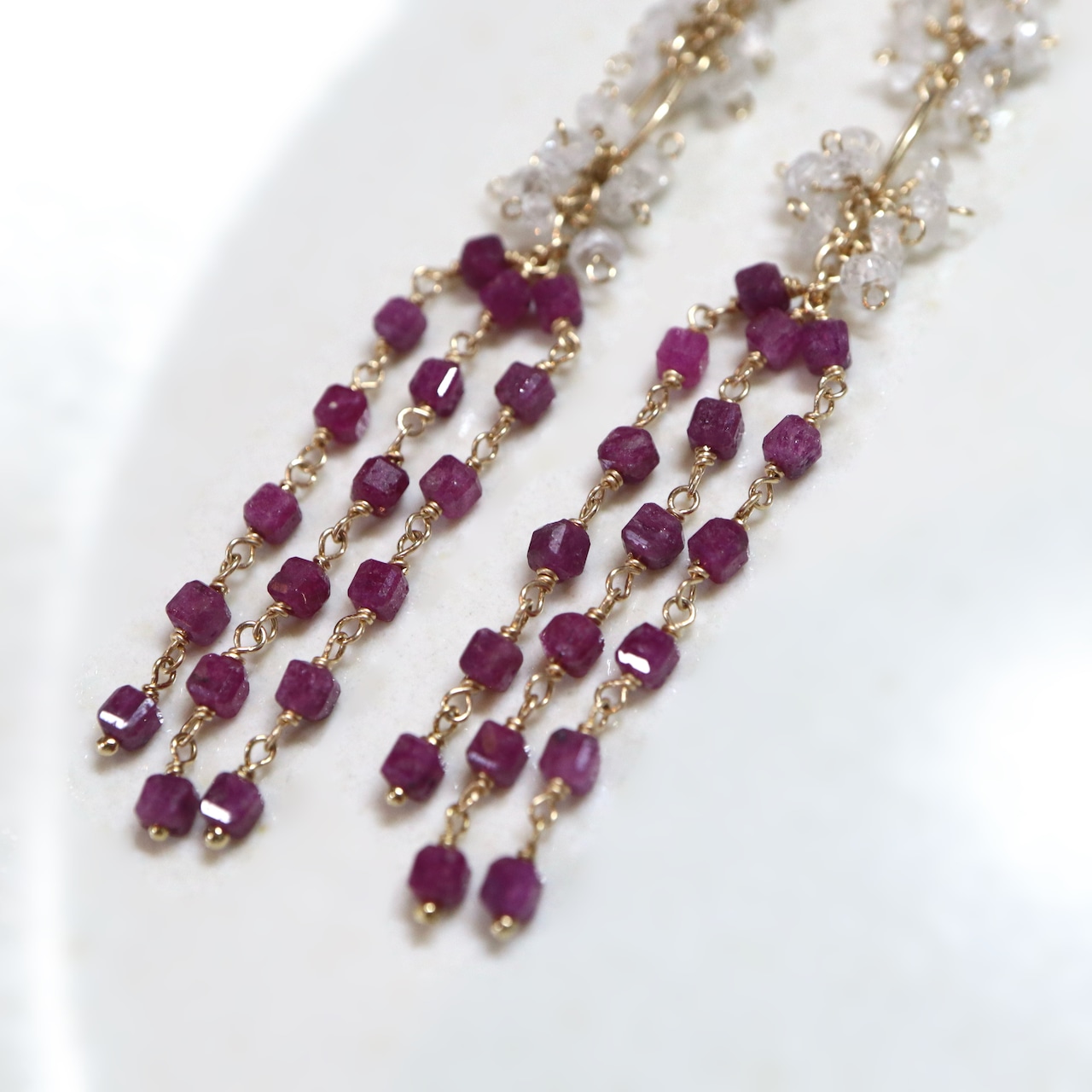ボトムには極小サイズのキューブカットルビーを贅沢に連ね、女性らしい華やぎと、動くたびにしなやかに揺れる立体的なレイヤードスタイルに仕上げました。