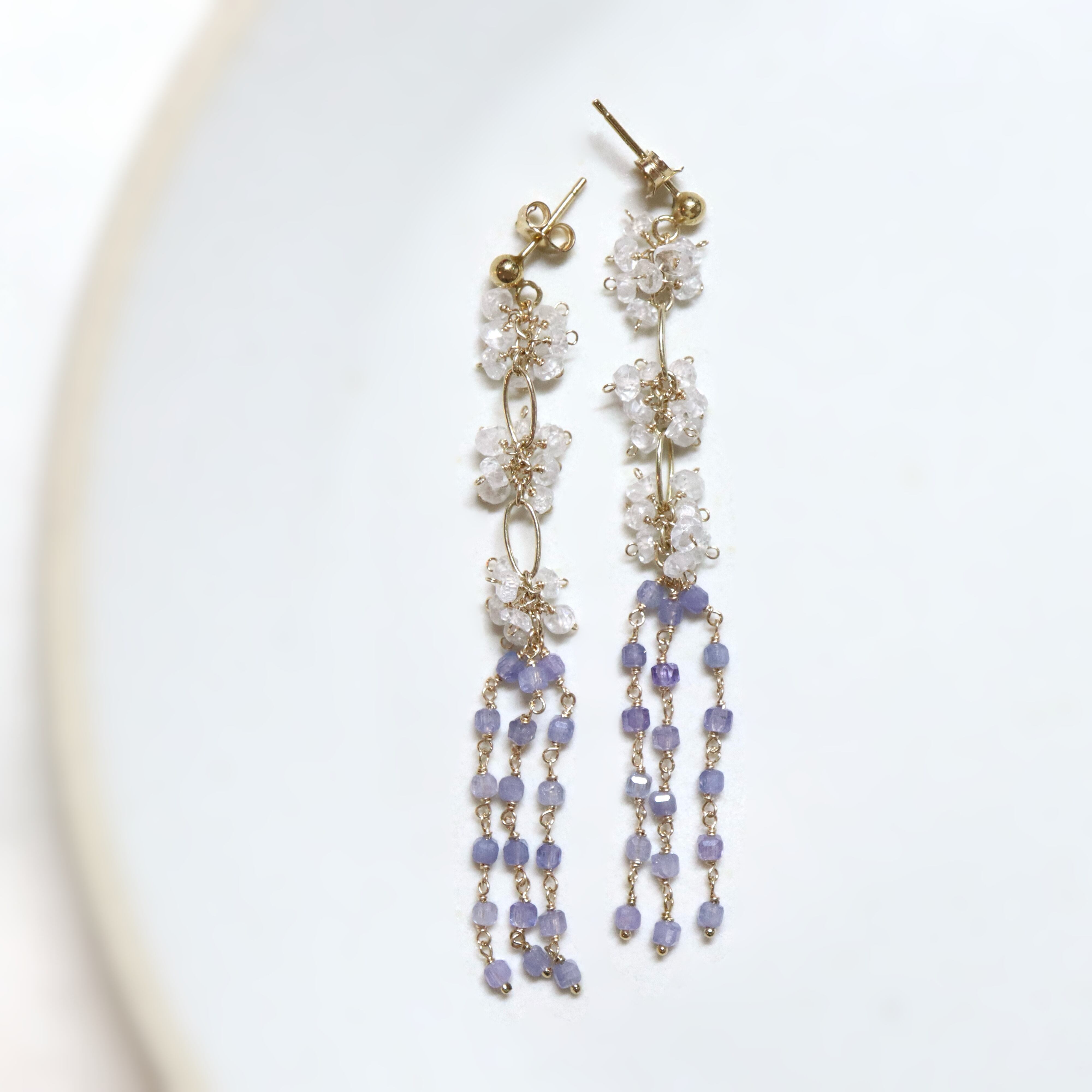 ボトムには極小サイズのキューブカットタンザナイトを贅沢に連ね、女性らしい華やぎと、動くたびにしなやかに揺れる立体的なレイヤードスタイルに仕上げました。