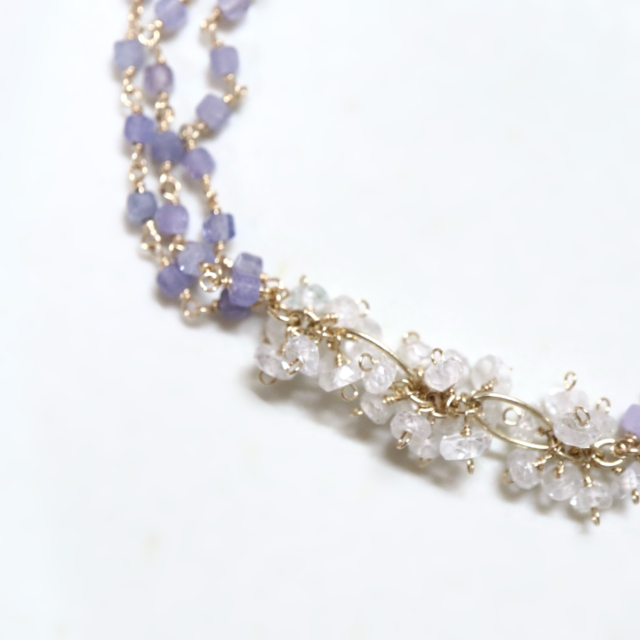 その両サイドには極小サイズのキューブカットタンザナイトを連ね、女性らしい華やぎと立体感を持たせたレイヤードスタイルに仕上げました。