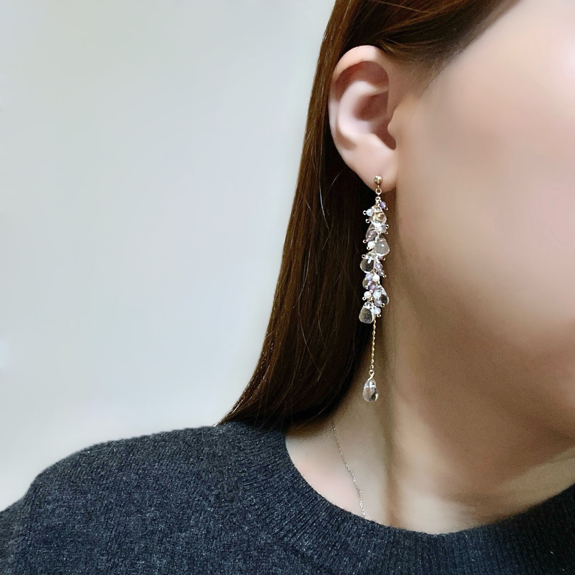 ボトムで揺れるクリスタルが、顔まわりを可憐な印象に。