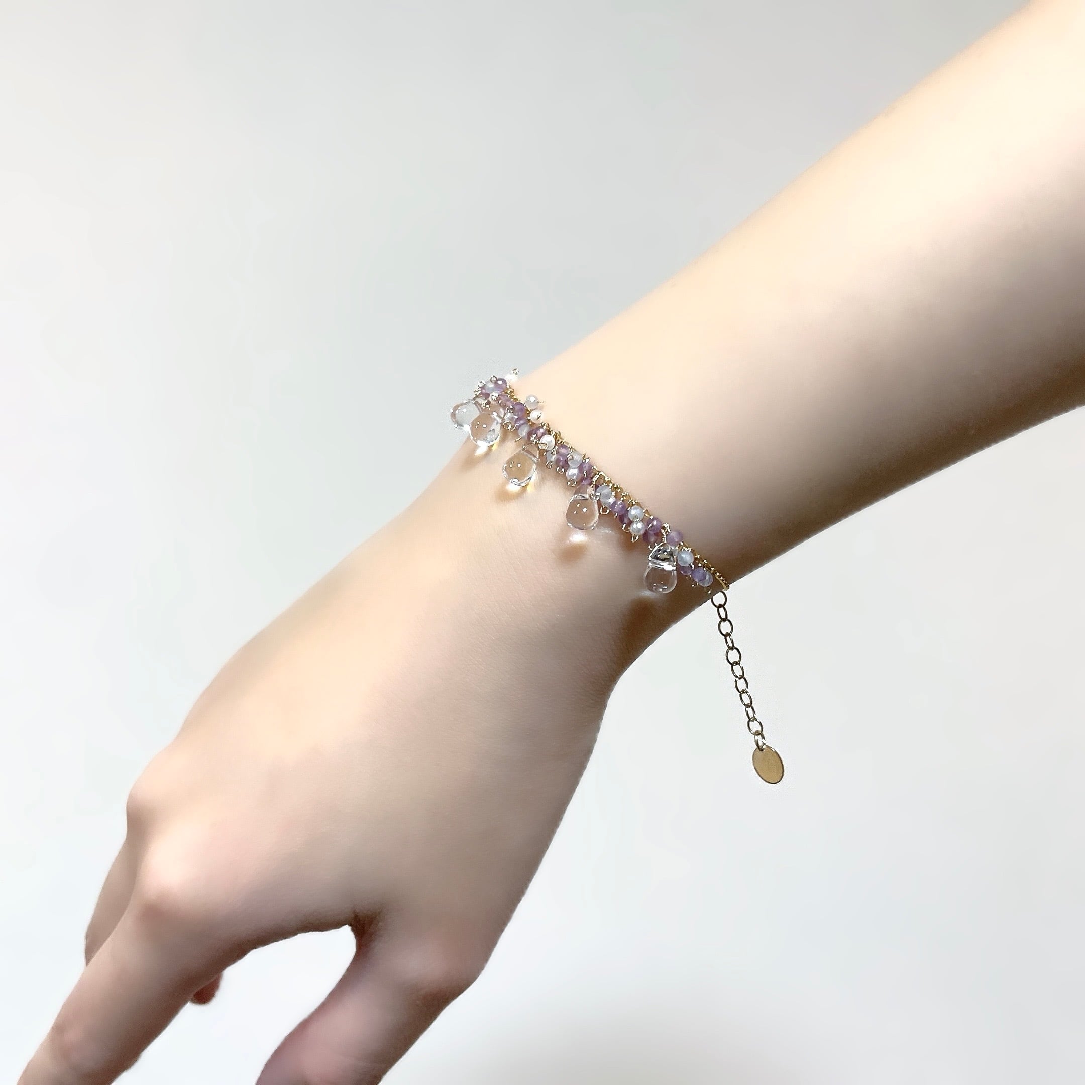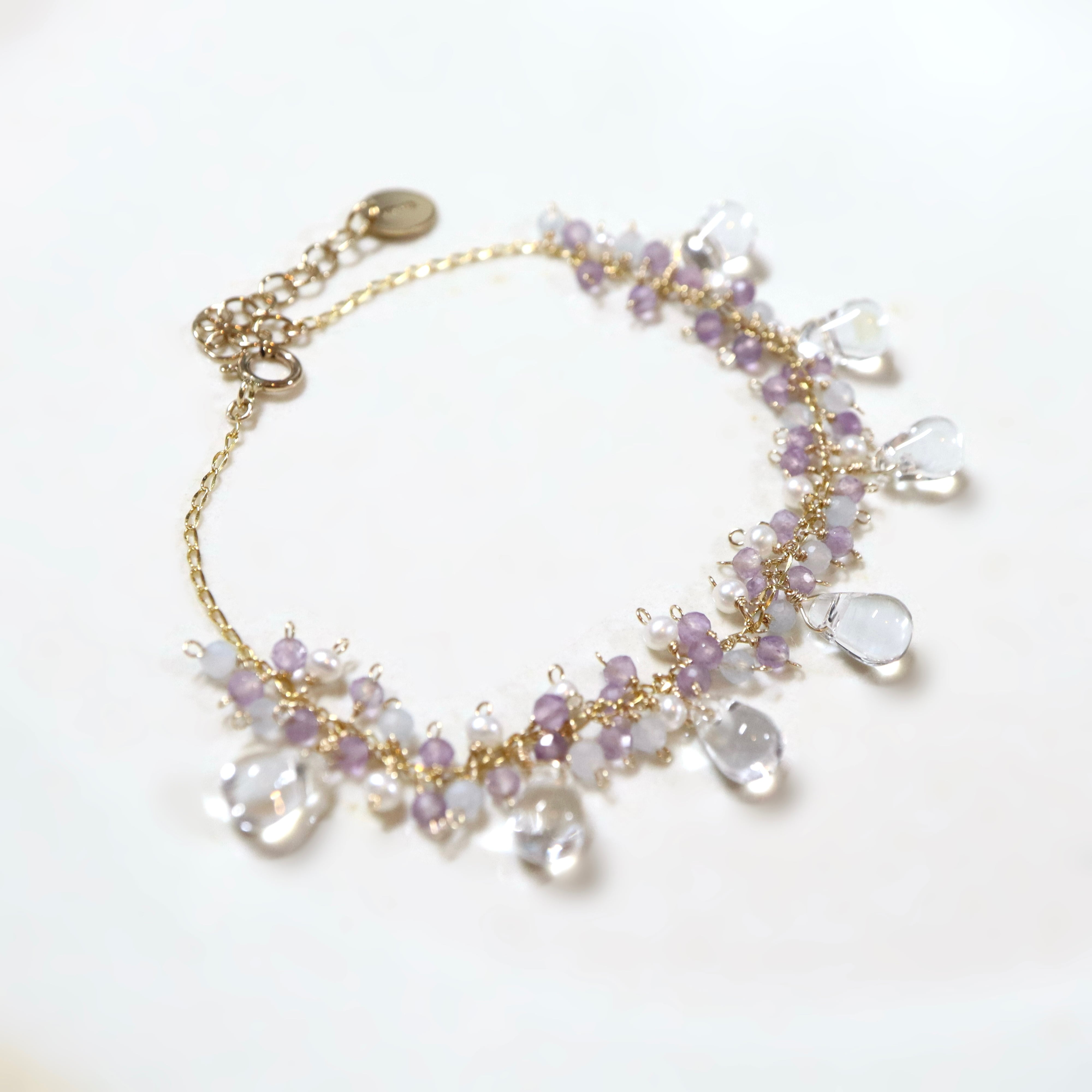 ピンクアメジストとグレイッシュブルージェードの優しく可愛らしい色彩に、淡水パールを添えて、手元をやわらかく彩る落ち着いたトーンに仕上げました。
