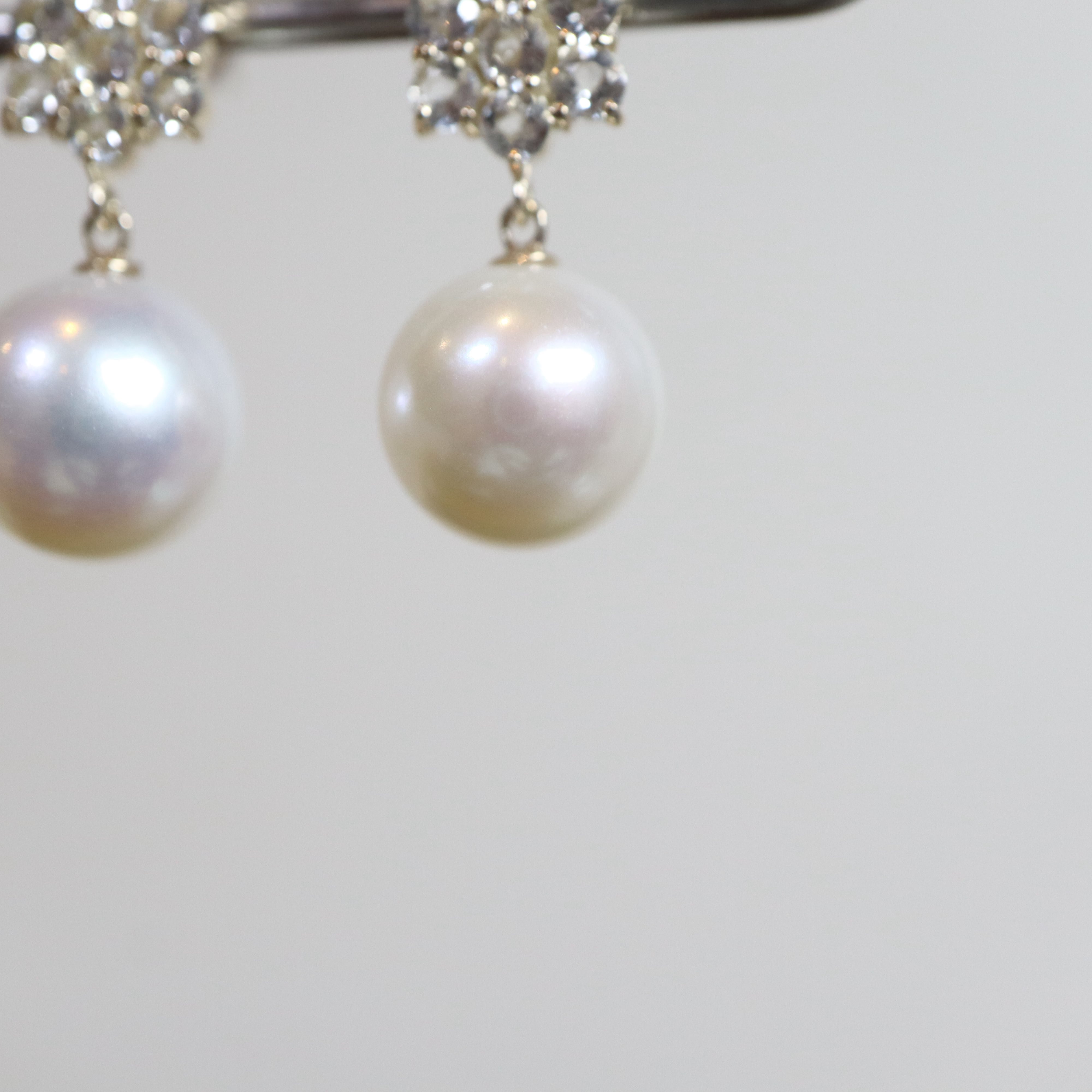 ホワイトトパーズと淡水パールの品質とサイズ感にこだわり、上品さと華やかさを兼ね備えたフォルムに仕上げました。