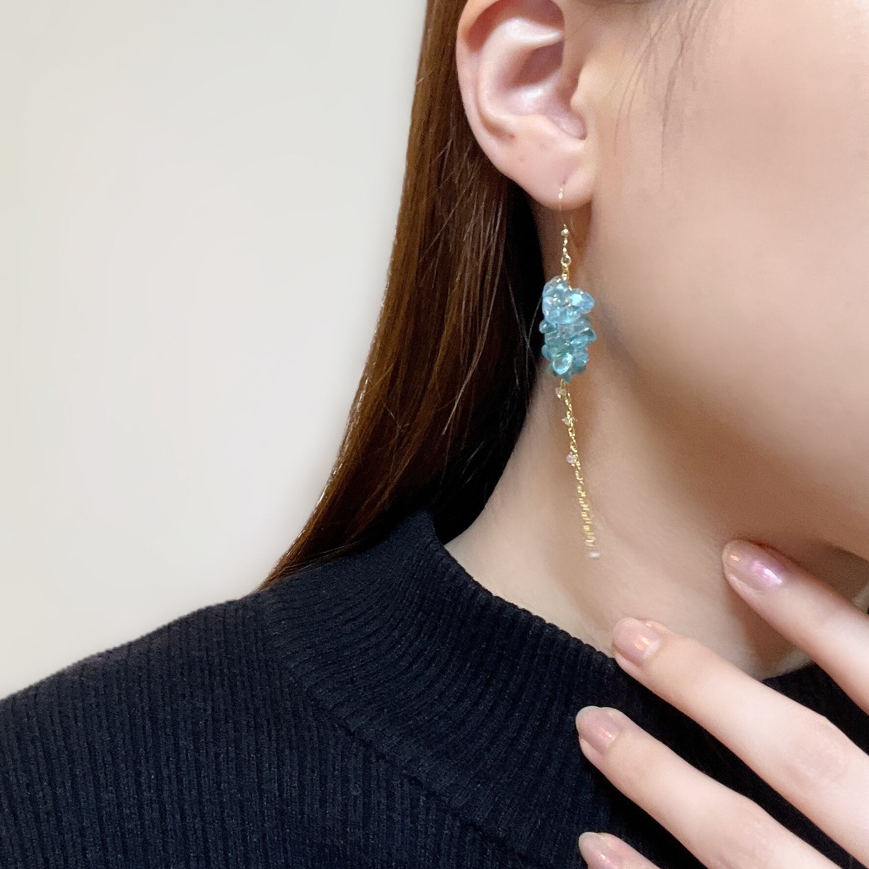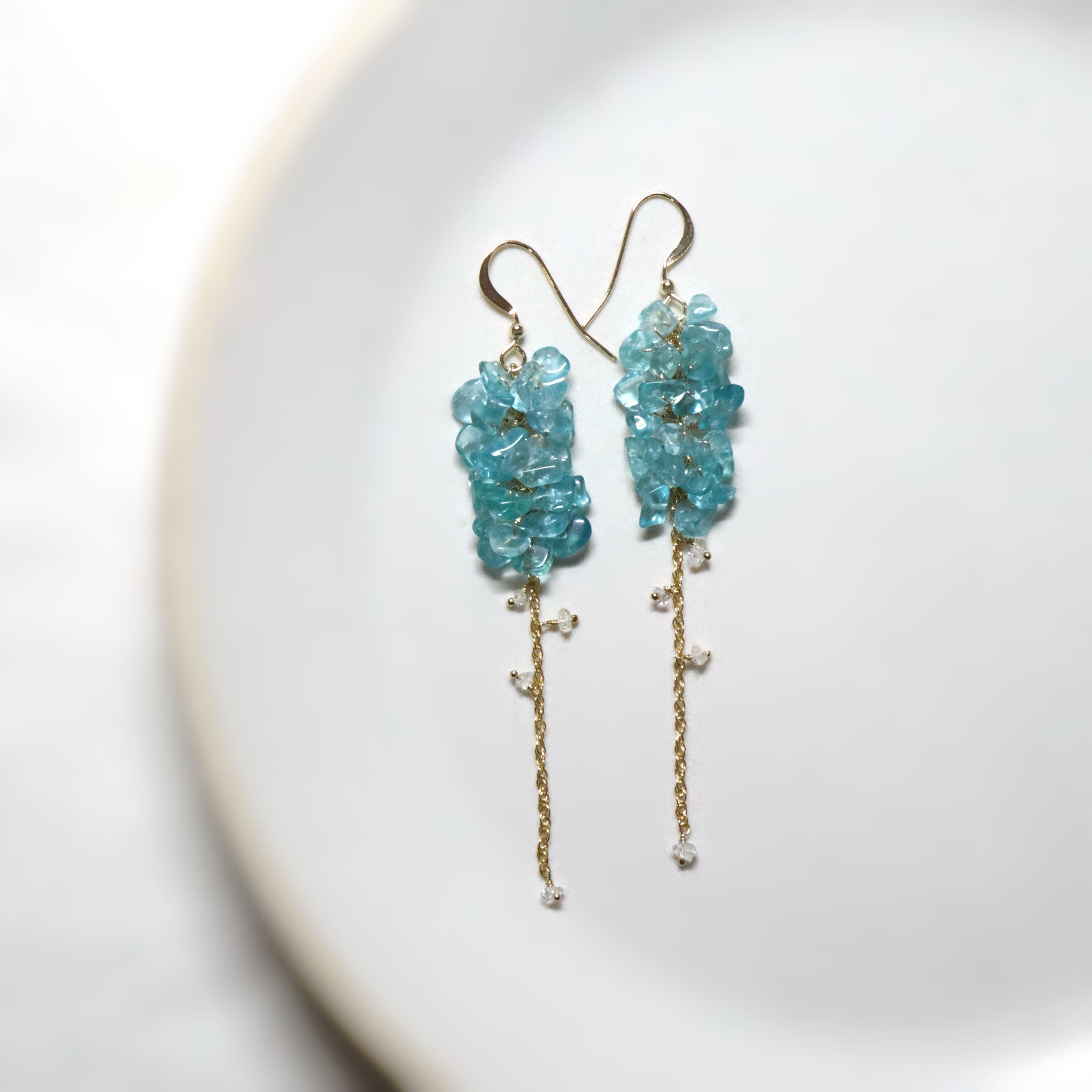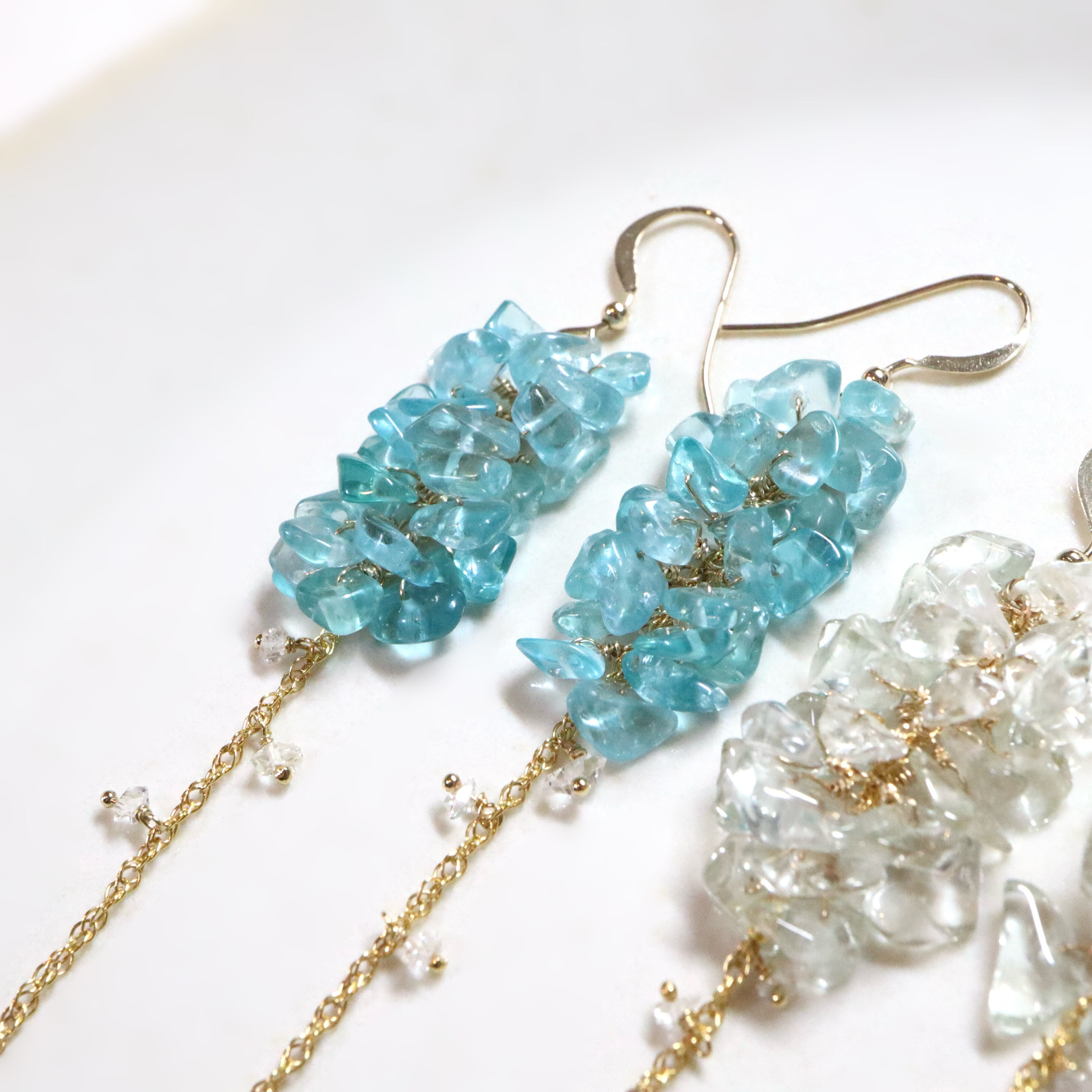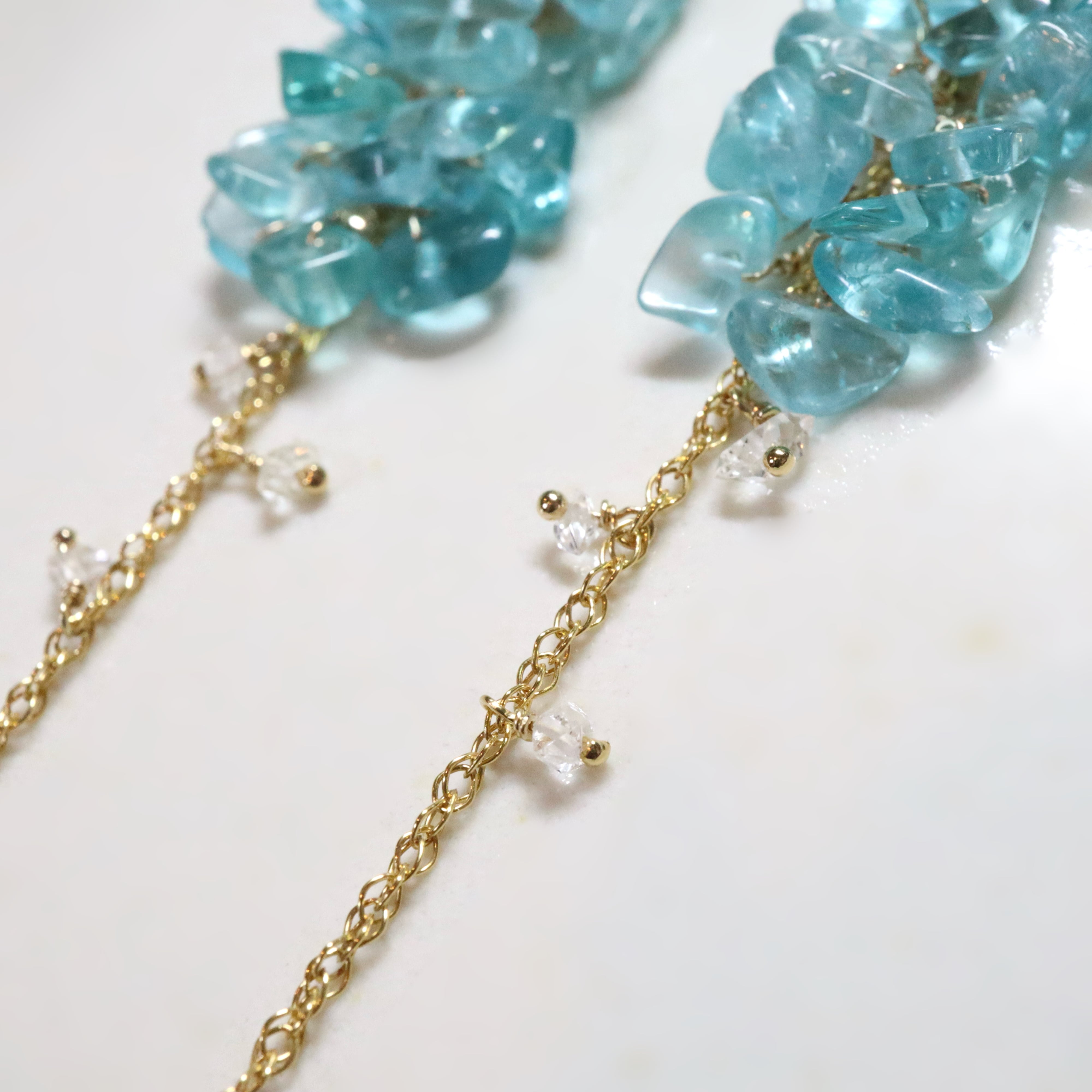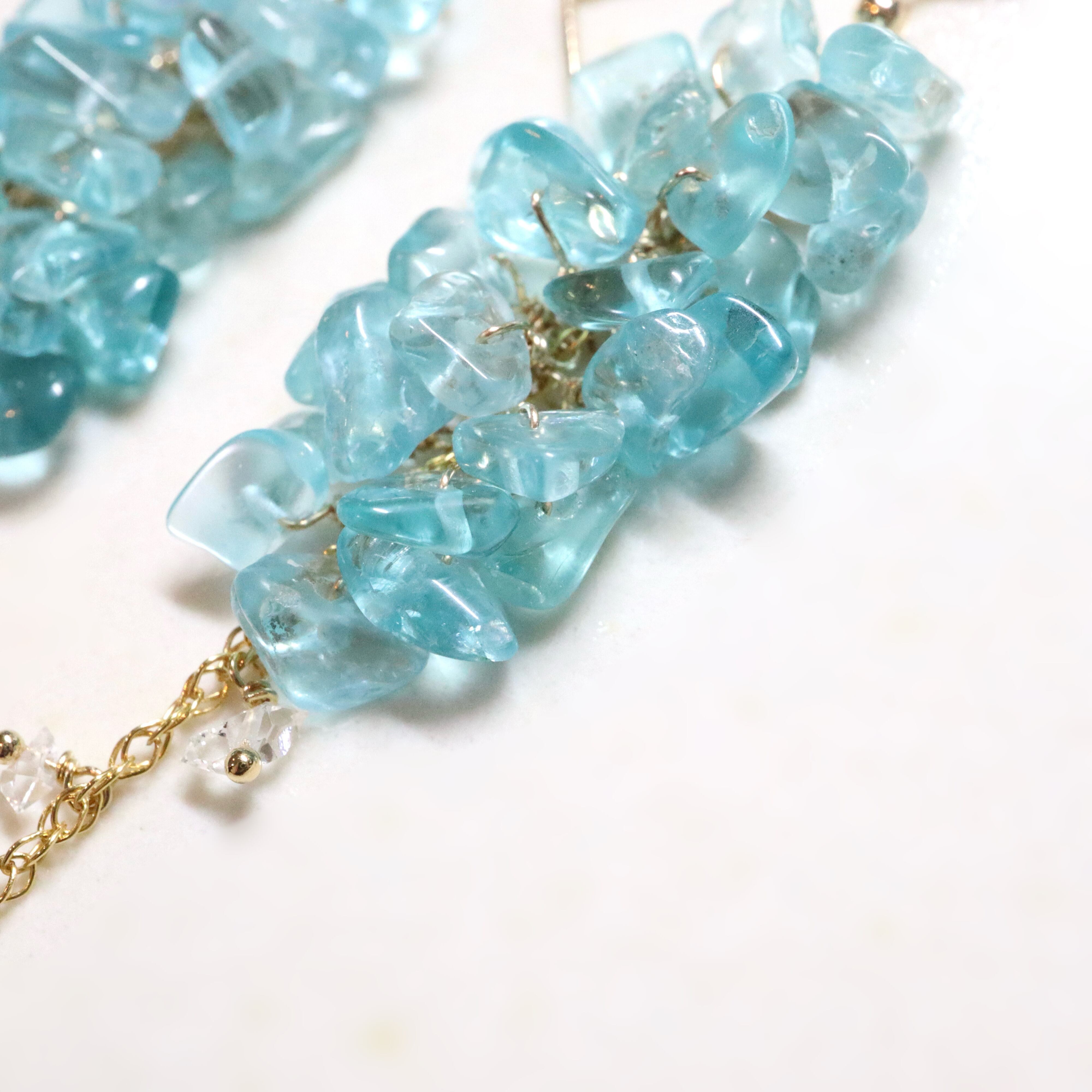鮮やかなネオンブルーが印象的なブルーアパタイトのチップをたっぷりと使用し、小花が連なったようなふわりとしたシルエットに。