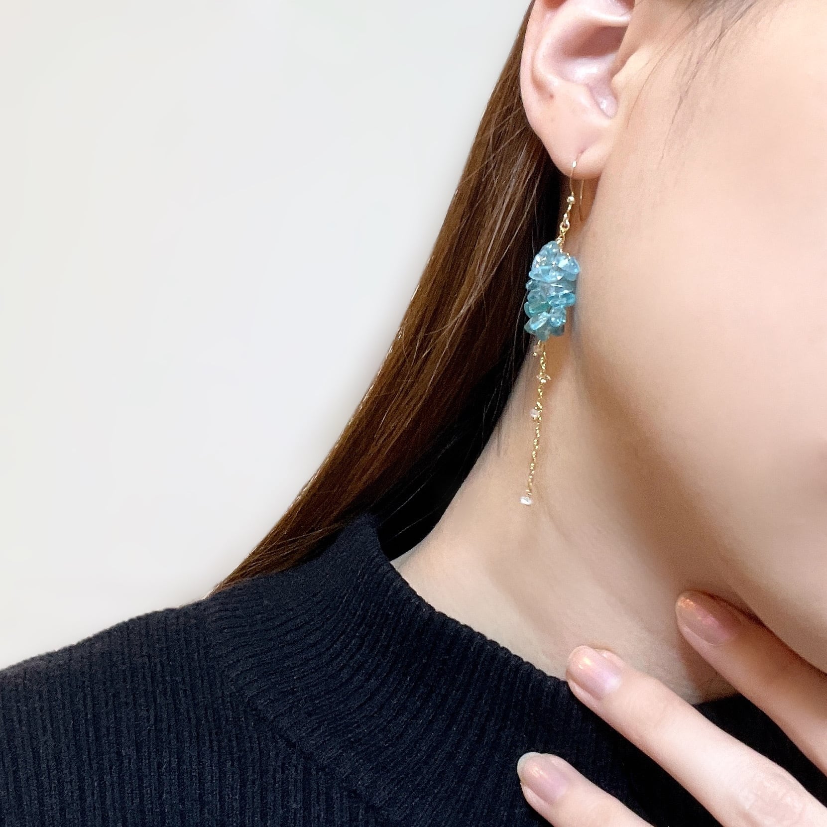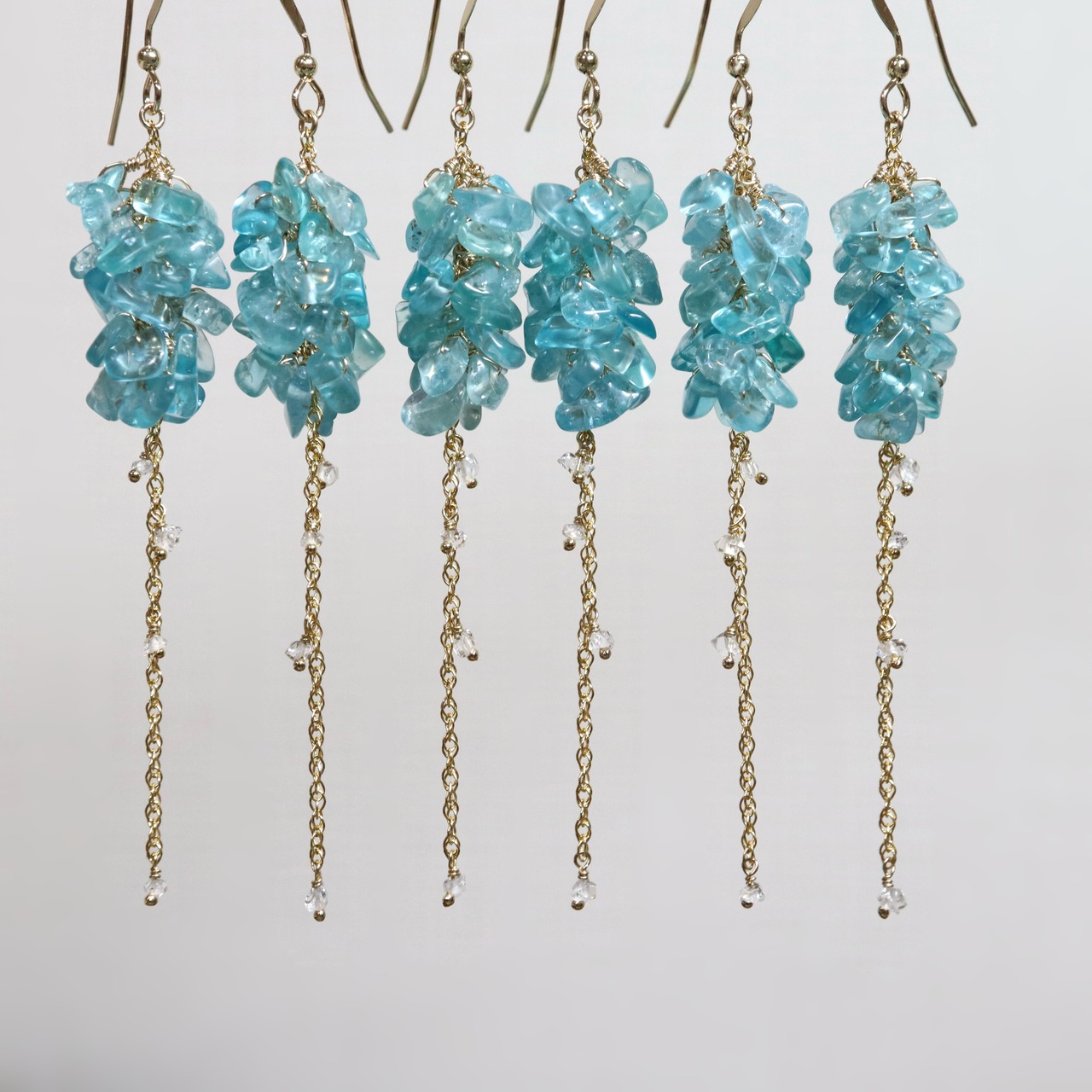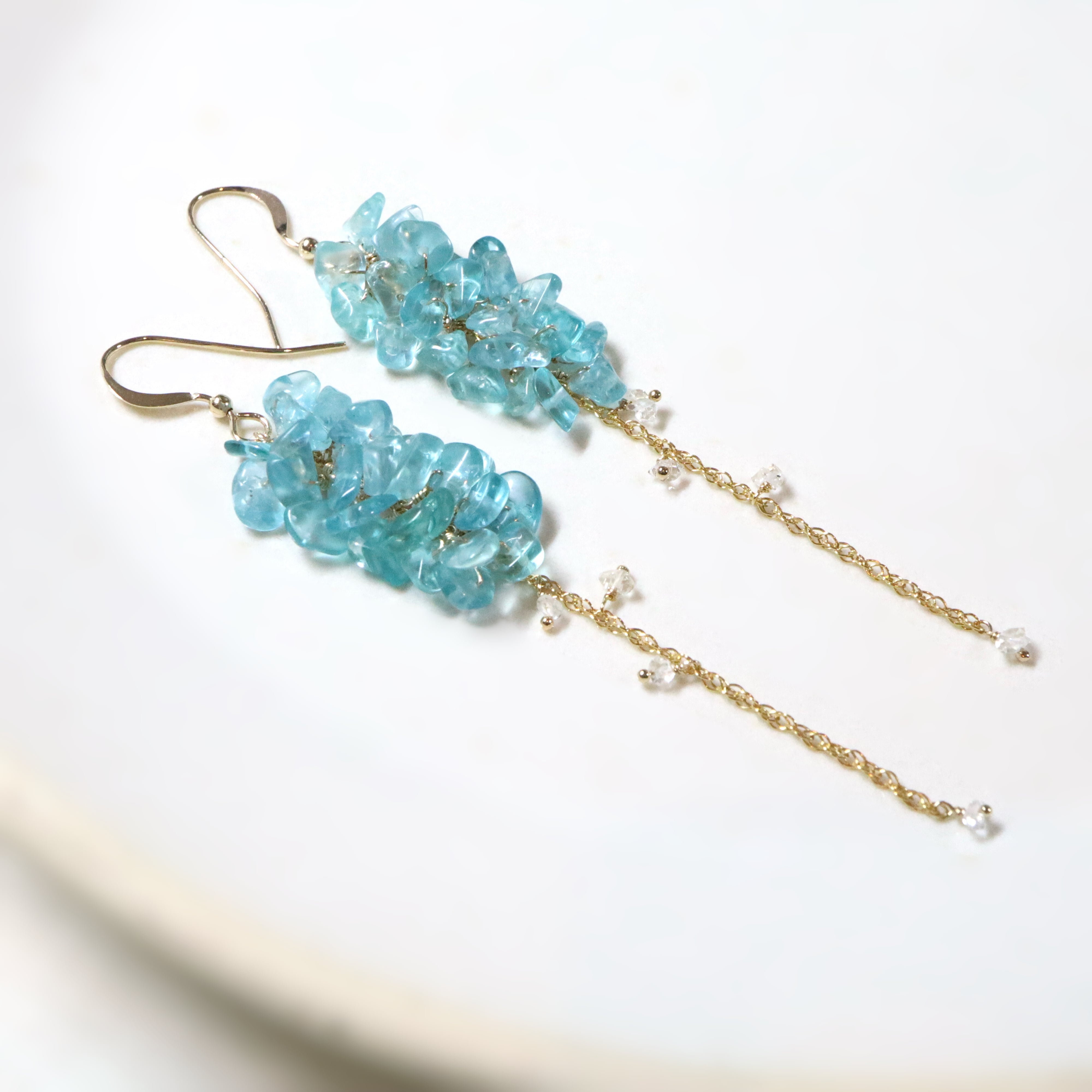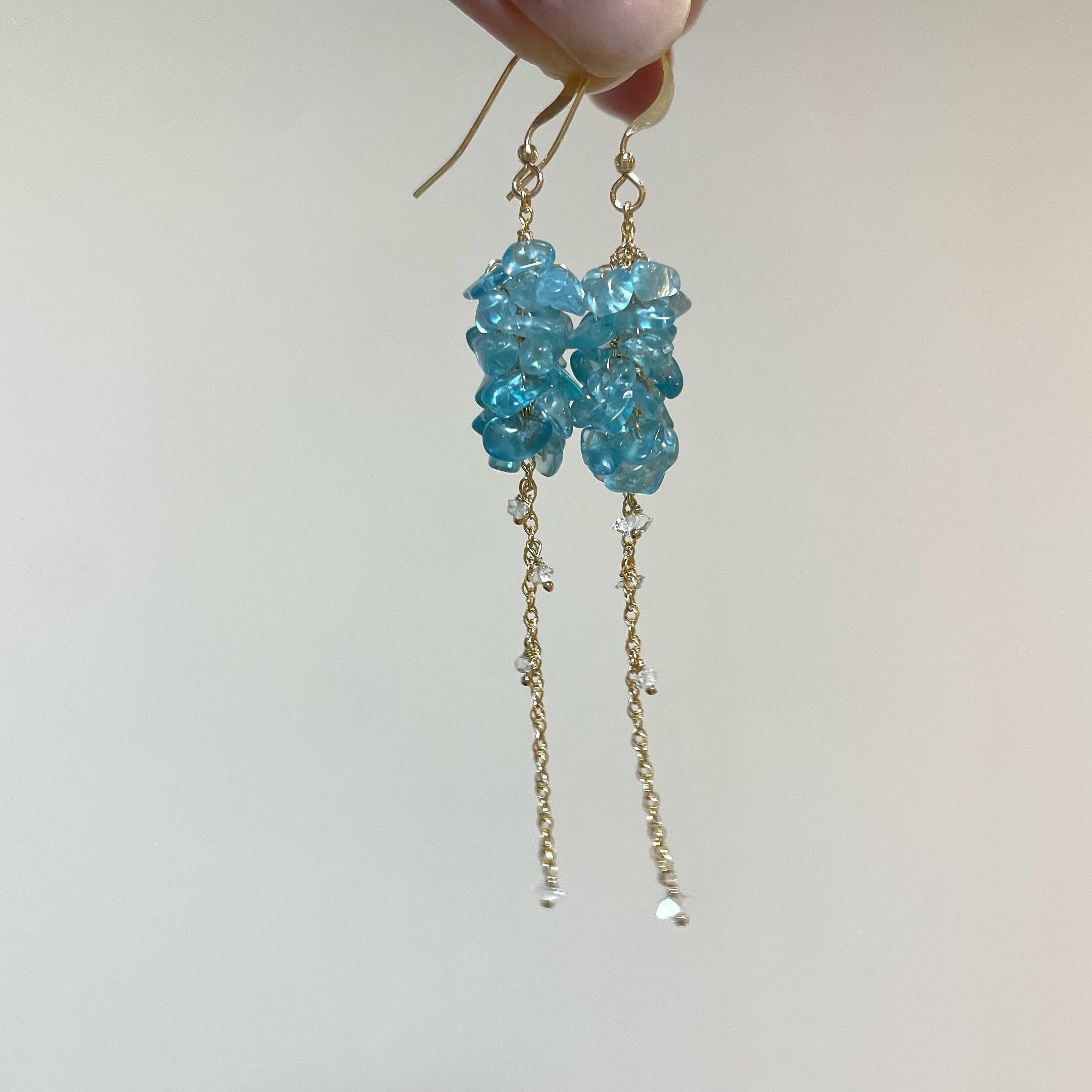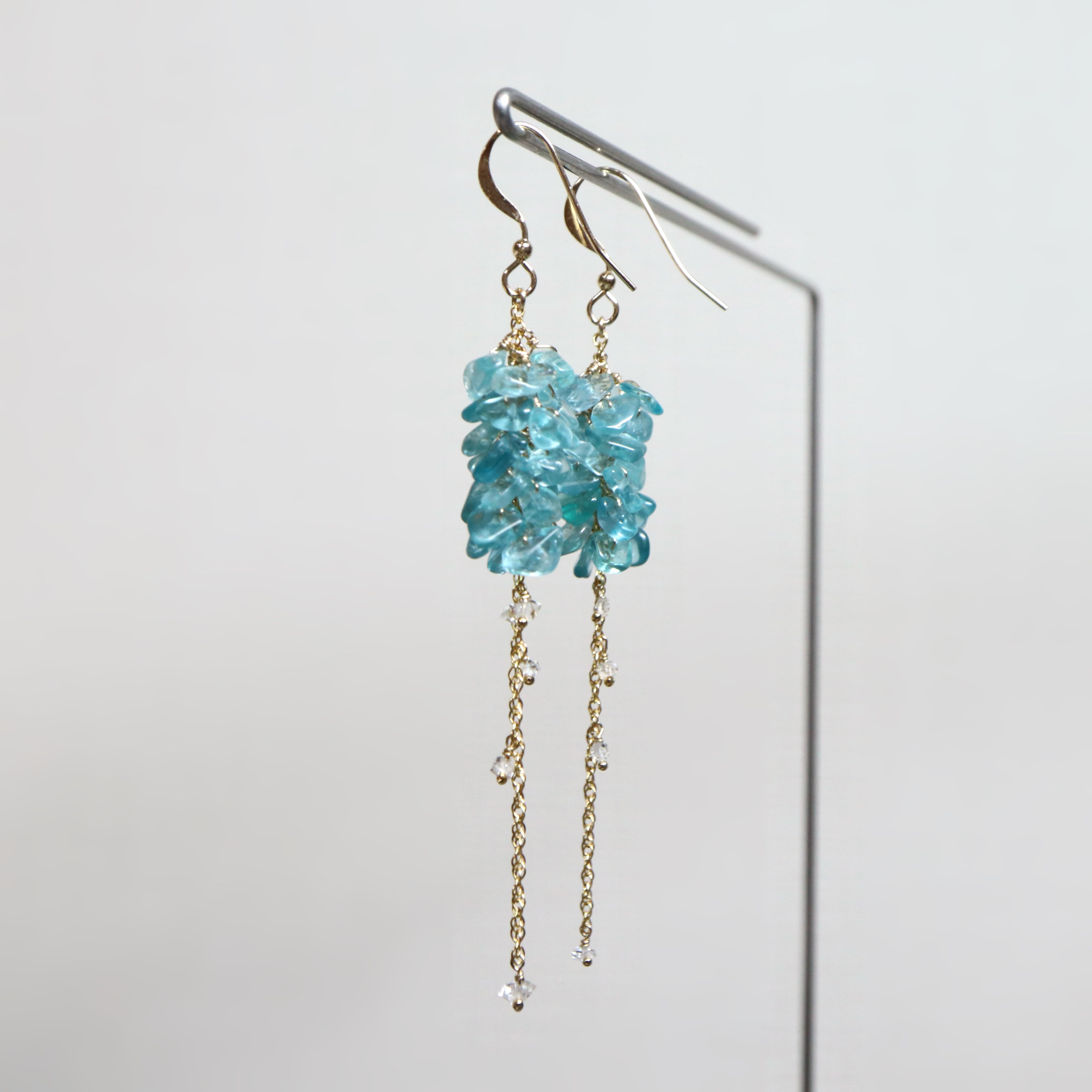鮮やかなネオンブルーが印象的なブルーアパタイトのチップをたっぷりと使用し、小花が連なったようなふわりとしたシルエットに。