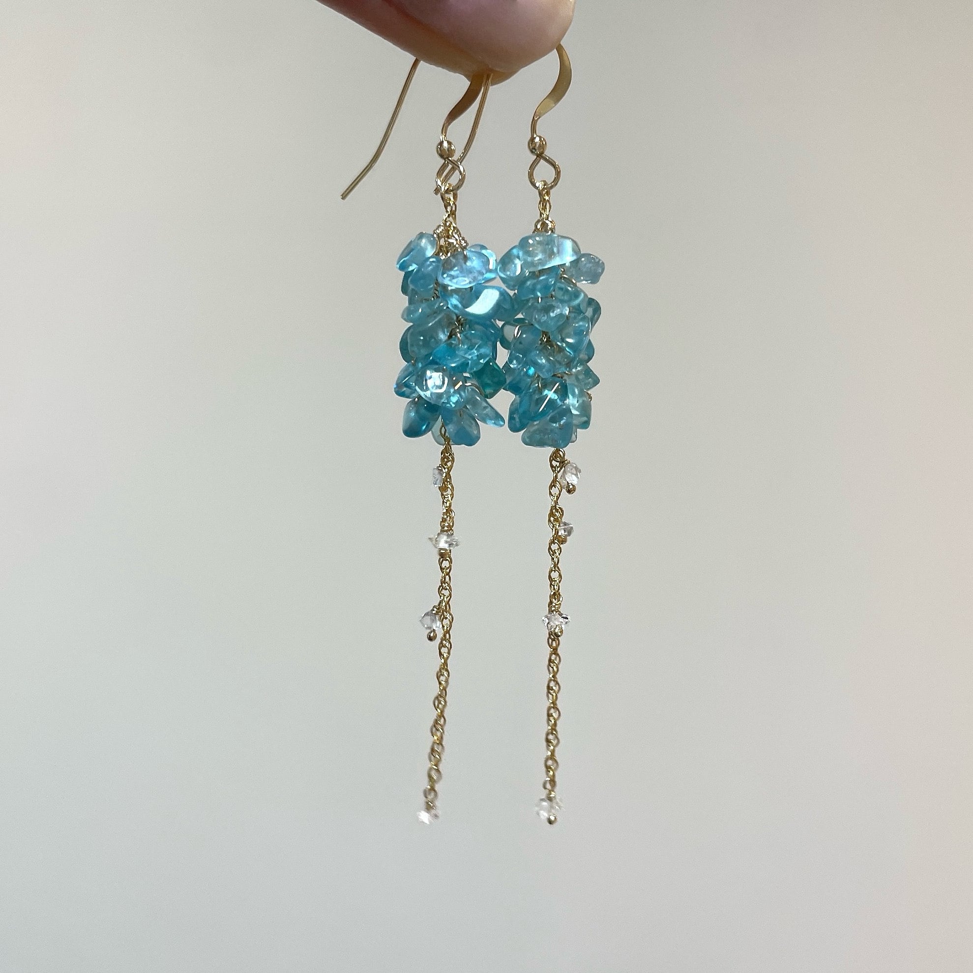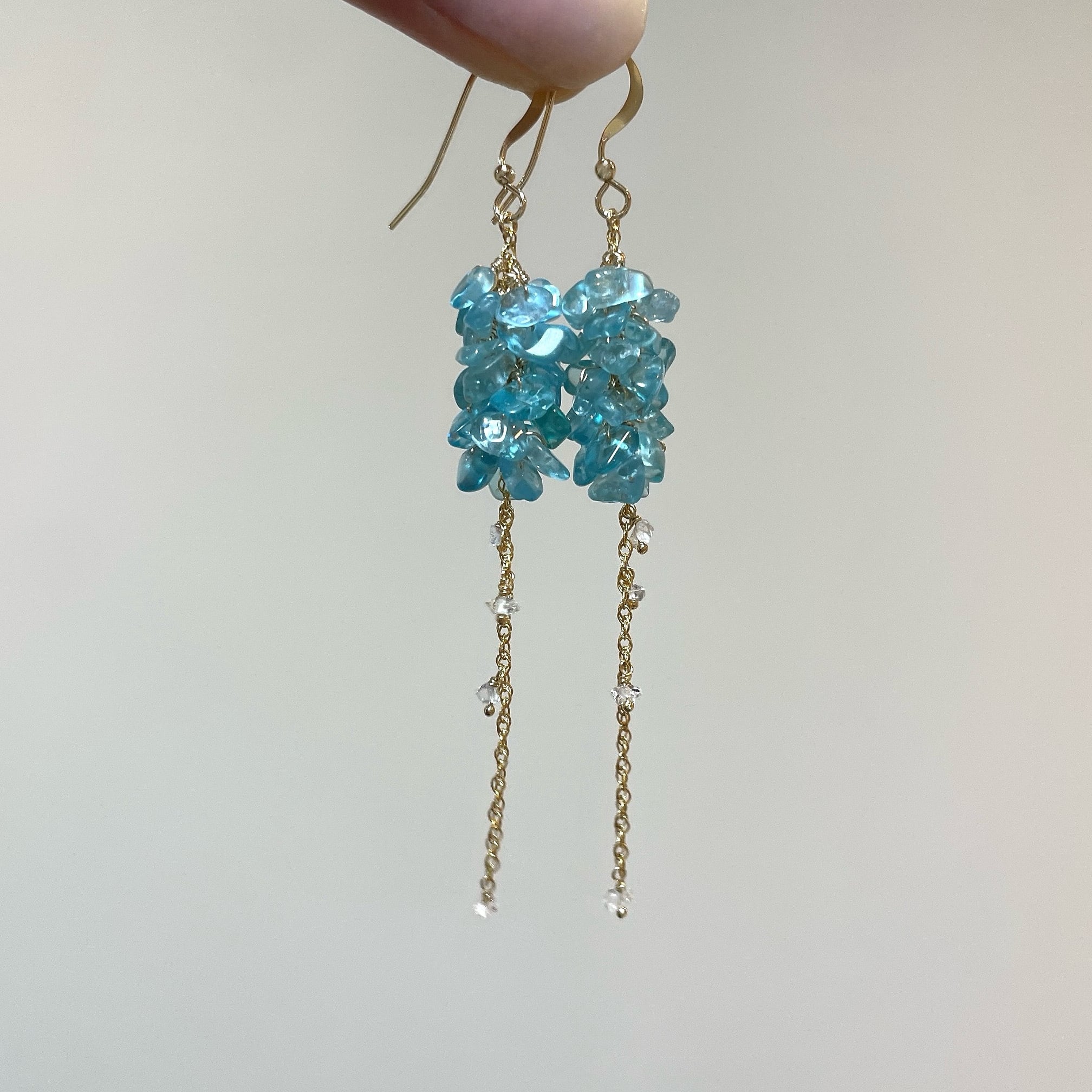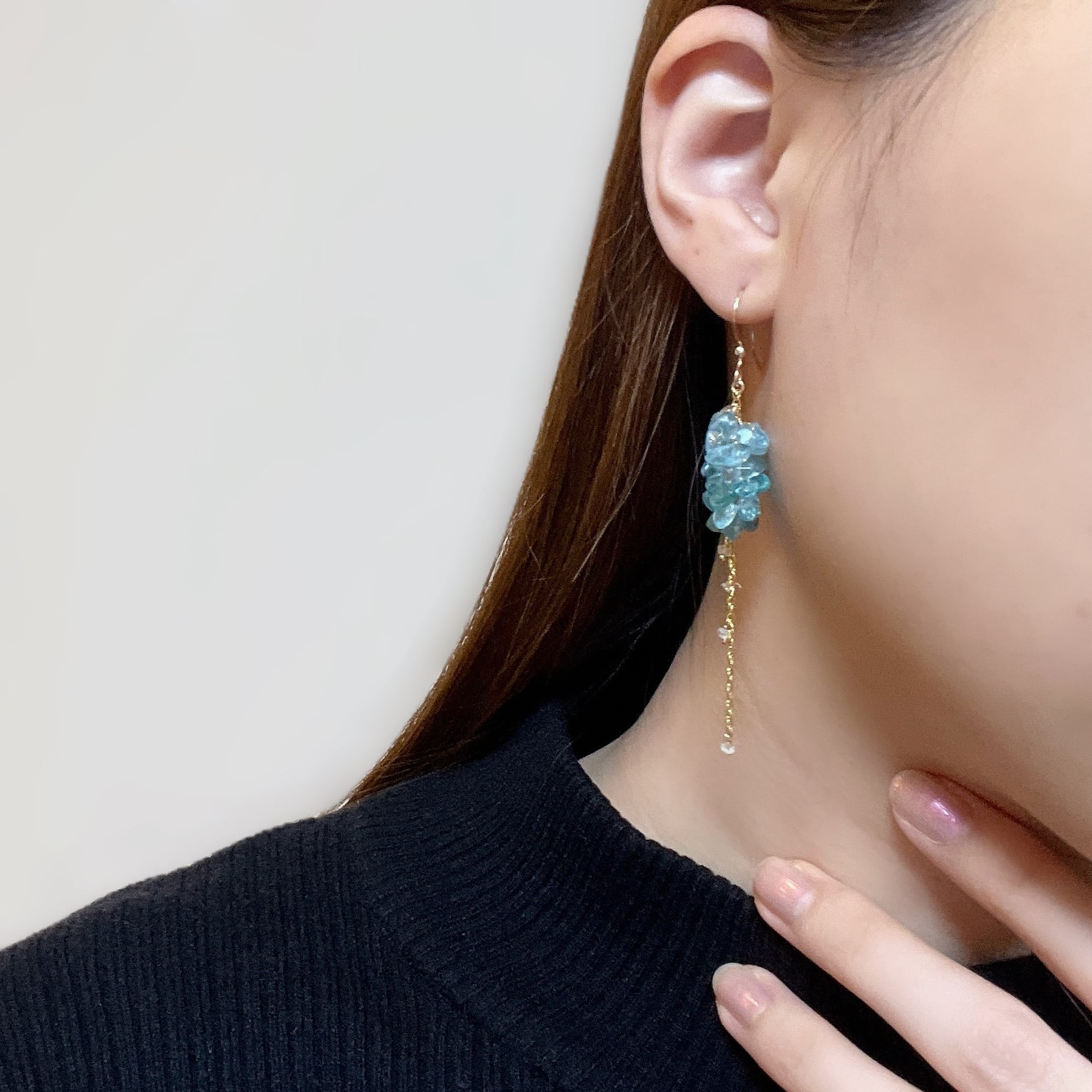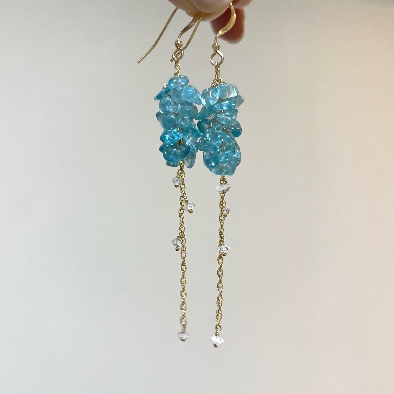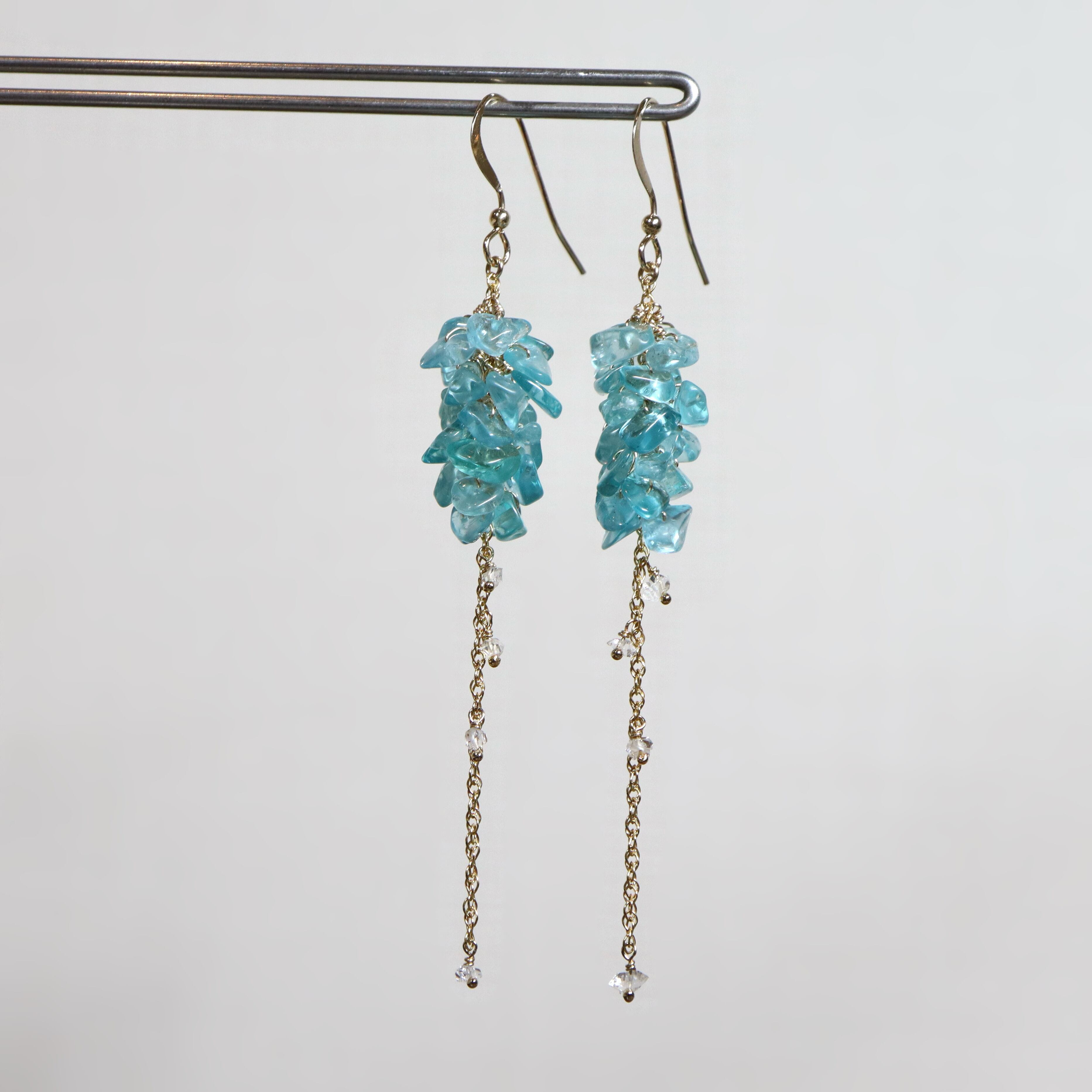 鮮やかなネオンブルーが印象的なブルーアパタイトのチップをたっぷりと使用し、小花が連なったようなふわりとしたシルエットに。