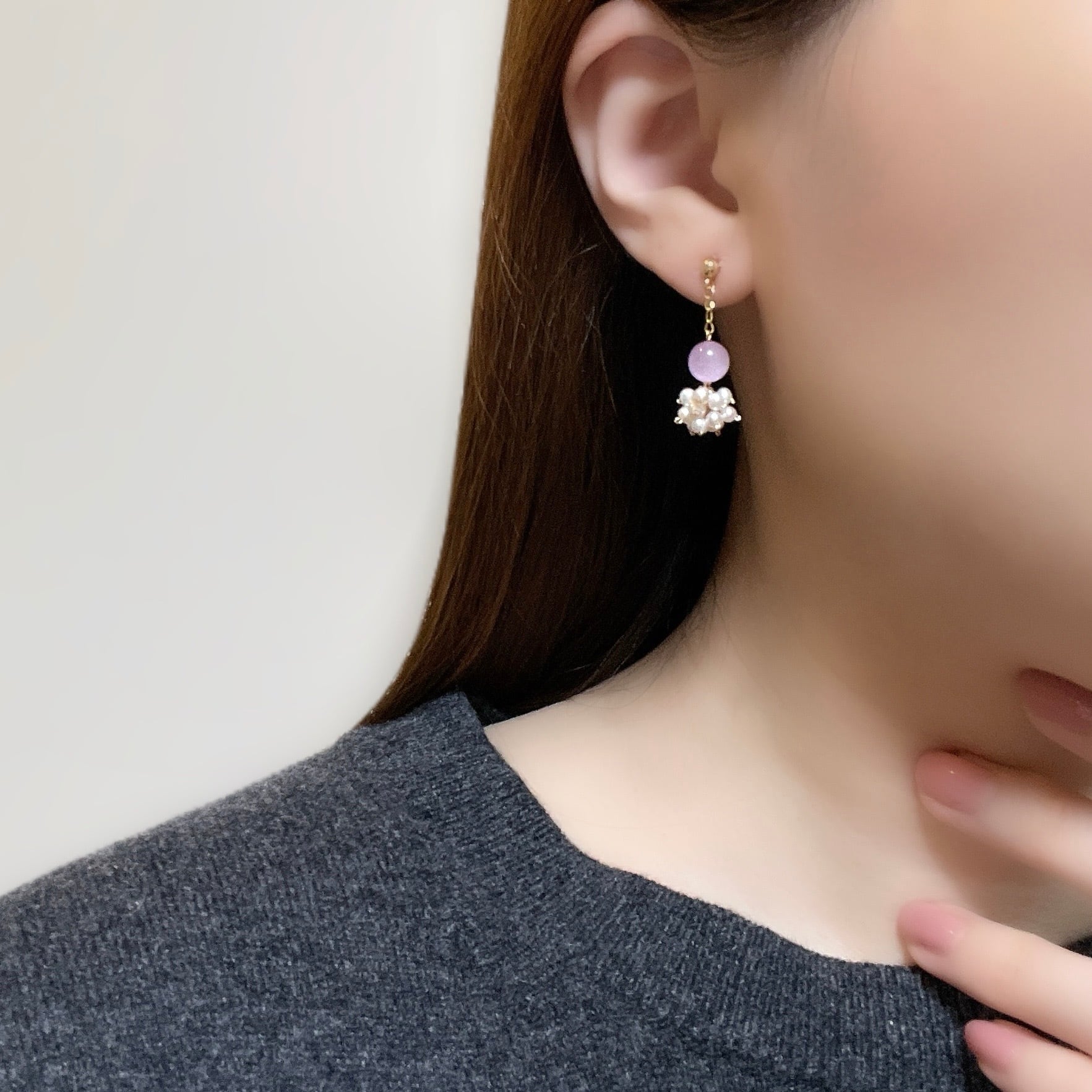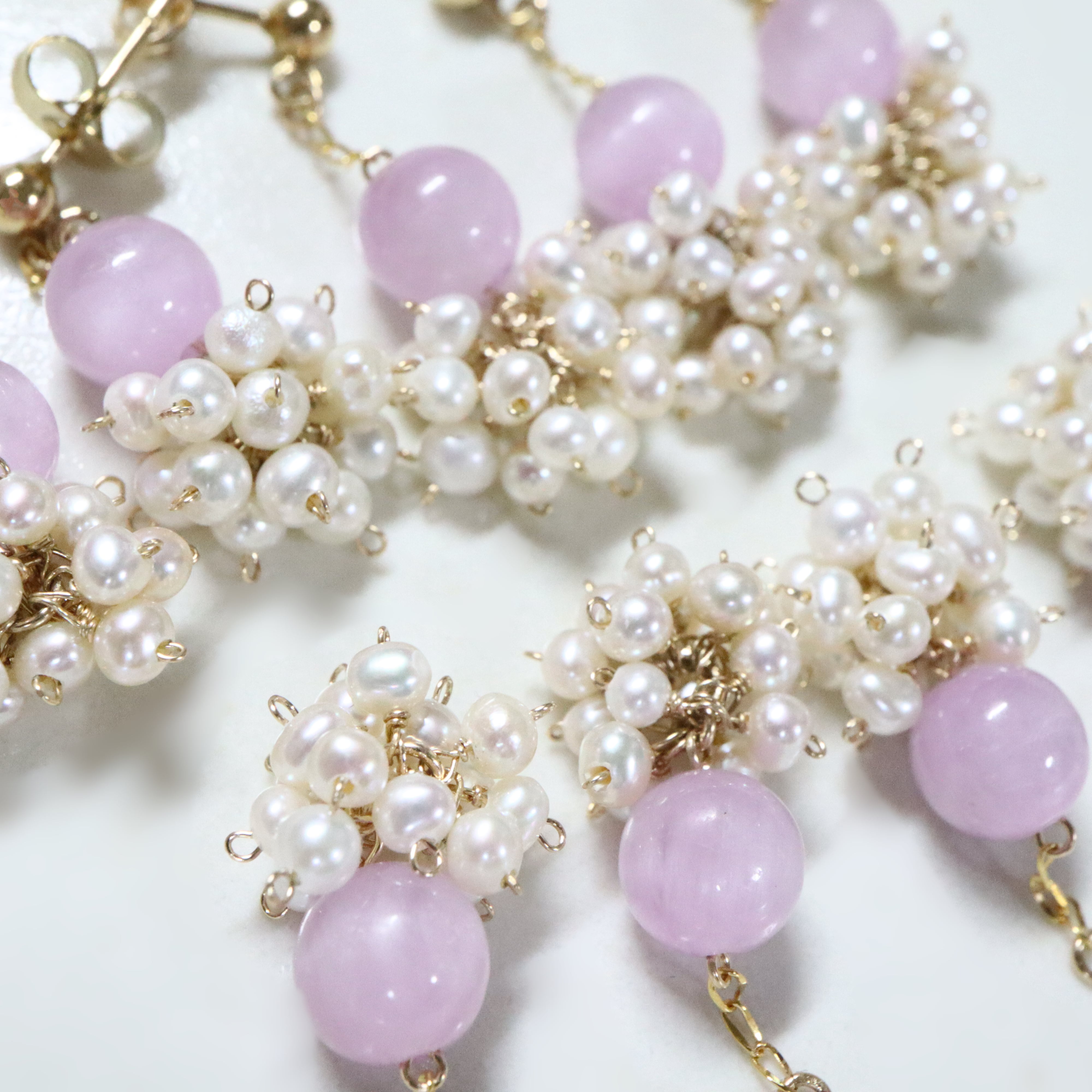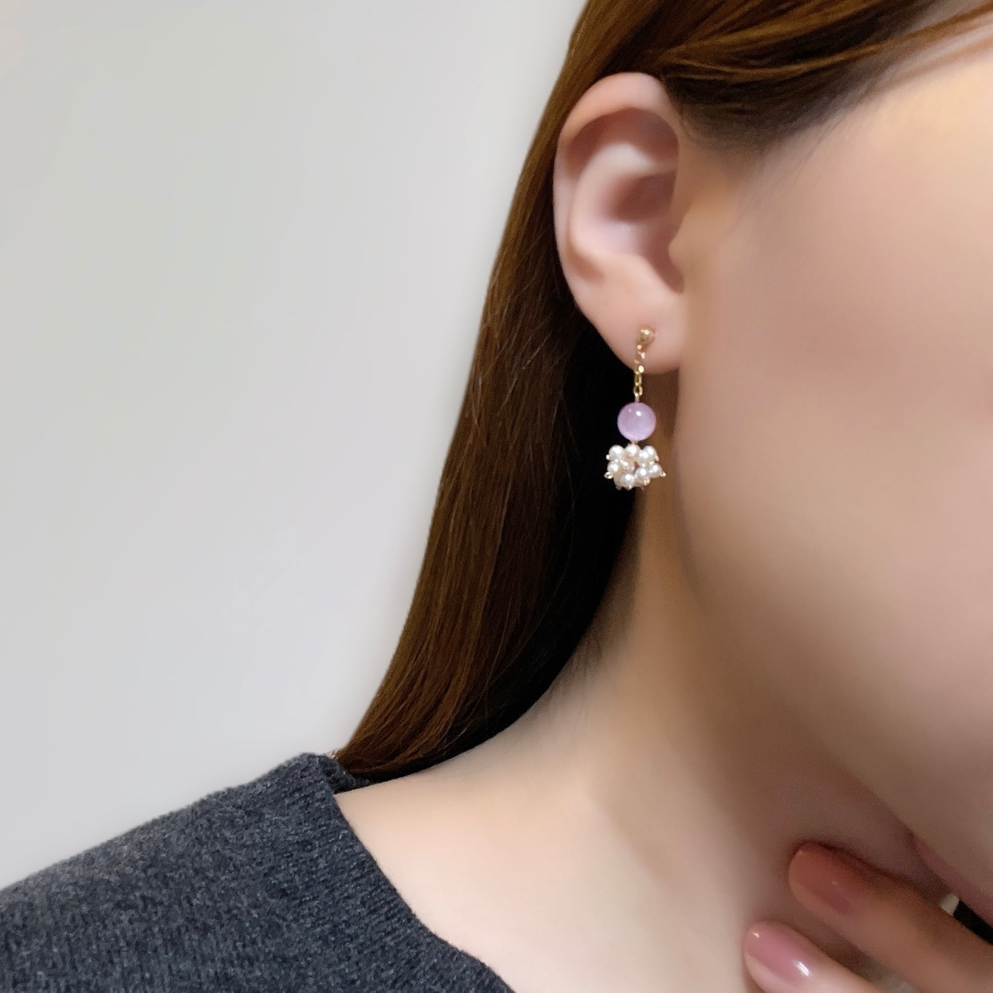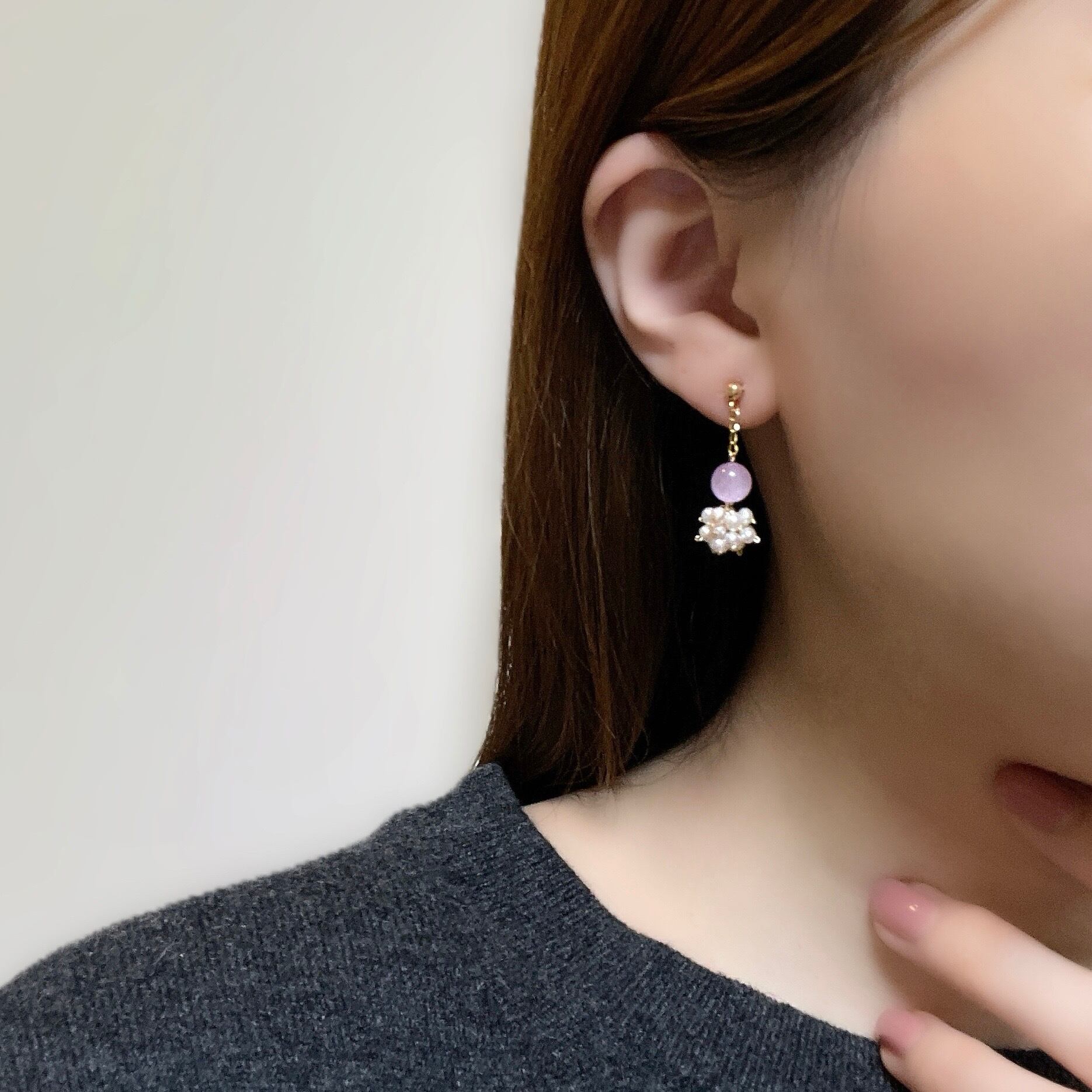 ボトムには小粒のホワイトパールをたっぷりと添え、可憐に揺れるシルエットが耳元を華やかに見せてくれます。