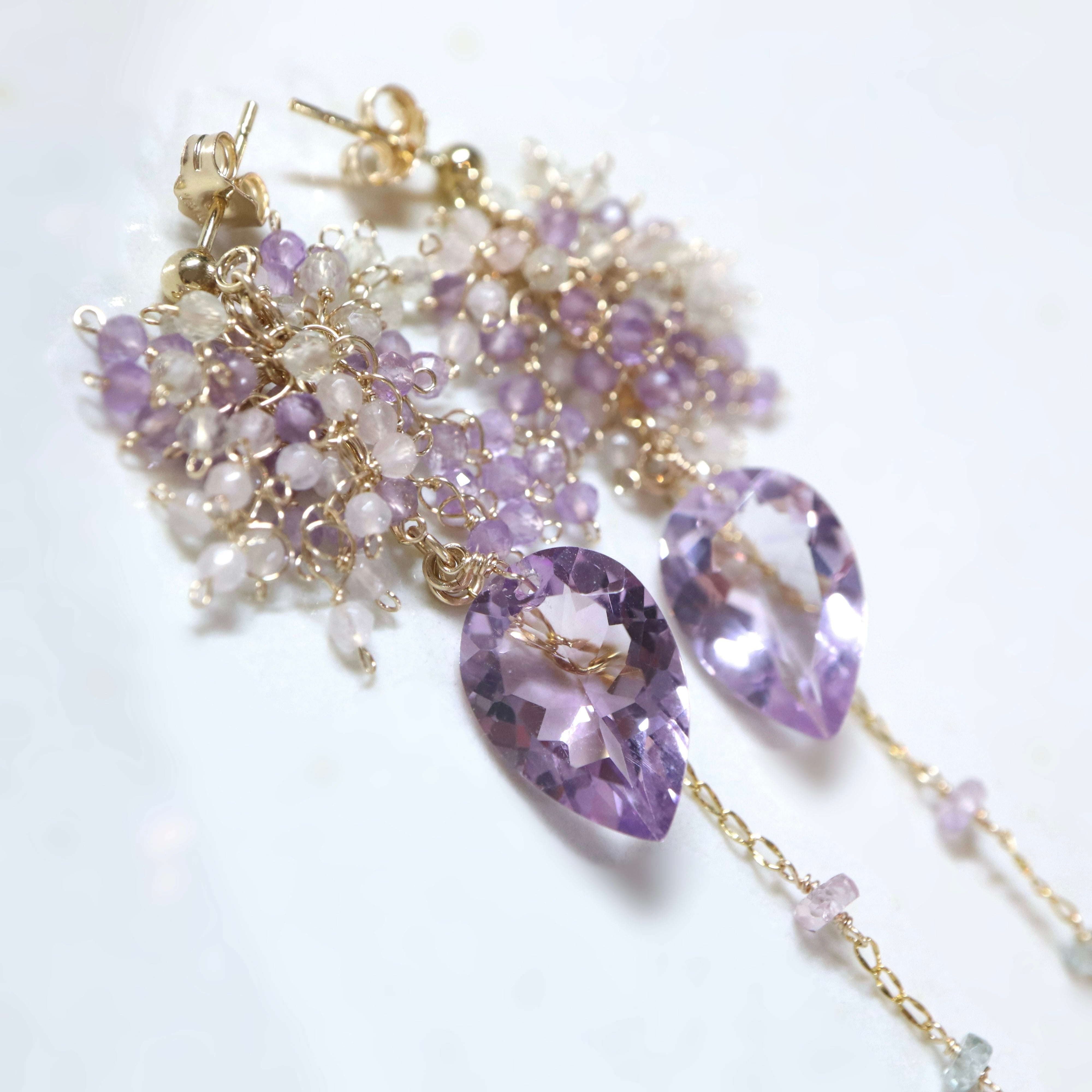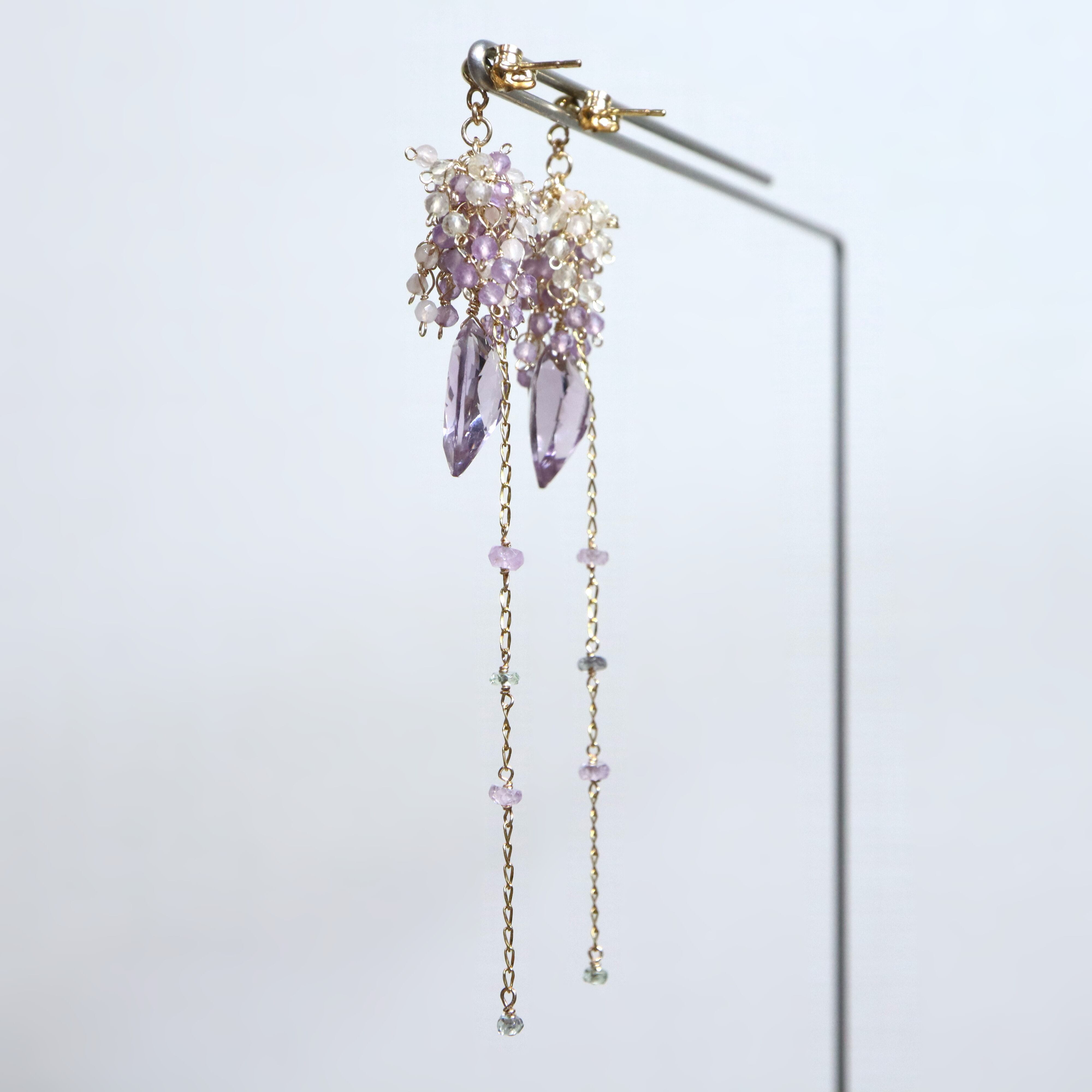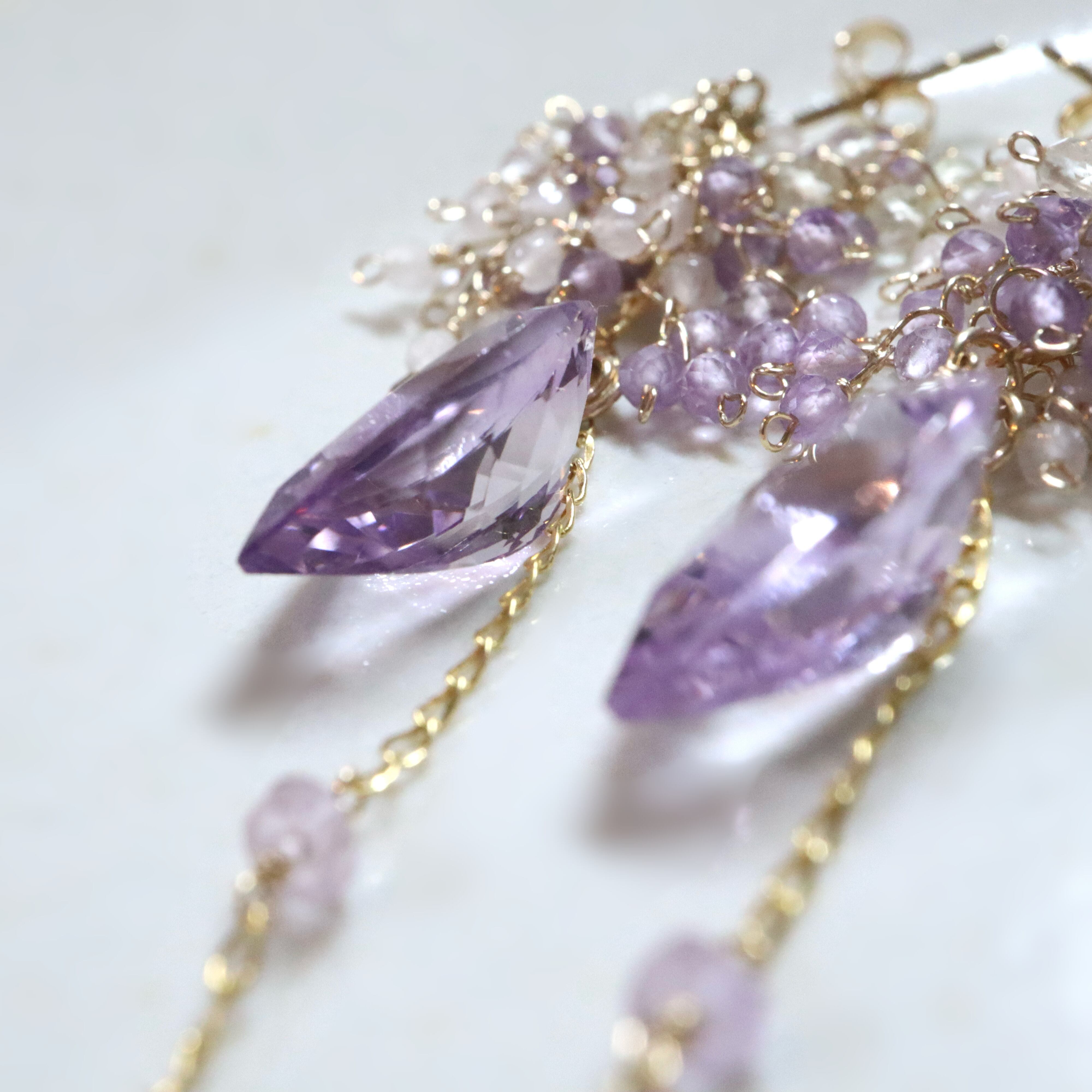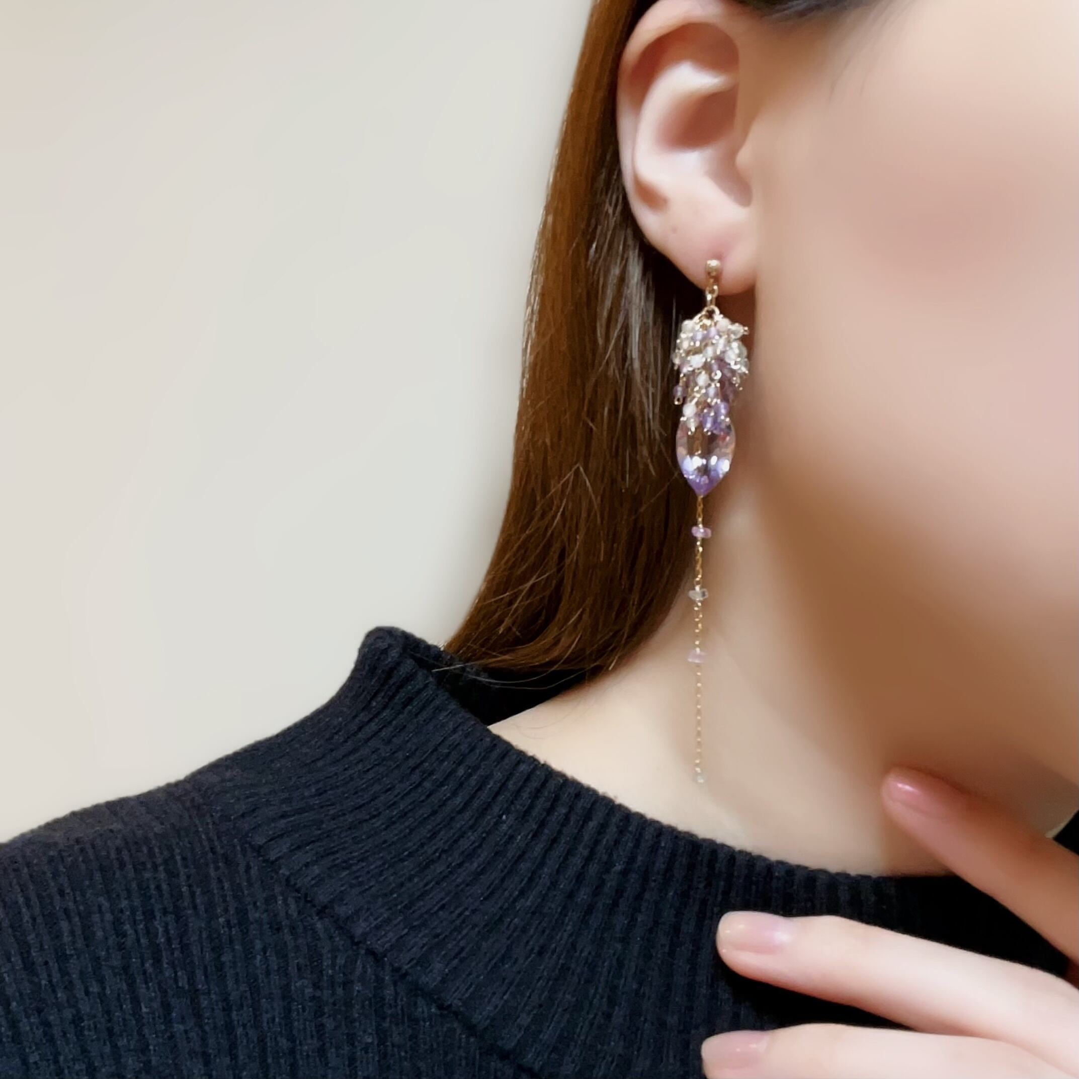 リーフ型の大粒アメジストを主役に、揺れるたびに繊細なきらめきを放つ、印象的なデザインに仕上げました。
