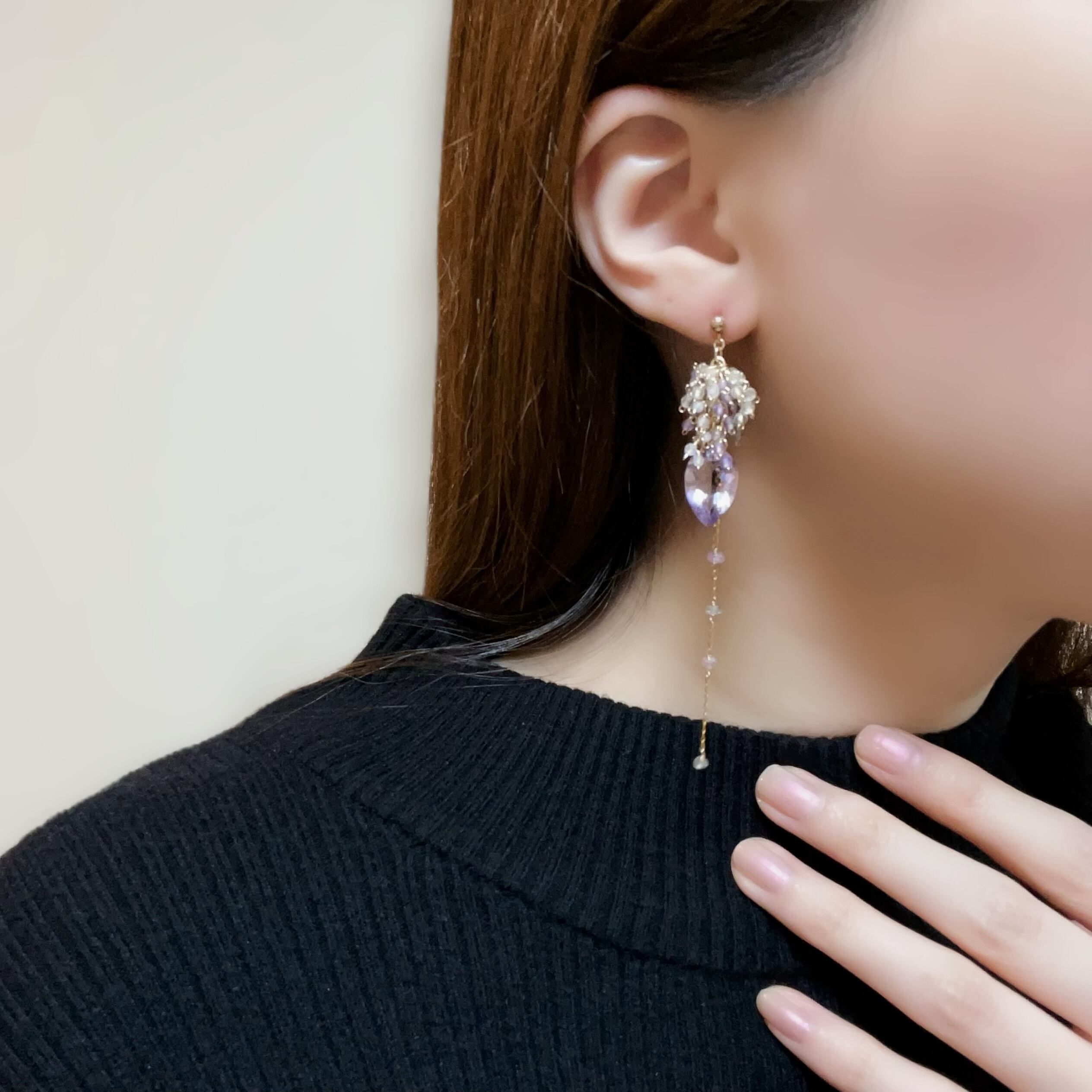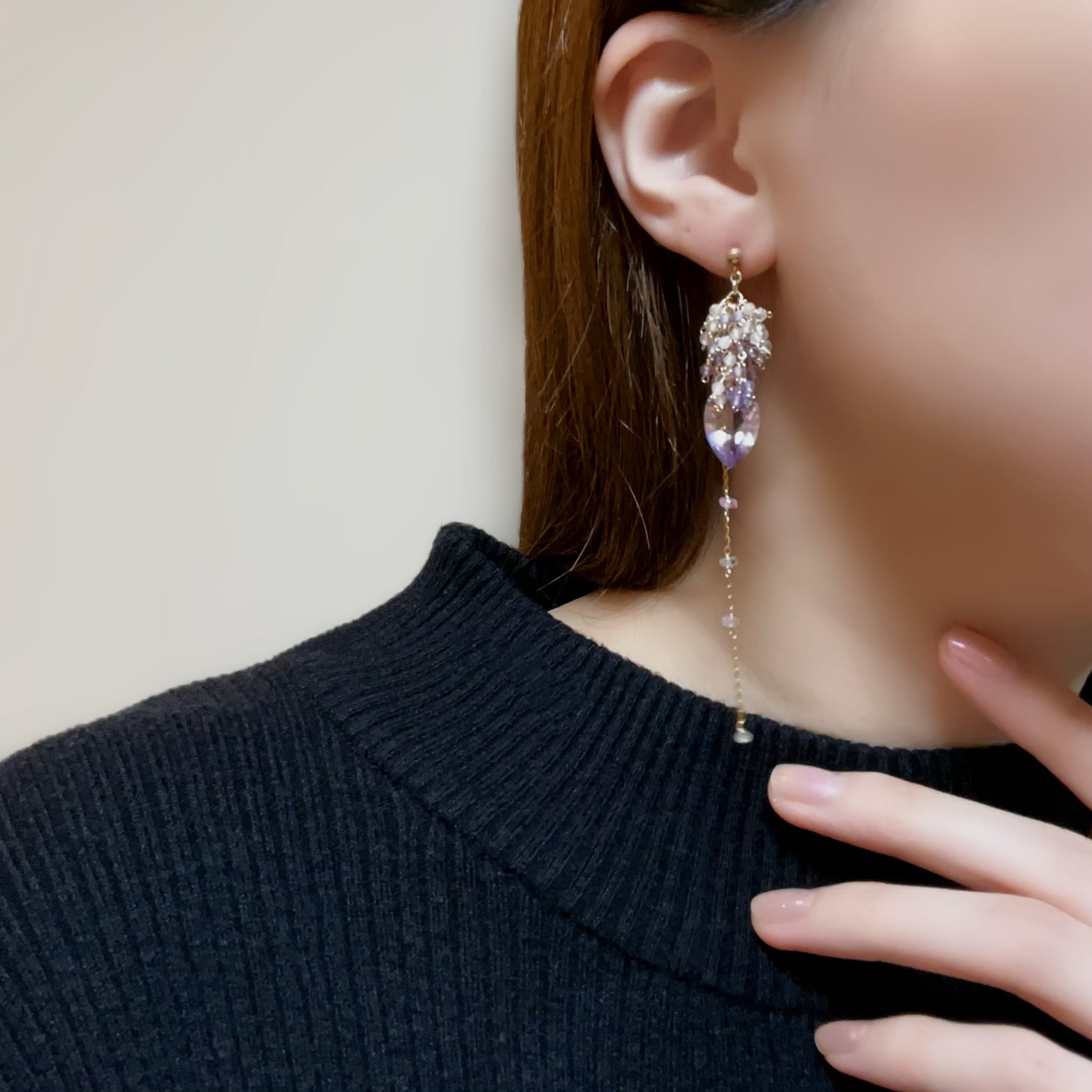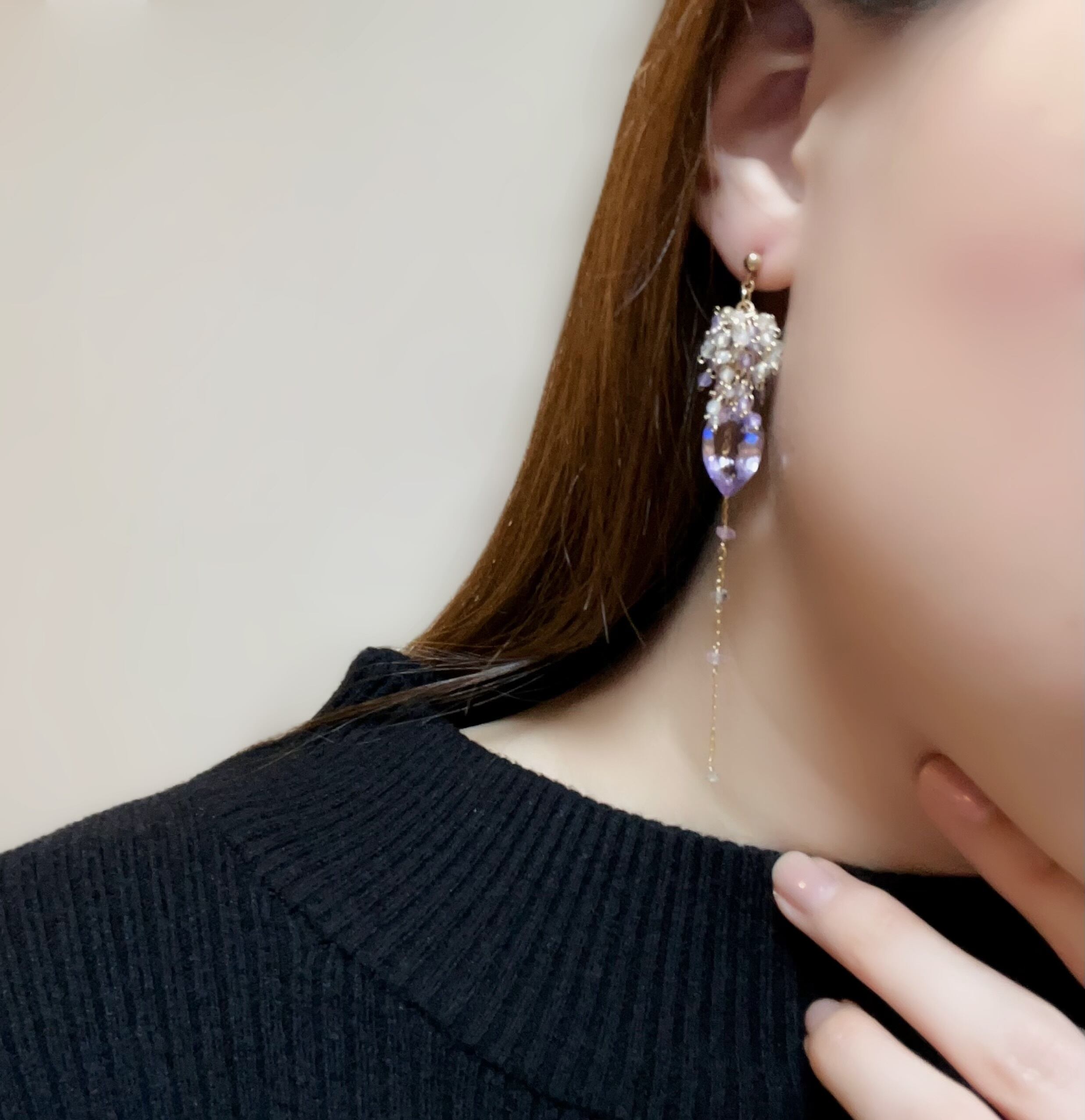 リーフ型の大粒アメジストを主役に、揺れるたびに繊細なきらめきを放つ、印象的なデザインに仕上げました。