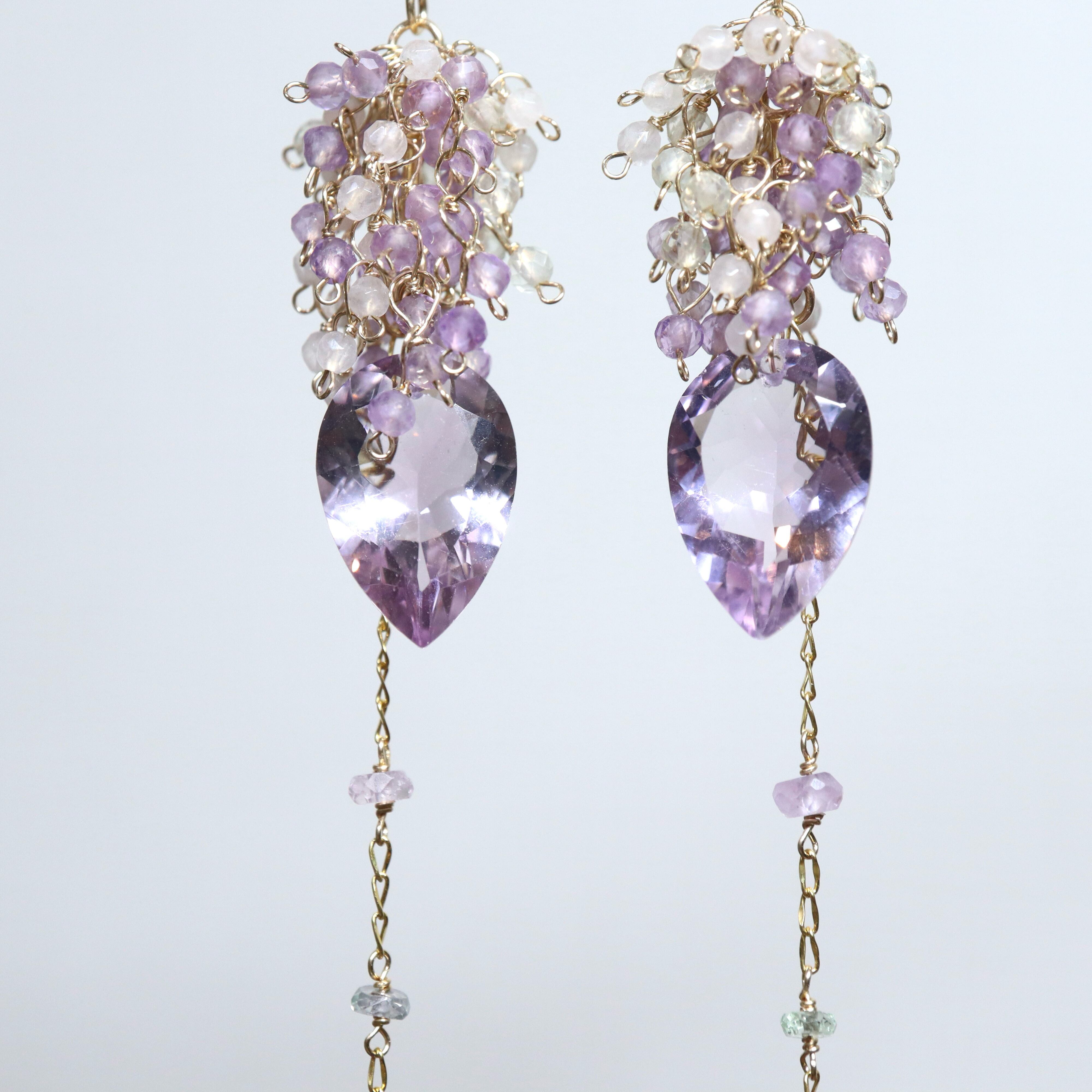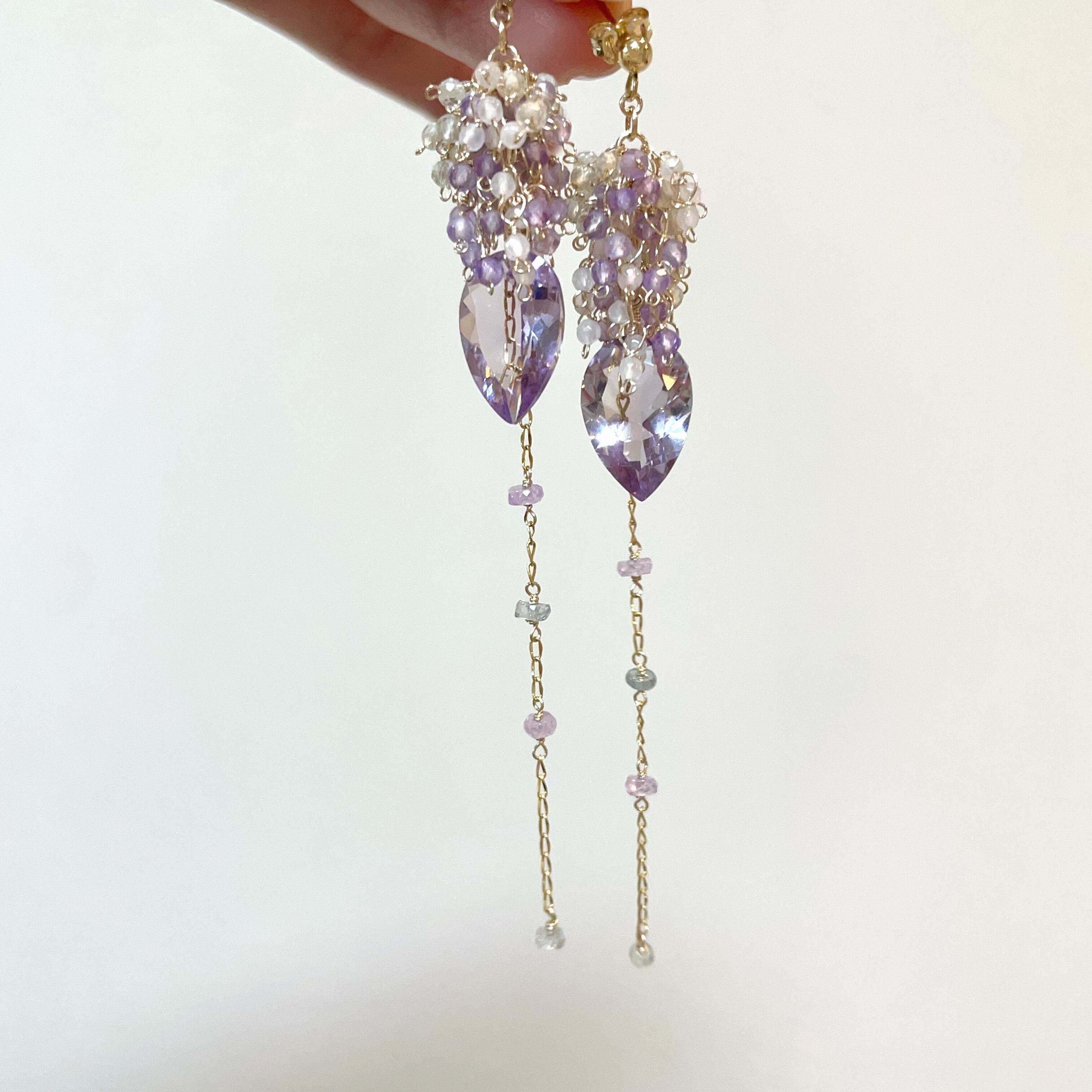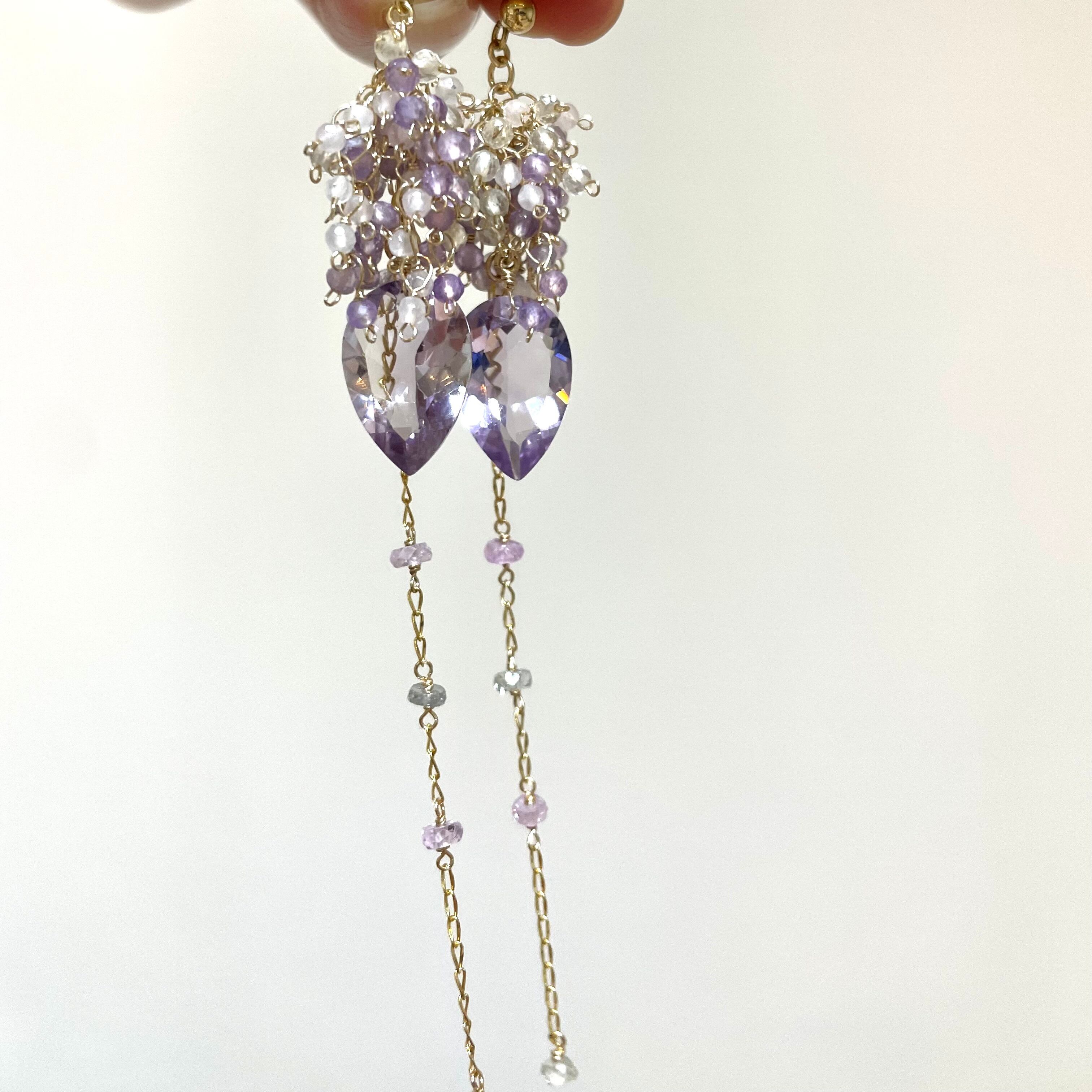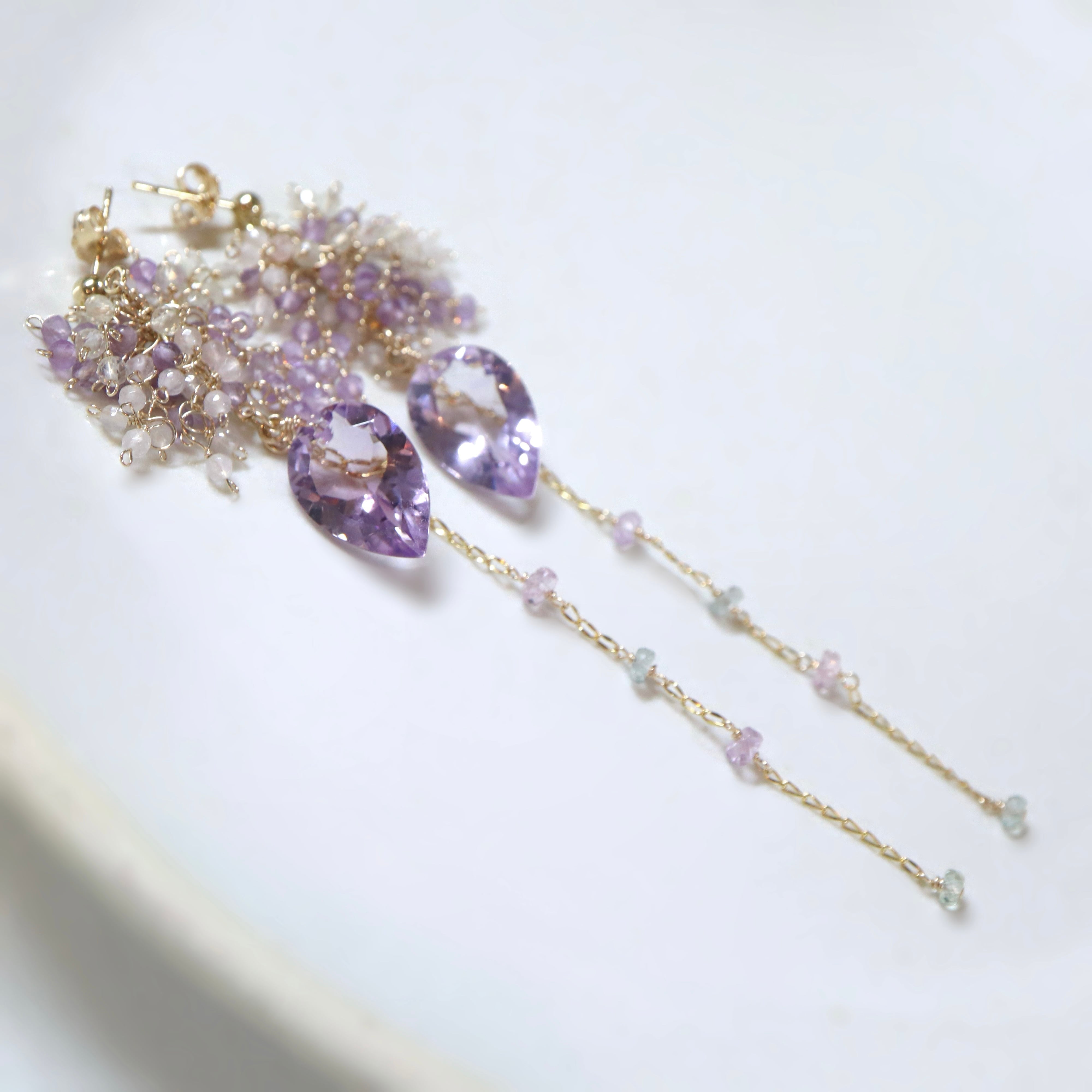 リーフ型の大粒アメジストを主役に、揺れるたびに繊細なきらめきを放つ、印象的なデザインに仕上げました。
