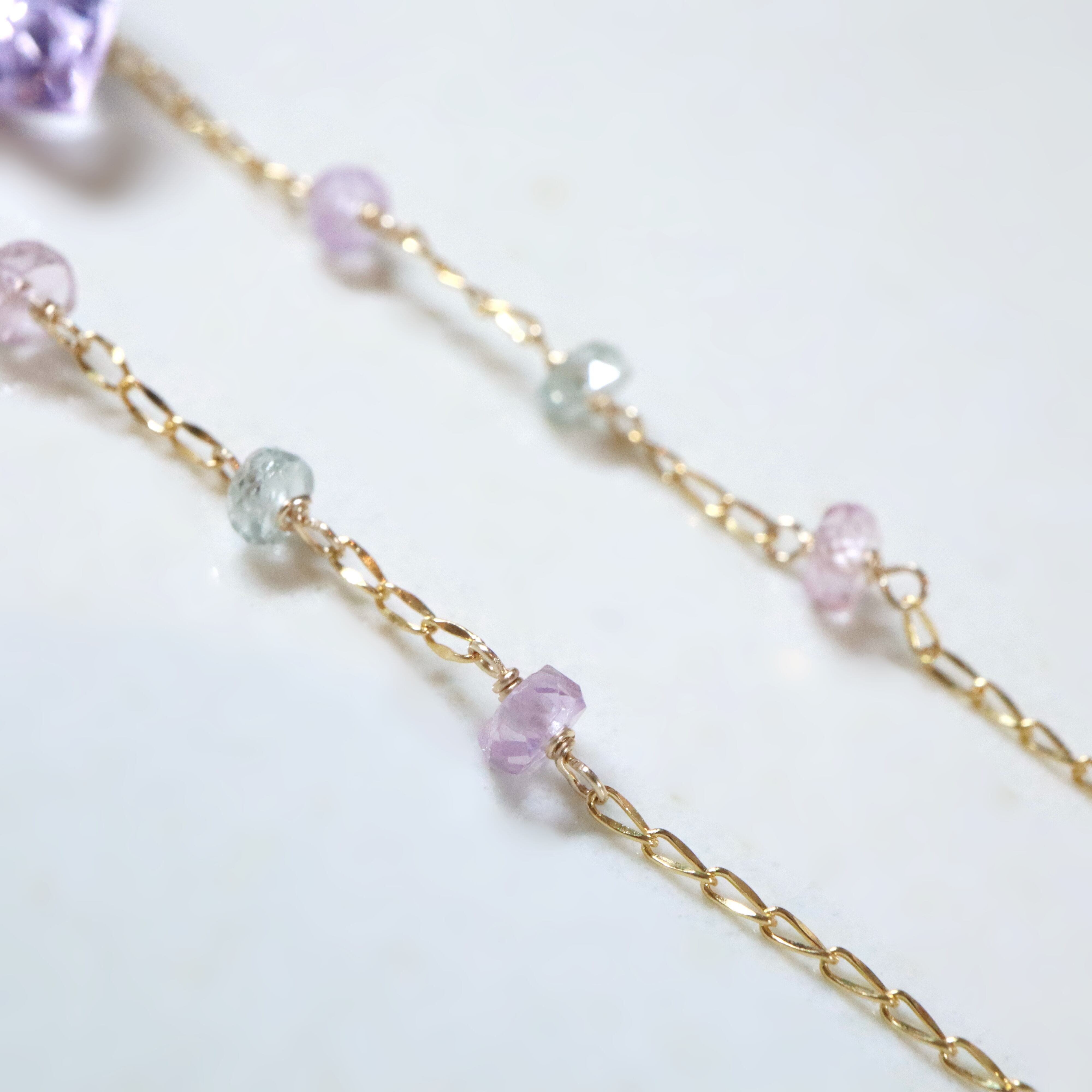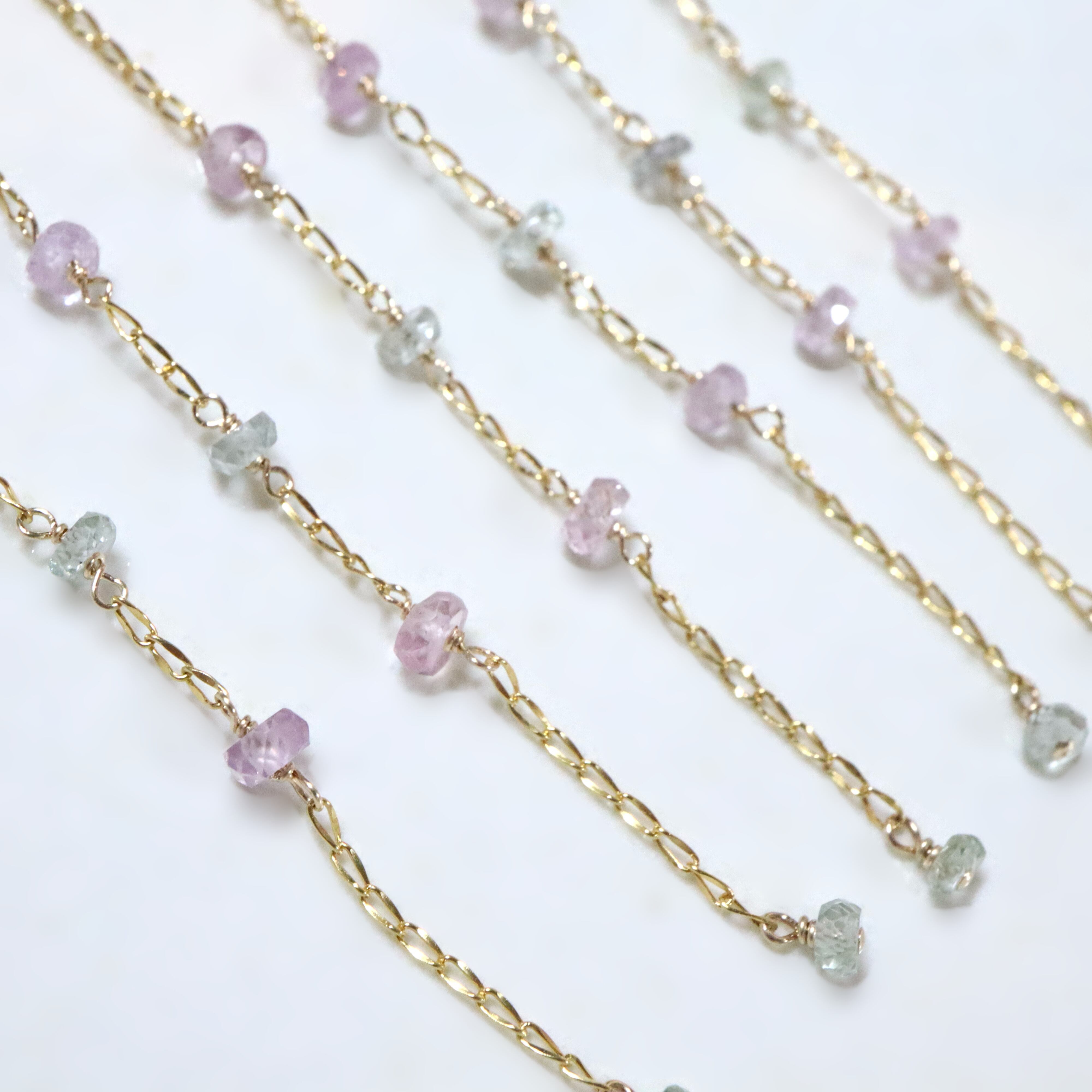 チェーン部分には、ライトピンクとミントグリーンのサファイアを添え、爽やかで透明感のある色合わせに。