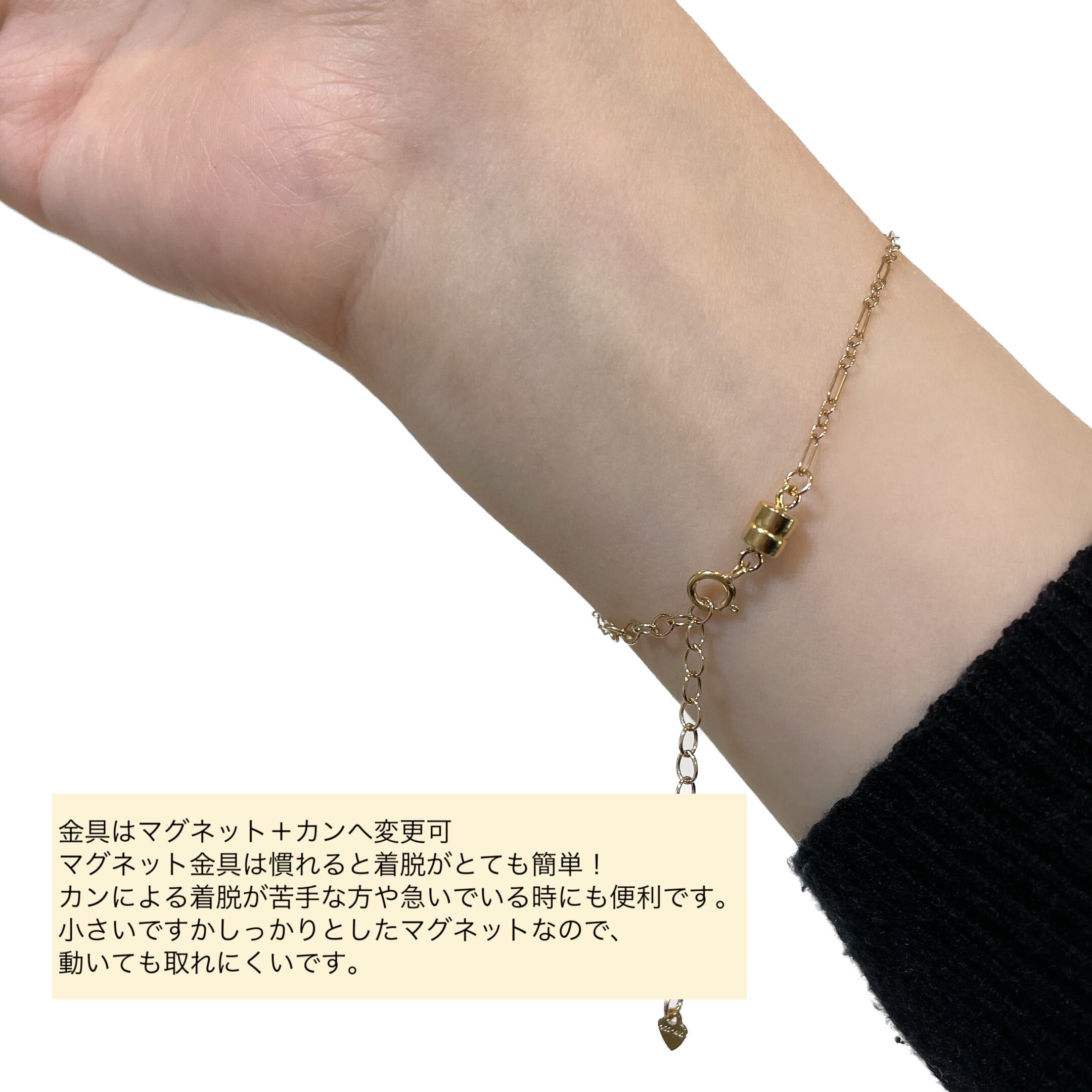 ∇使用している素材は比較的金属アレルギーの方も安心してお使い頂けるとは思いますが、お肌に合わない・異常が出た場合は使用をお控え下さい。
