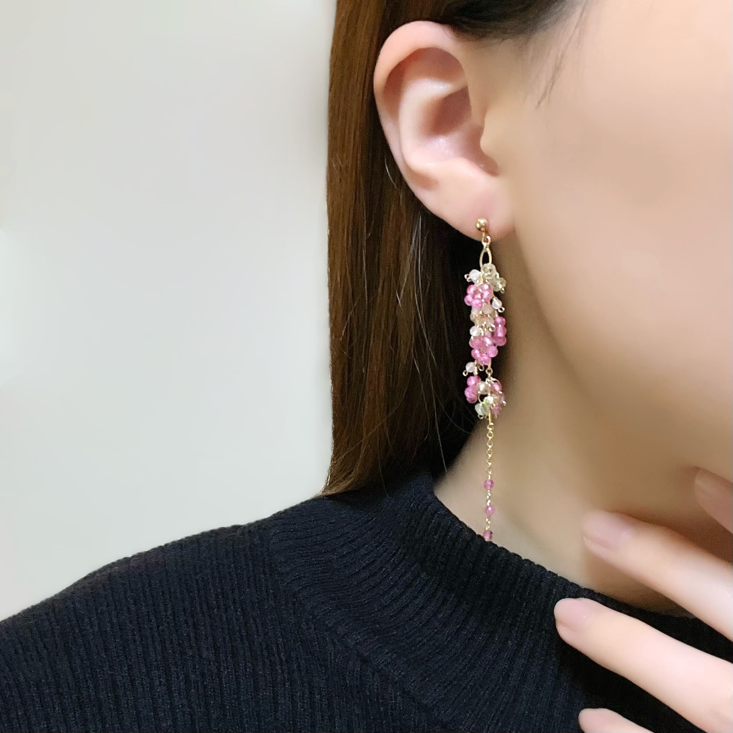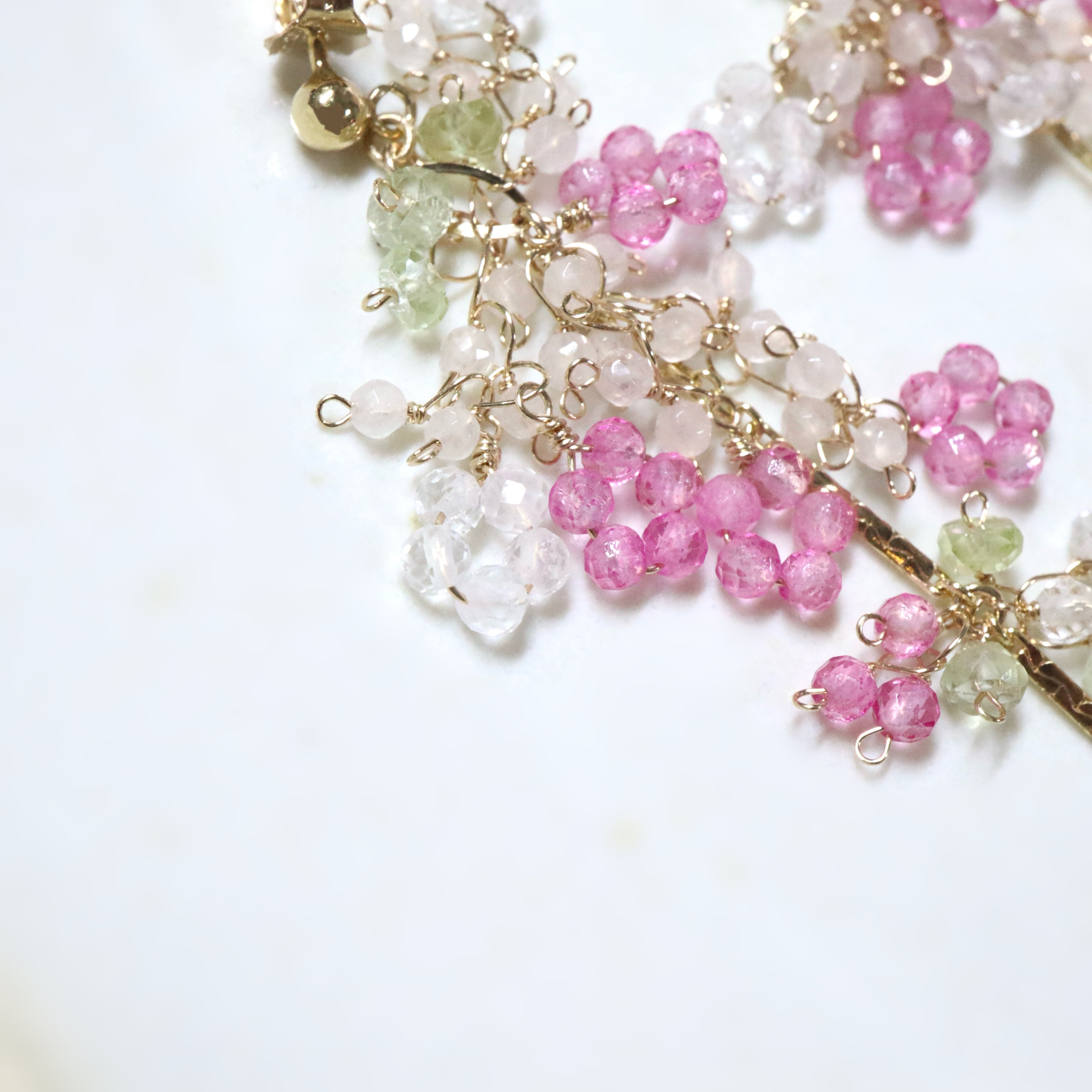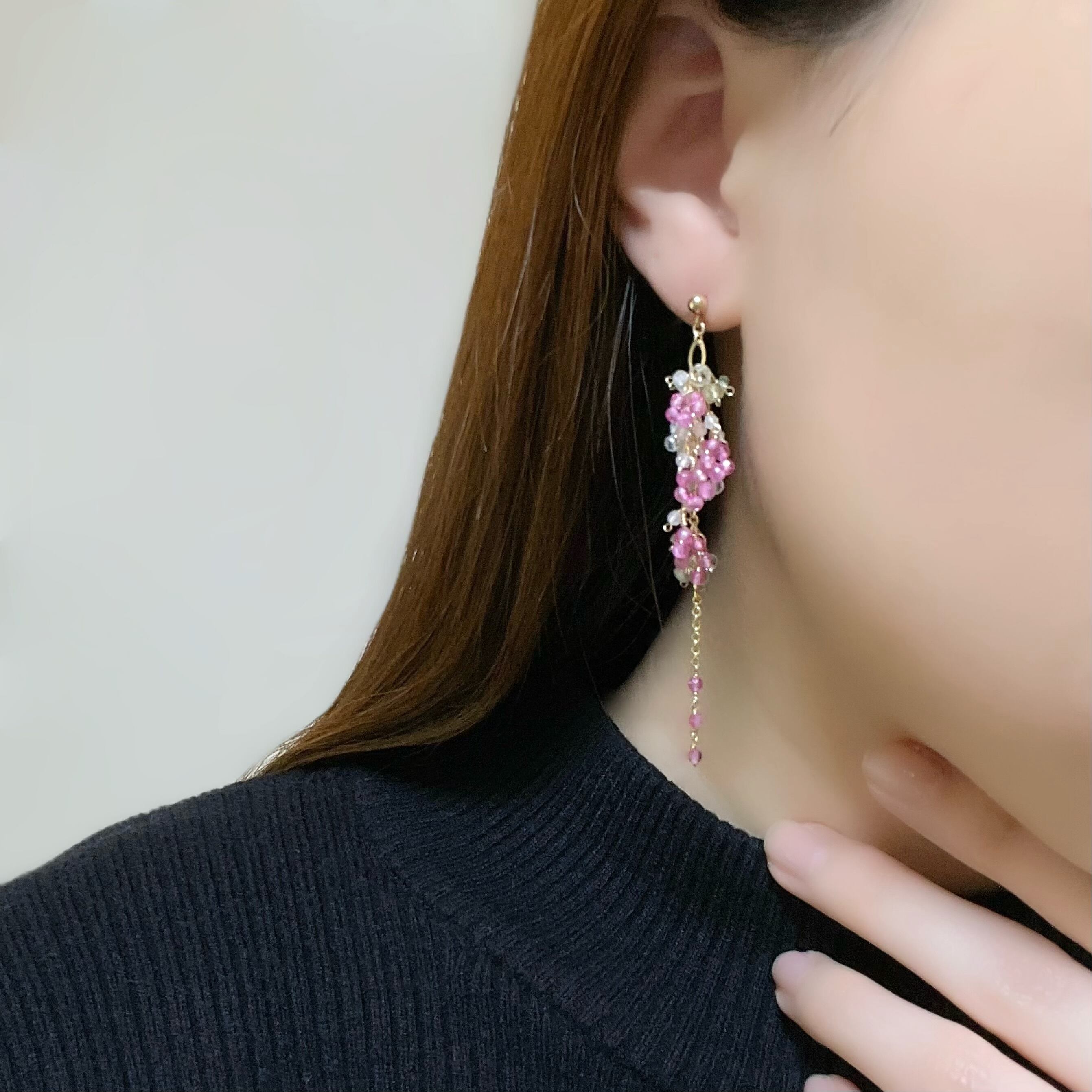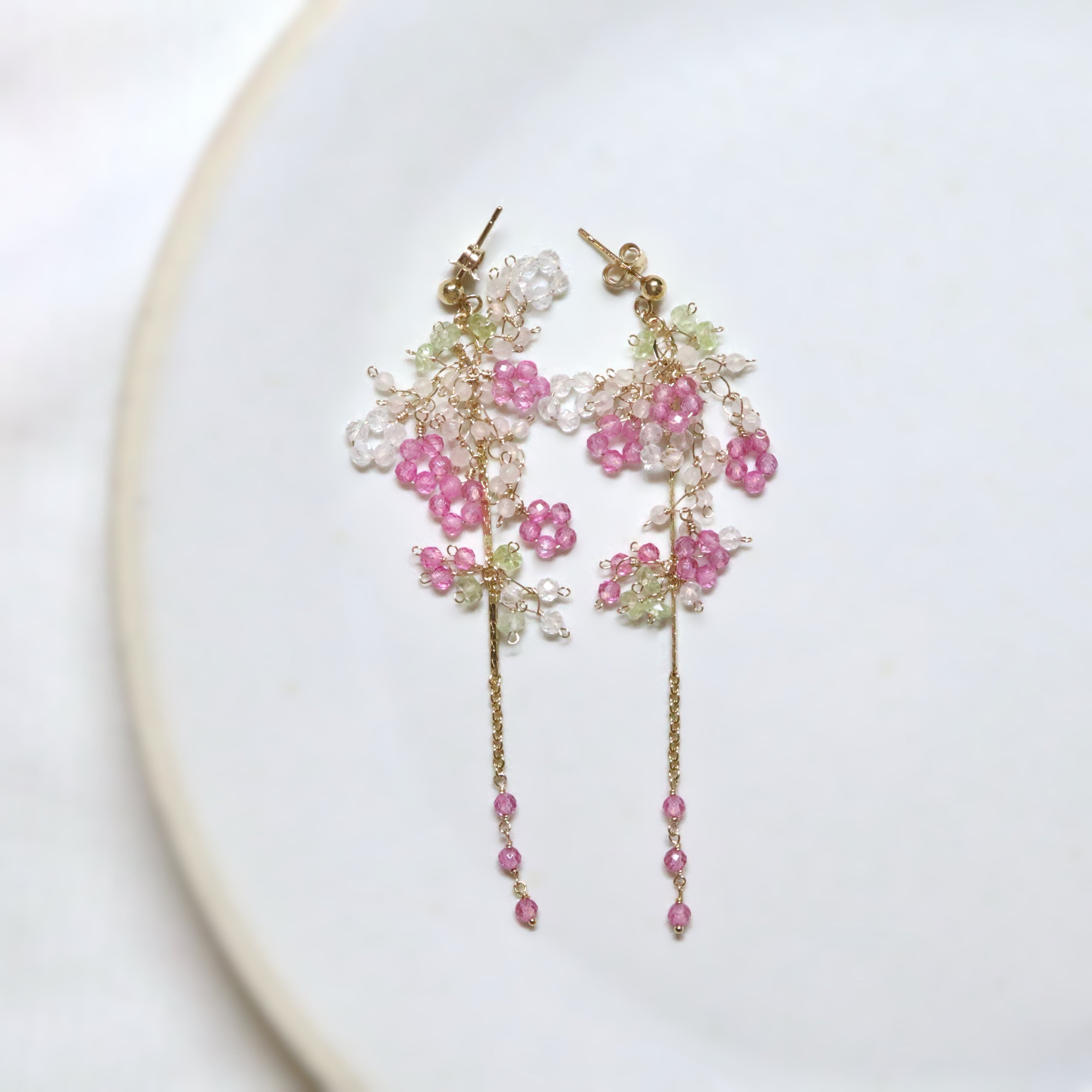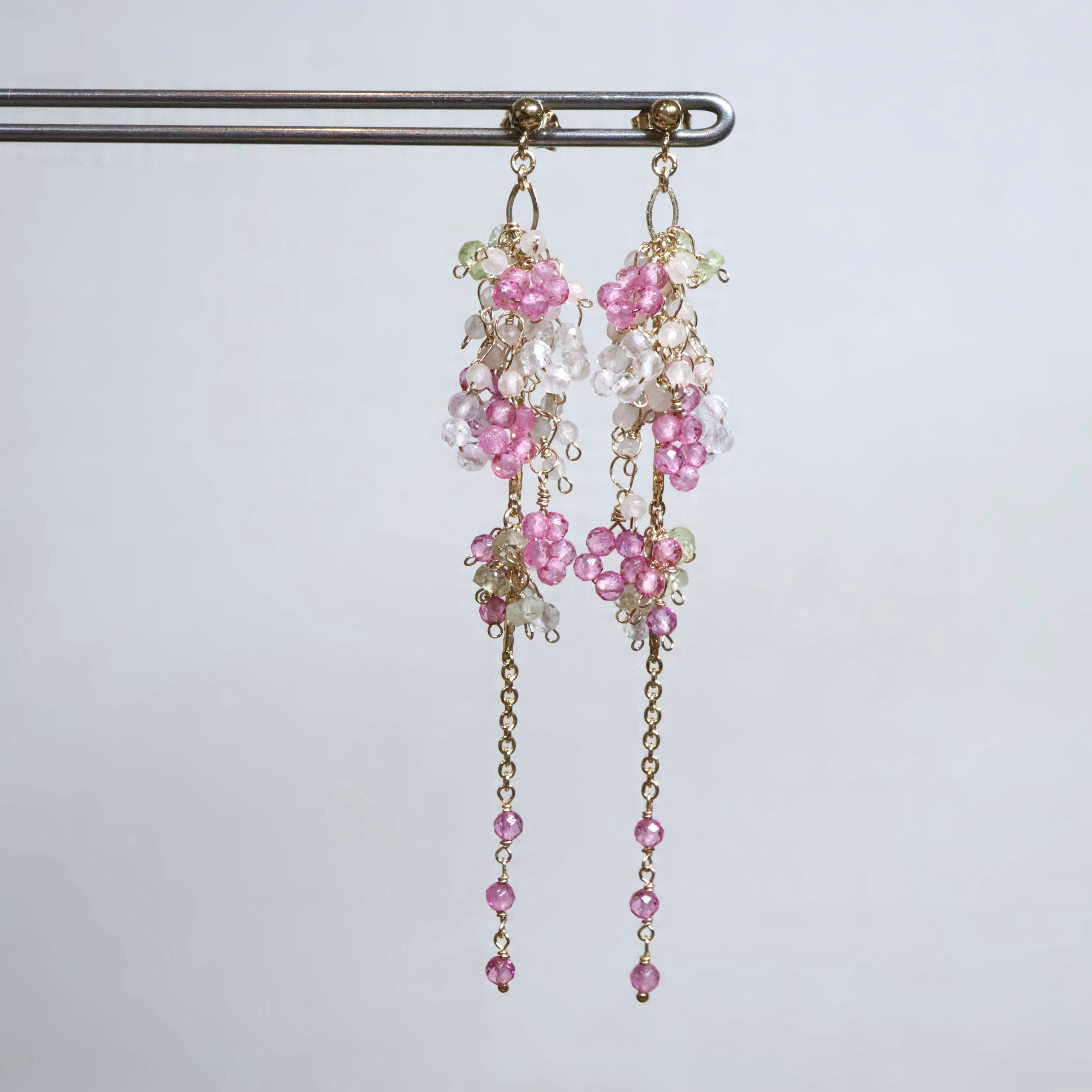 華やかなピンクカラーのピンクトパーズと、みずみずしく煌めくクリスタルを可愛らしい花モチーフに仕立て、贅沢にあしらったロングデザイン。