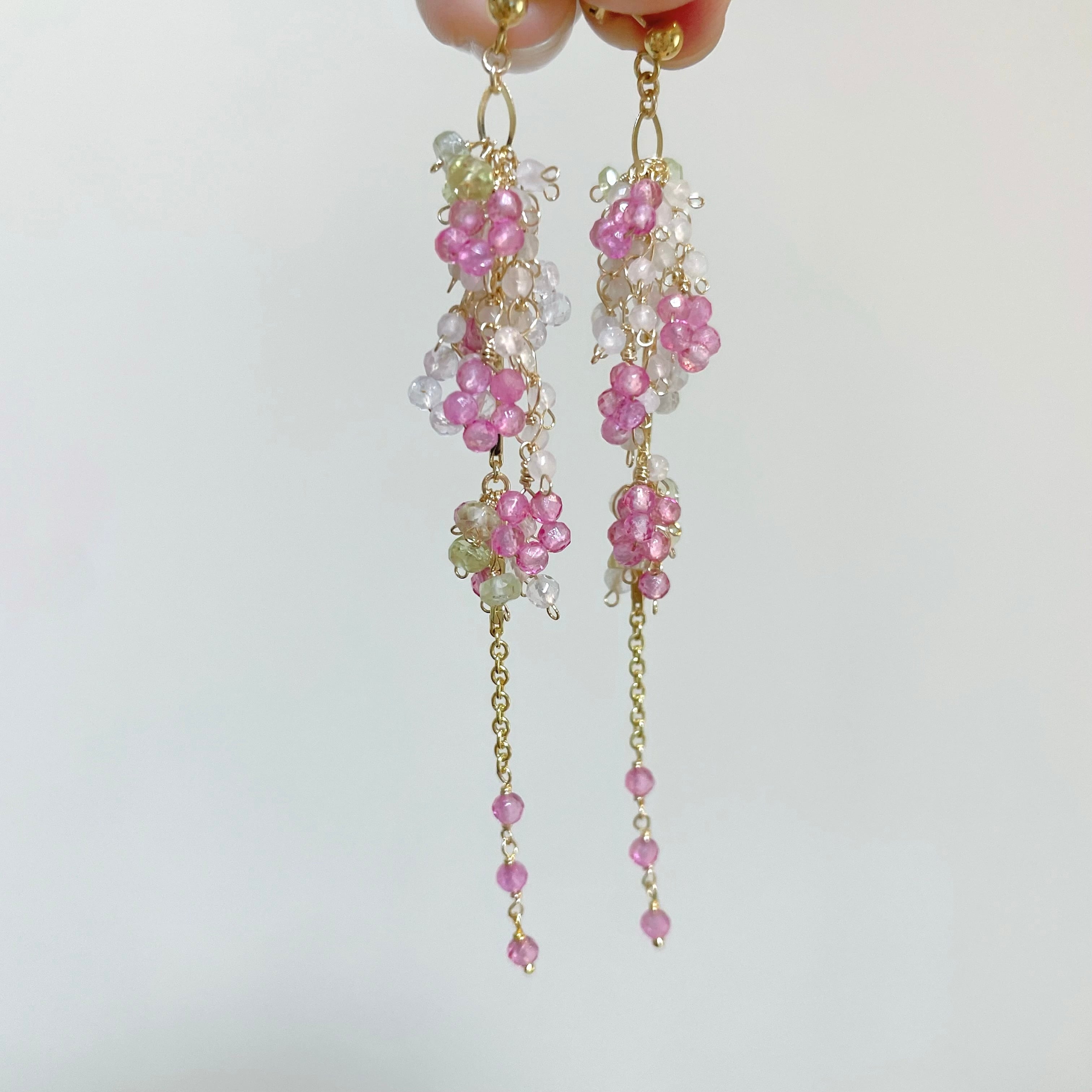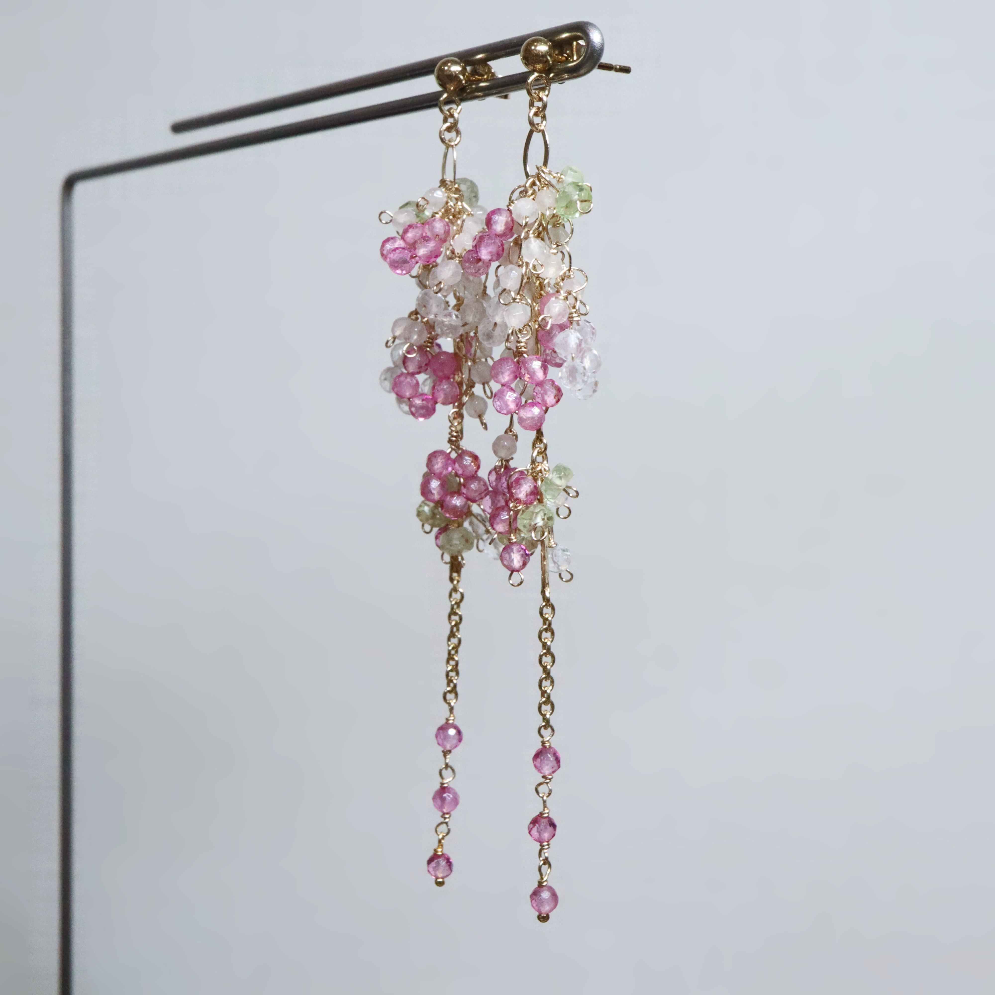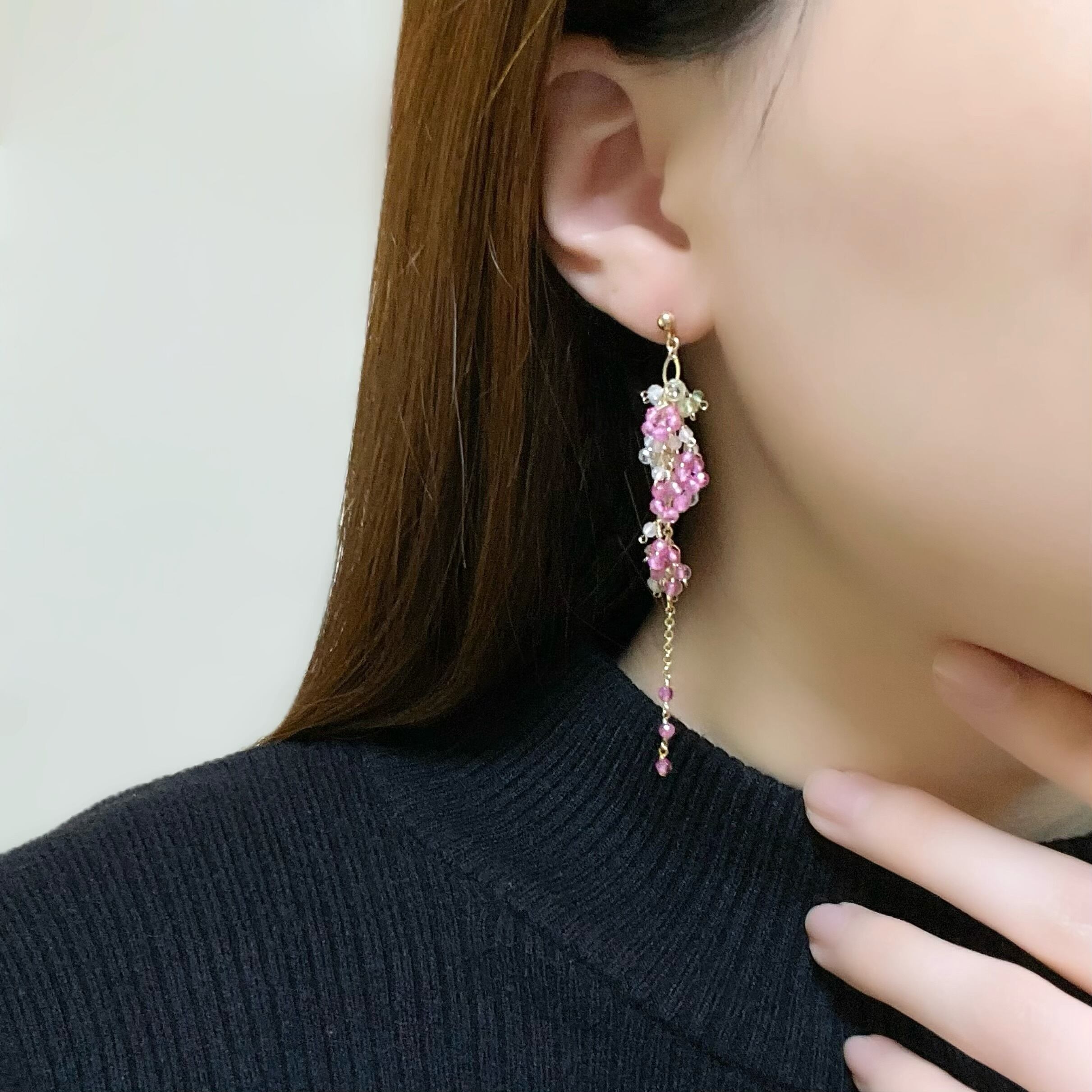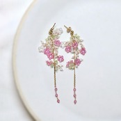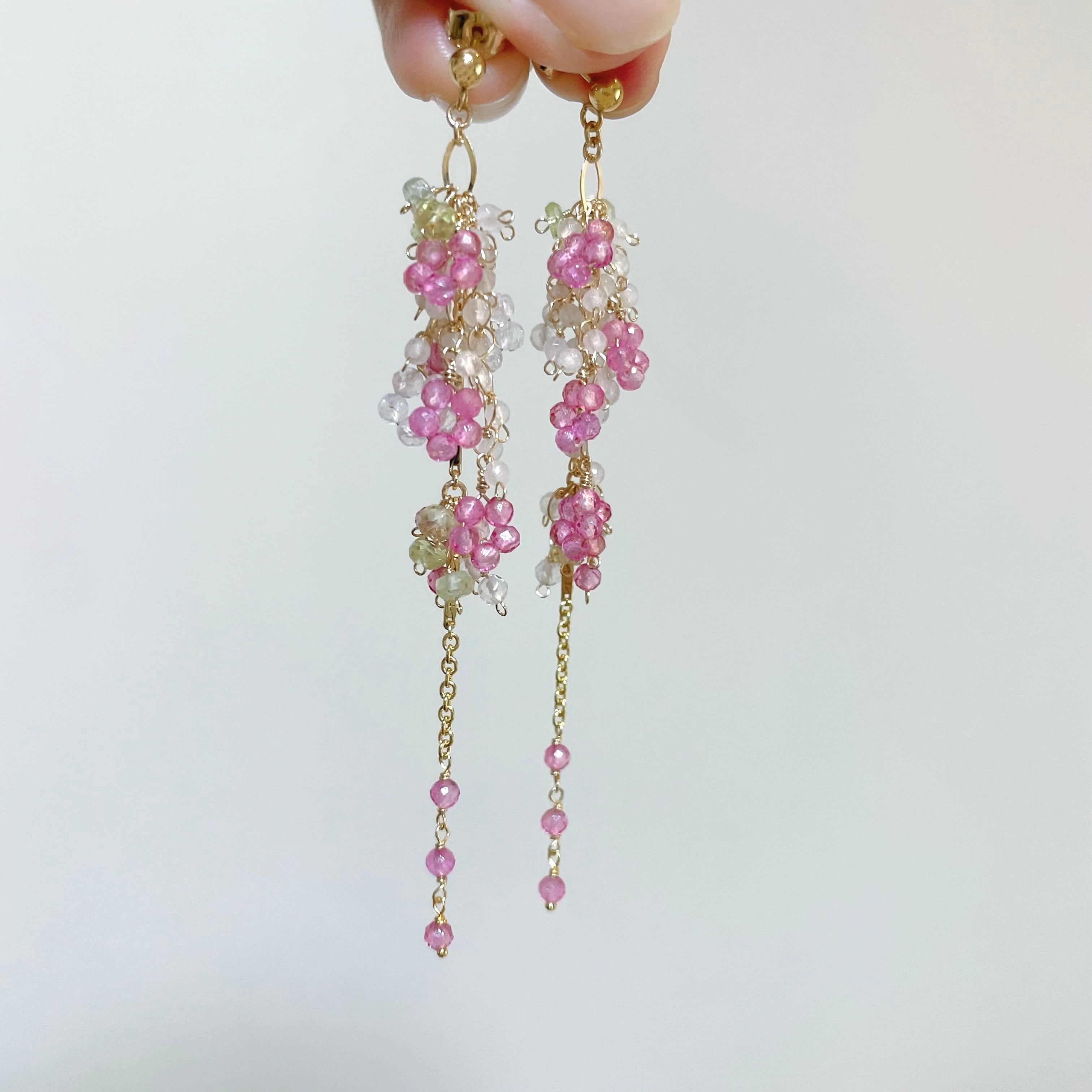 華やかなピンクカラーのピンクトパーズと、みずみずしく煌めくクリスタルを可愛らしい花モチーフに仕立て、贅沢にあしらったロングデザイン。