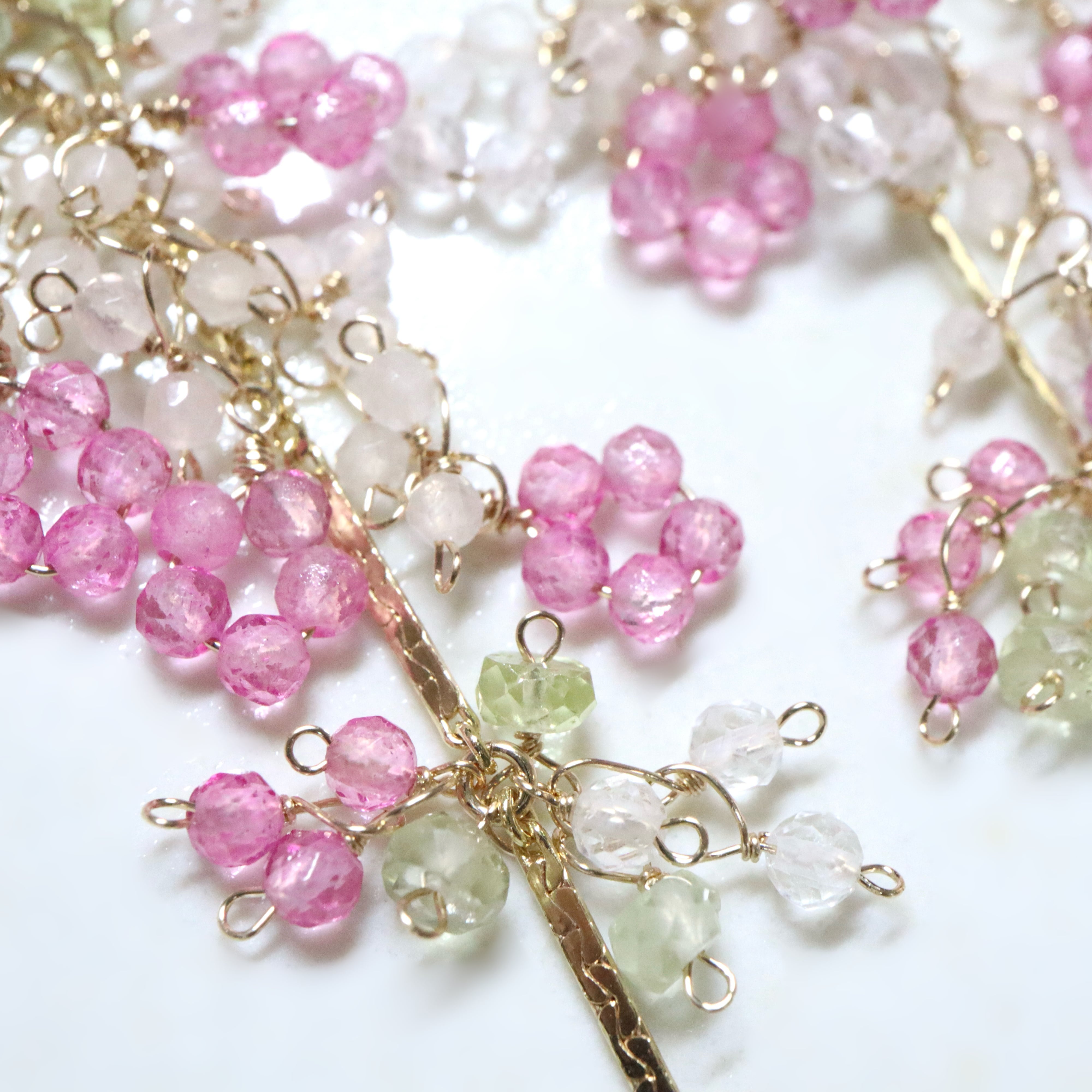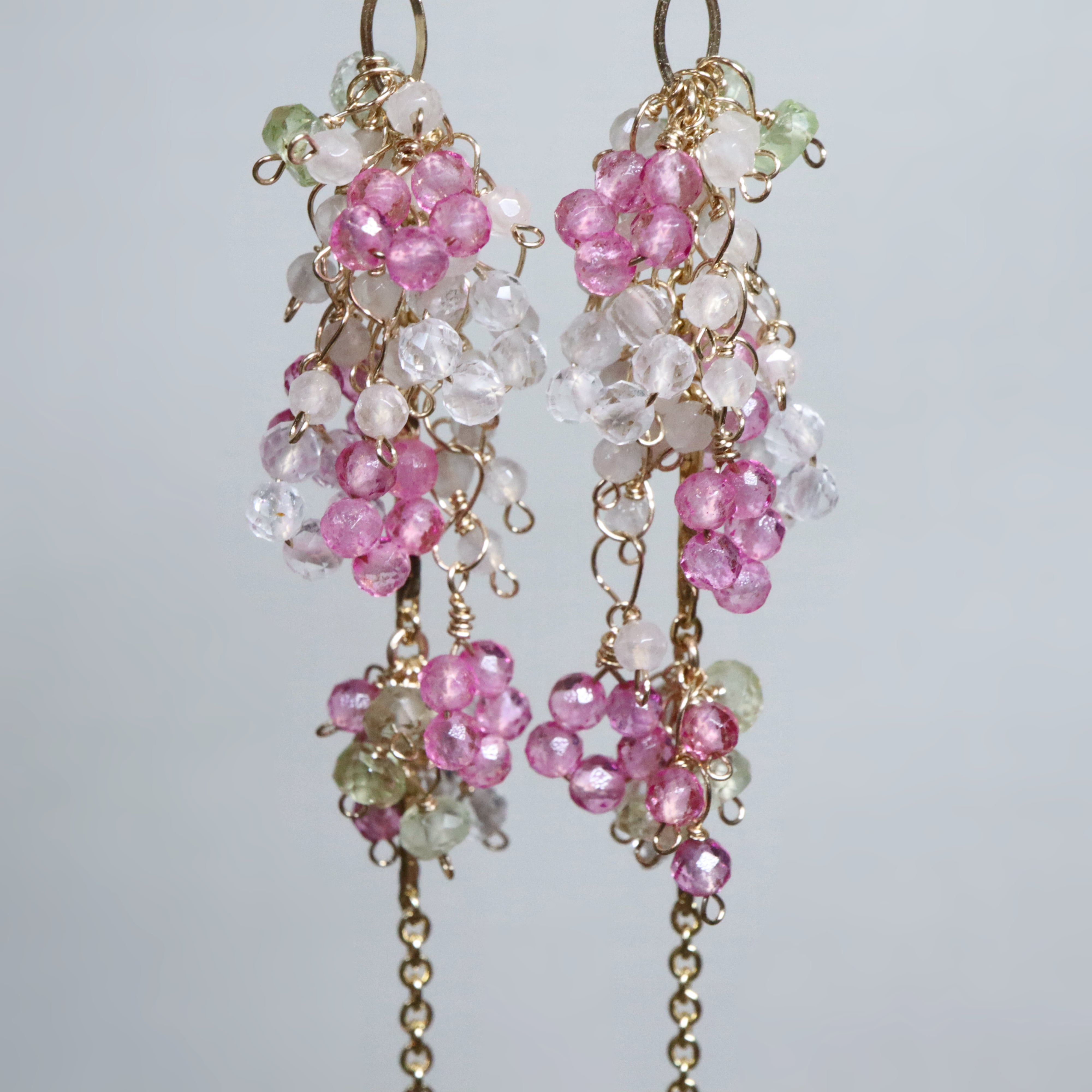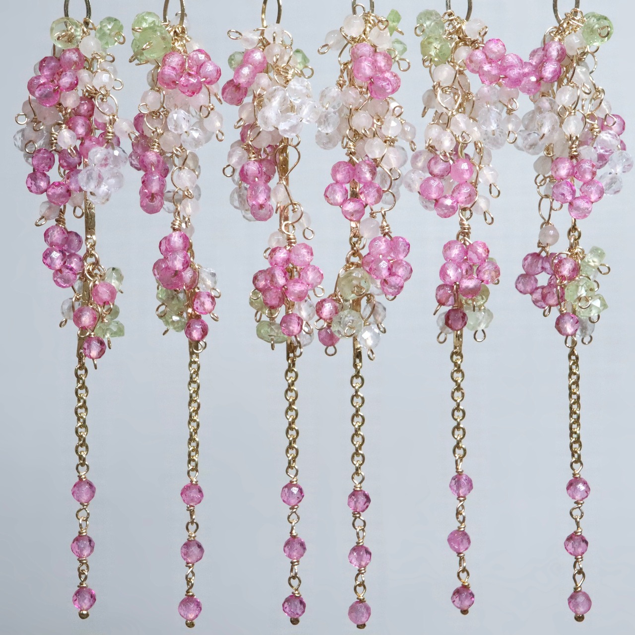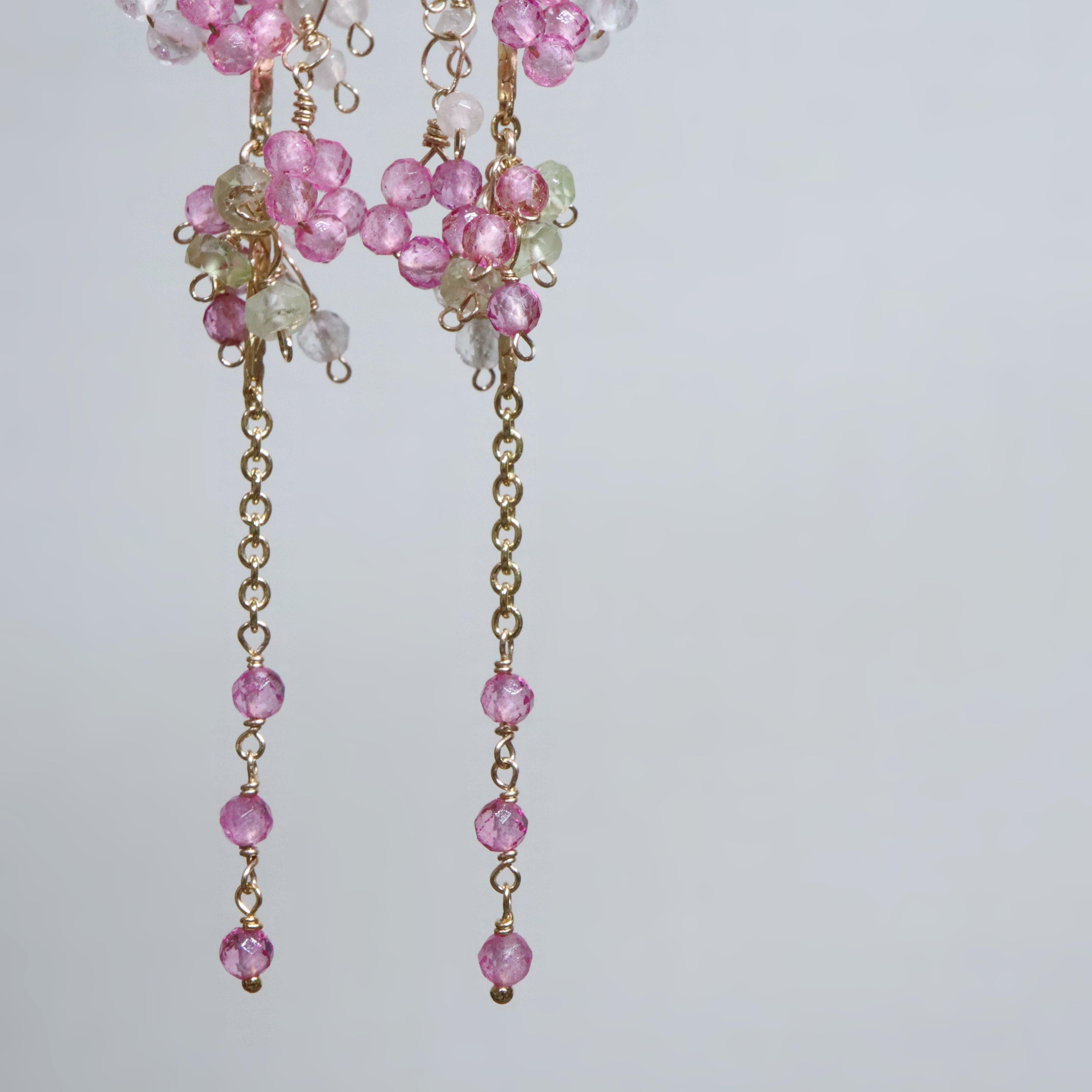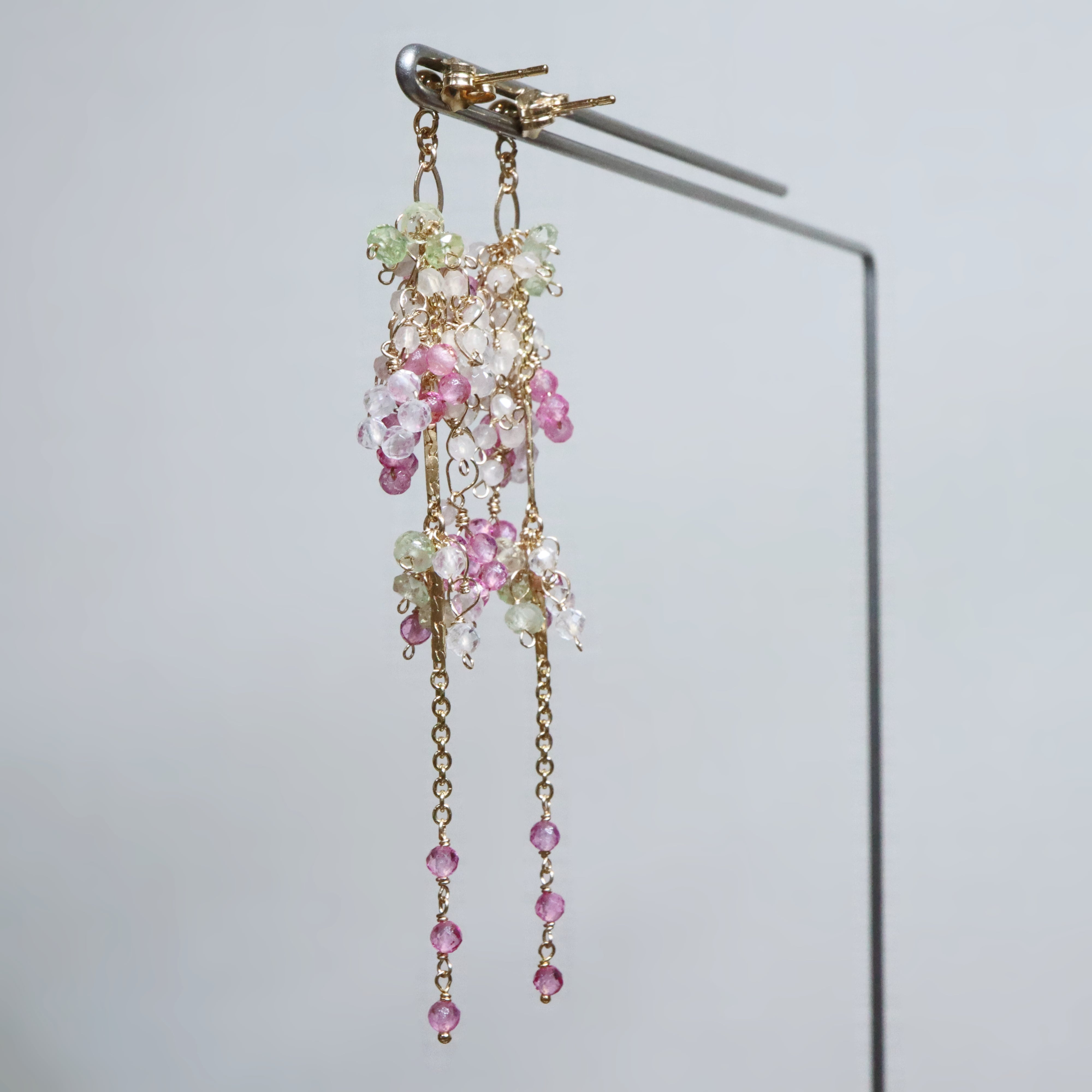 華やかなピンクカラーのピンクトパーズと、みずみずしく煌めくクリスタルを可愛らしい花モチーフに仕立て、贅沢にあしらったロングデザイン。