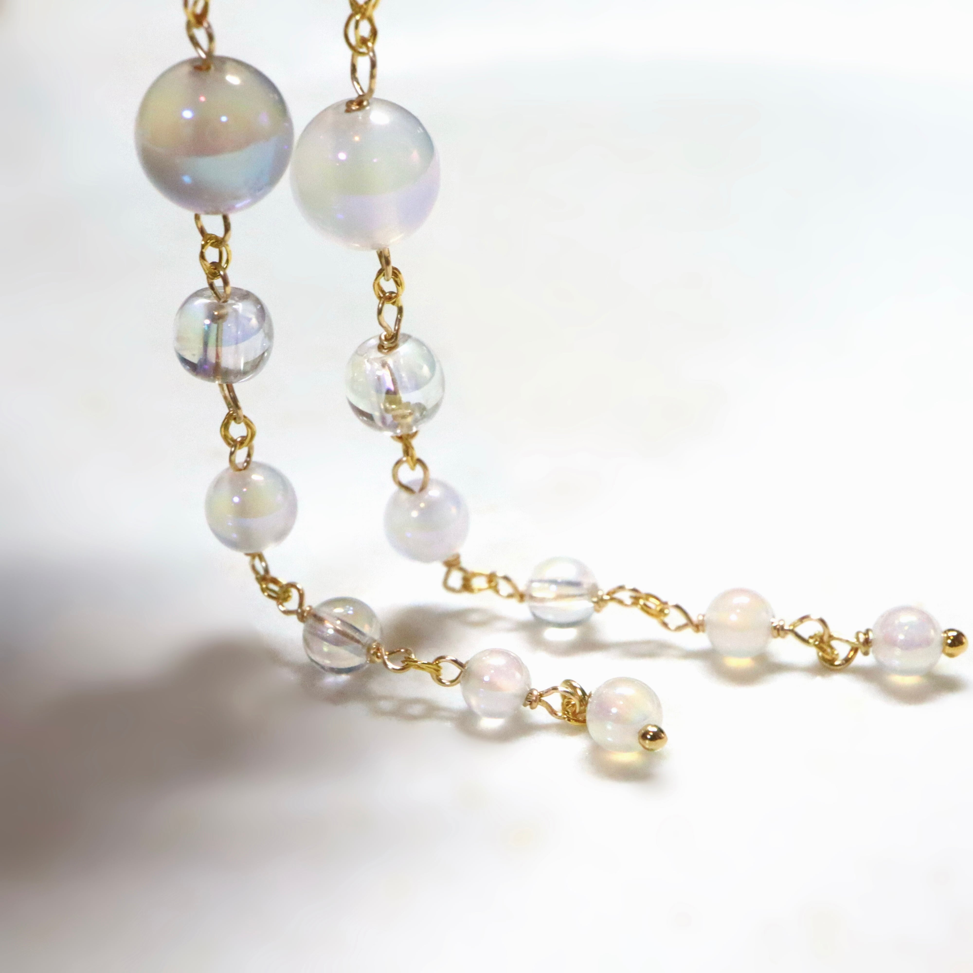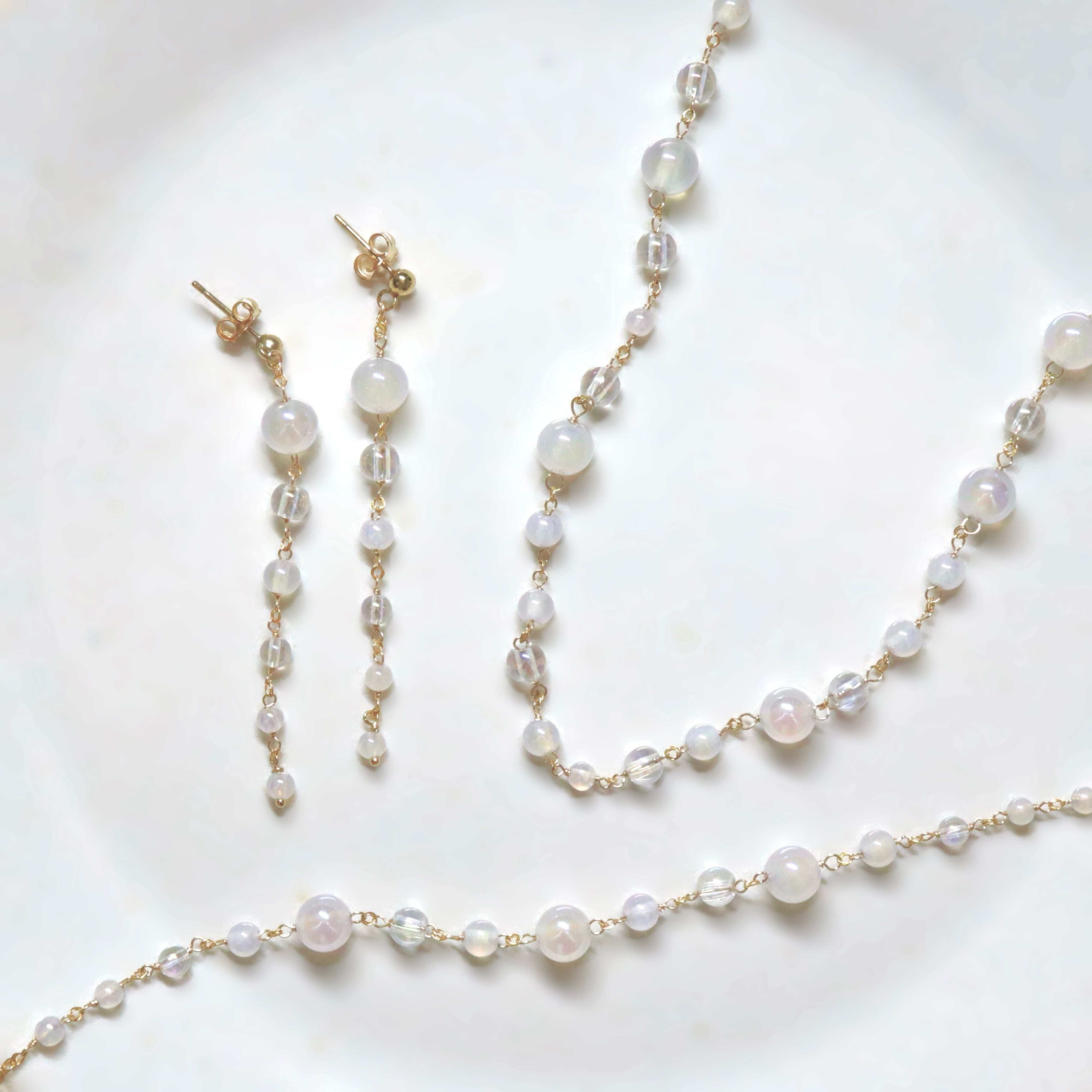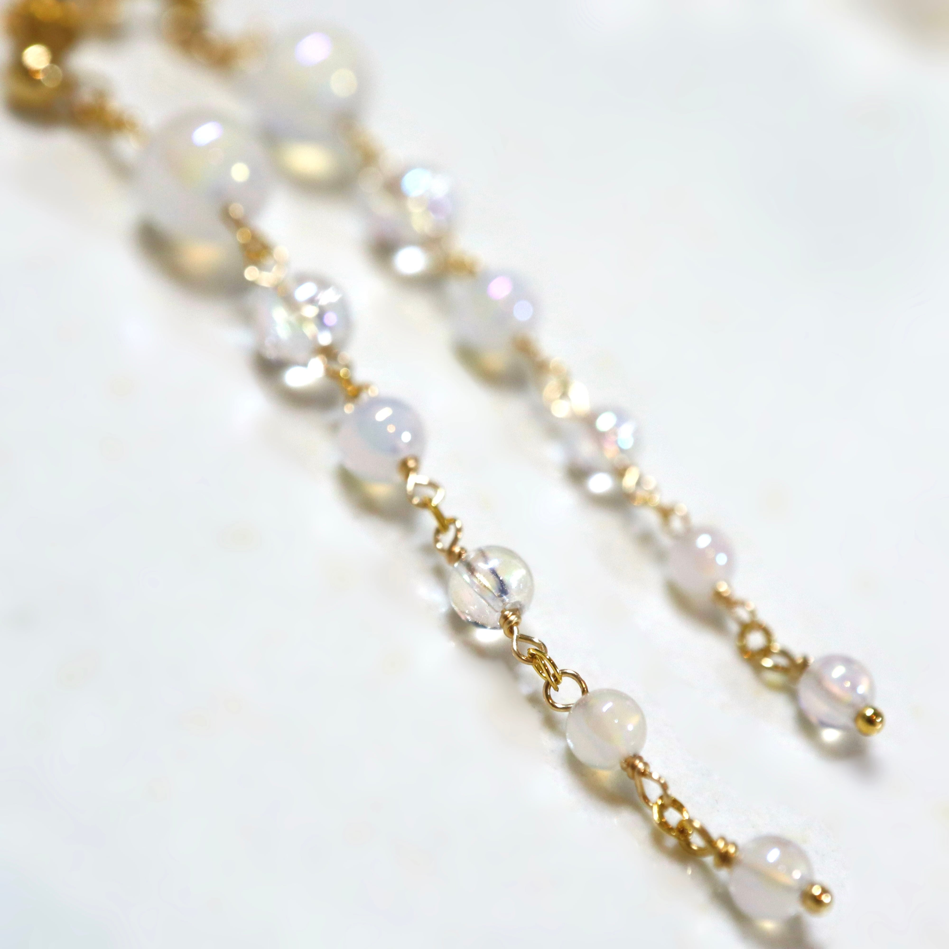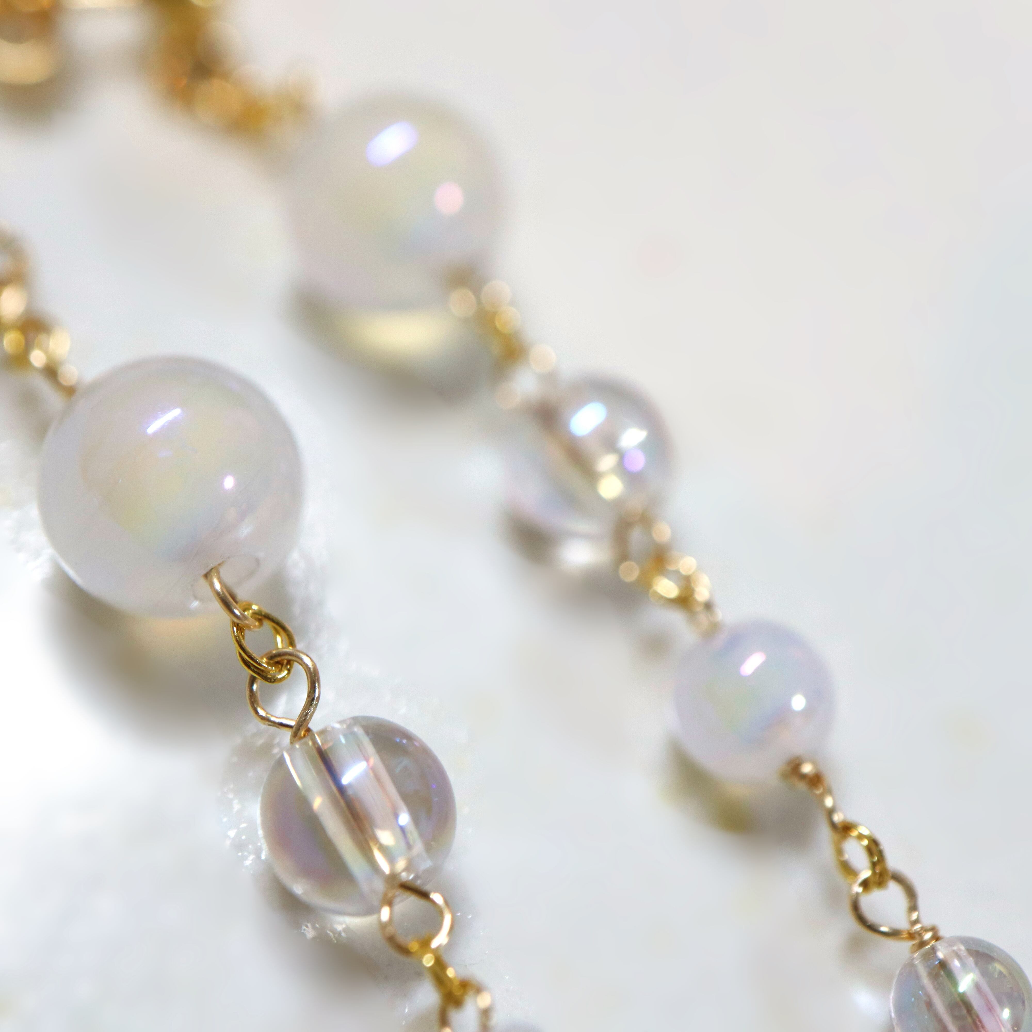 オーロラ調のコーティングが施された透明感あふれるクリスタルと、ミルキーカラーのホワイトカルセドニーを使用し、上品でやわらかな印象に。