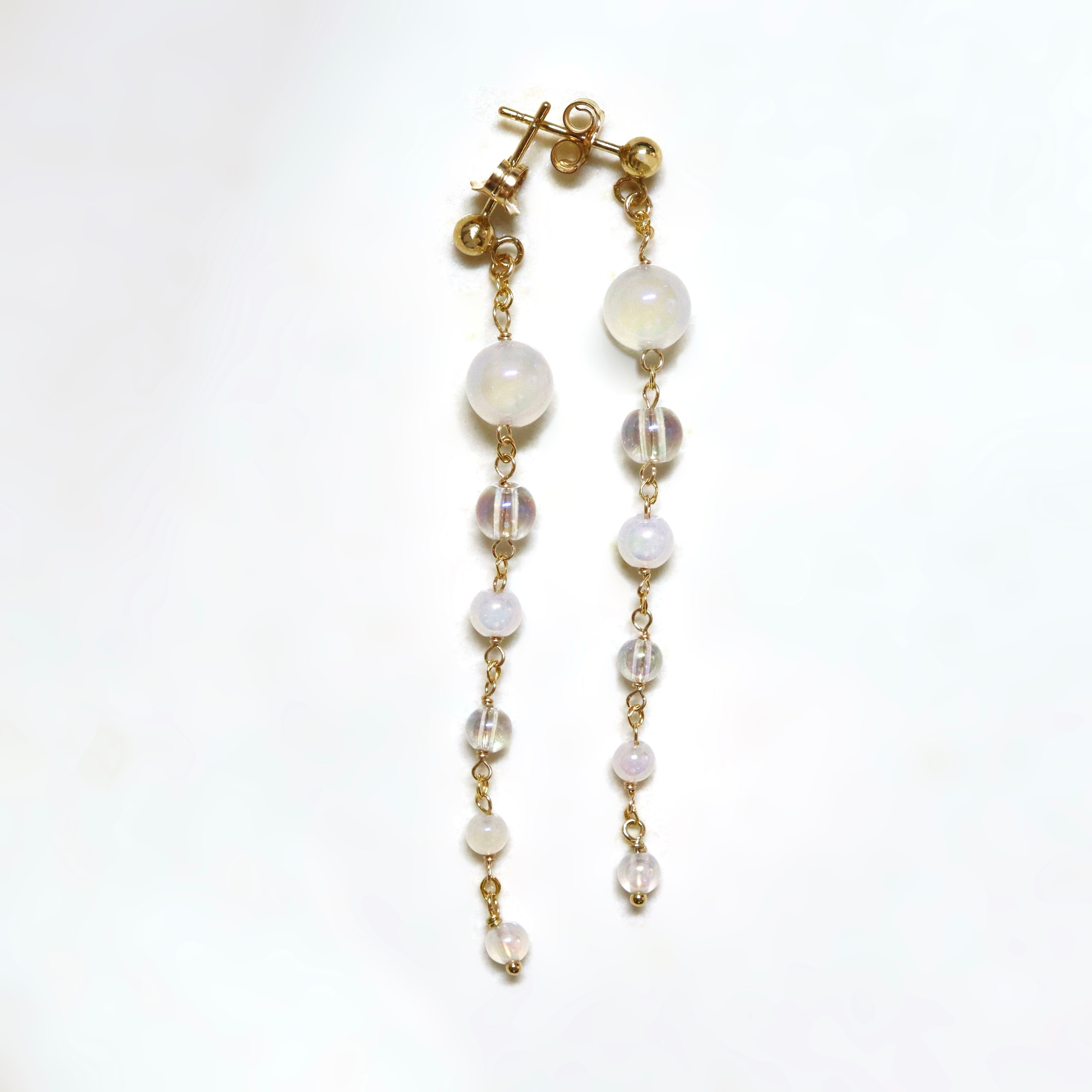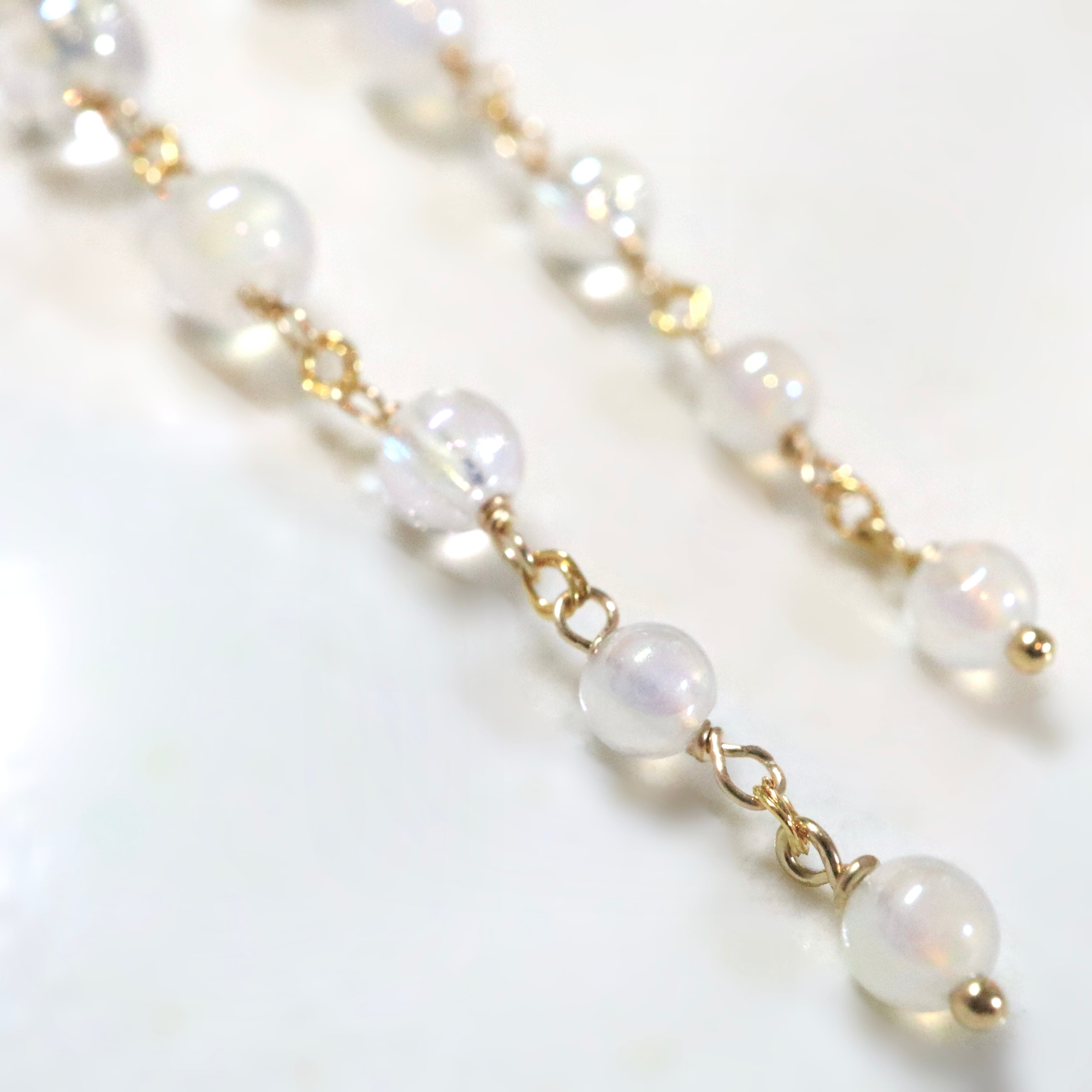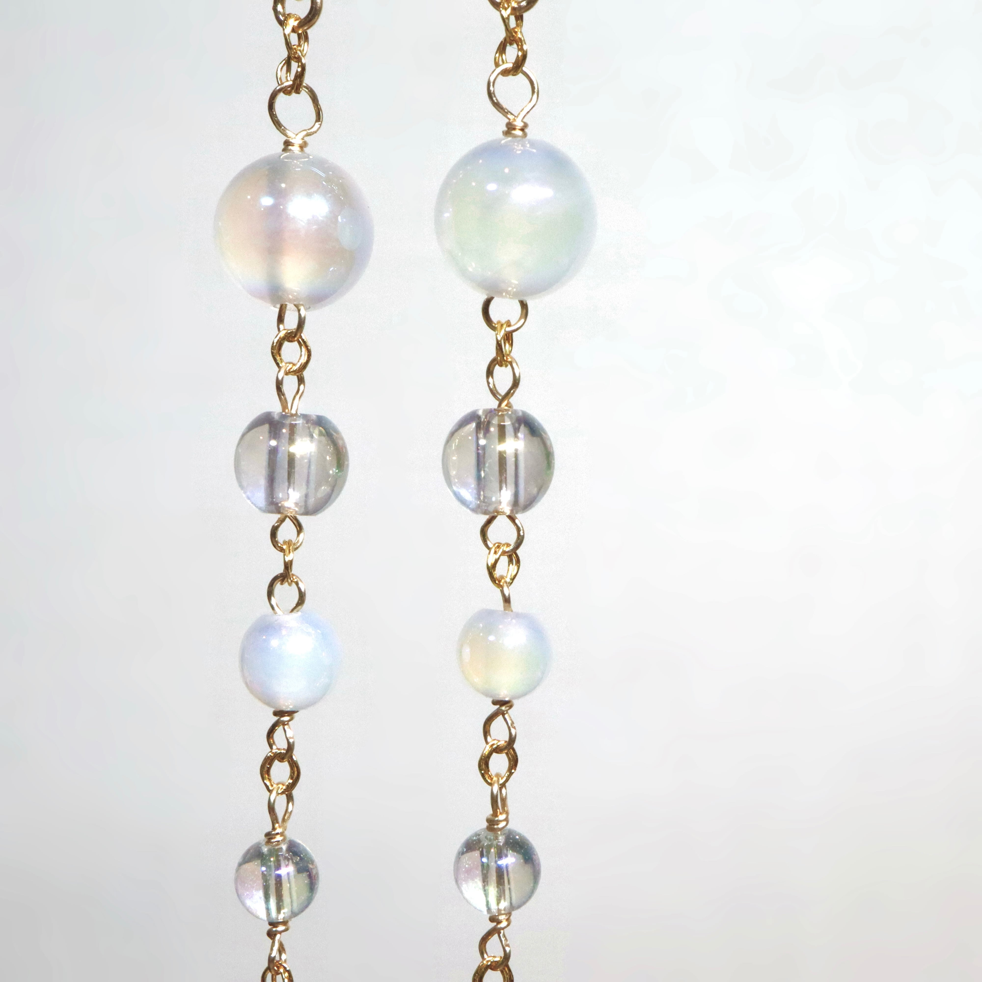 オーロラ調のコーティングが施された透明感あふれるクリスタルと、ミルキーカラーのホワイトカルセドニーを使用し、上品でやわらかな印象に。