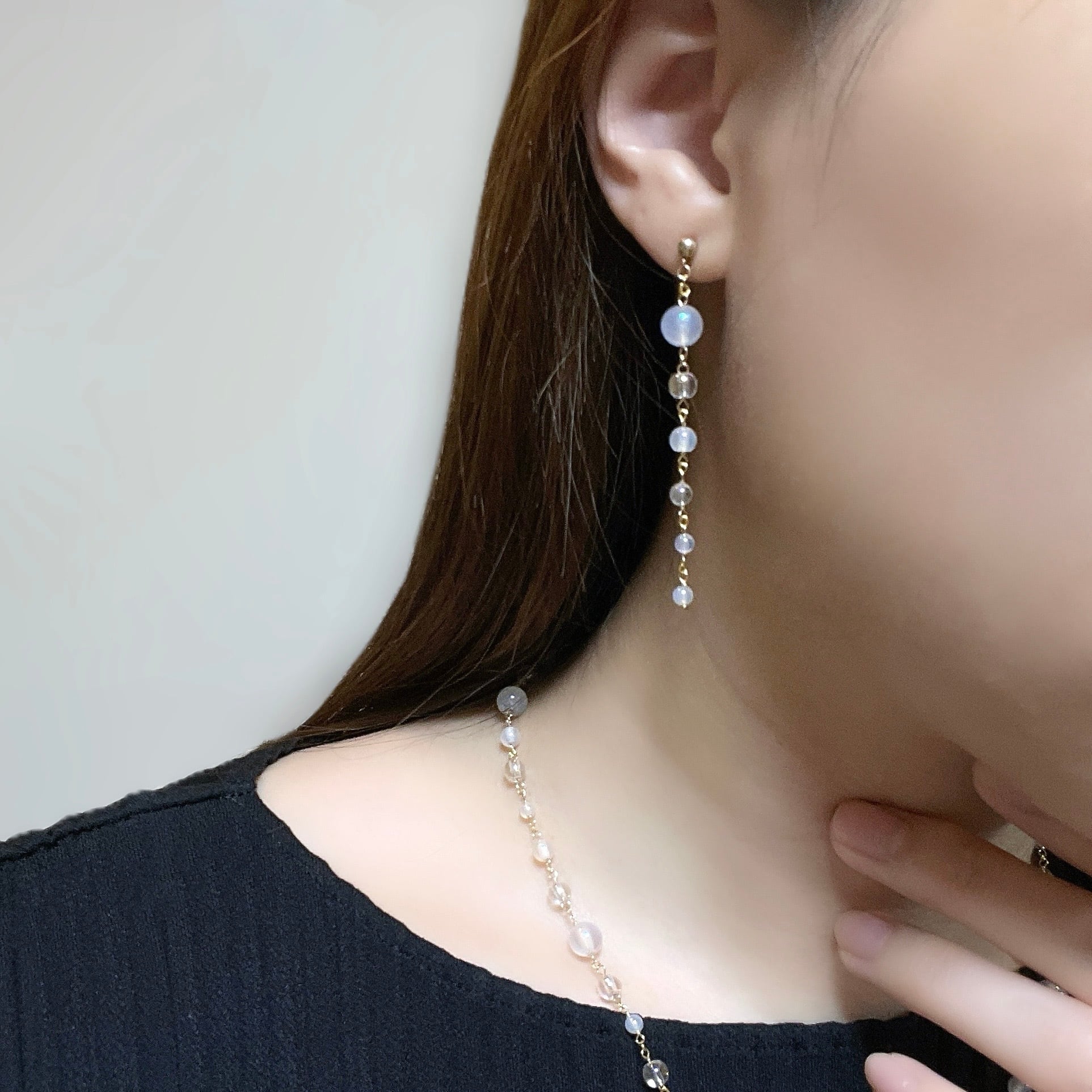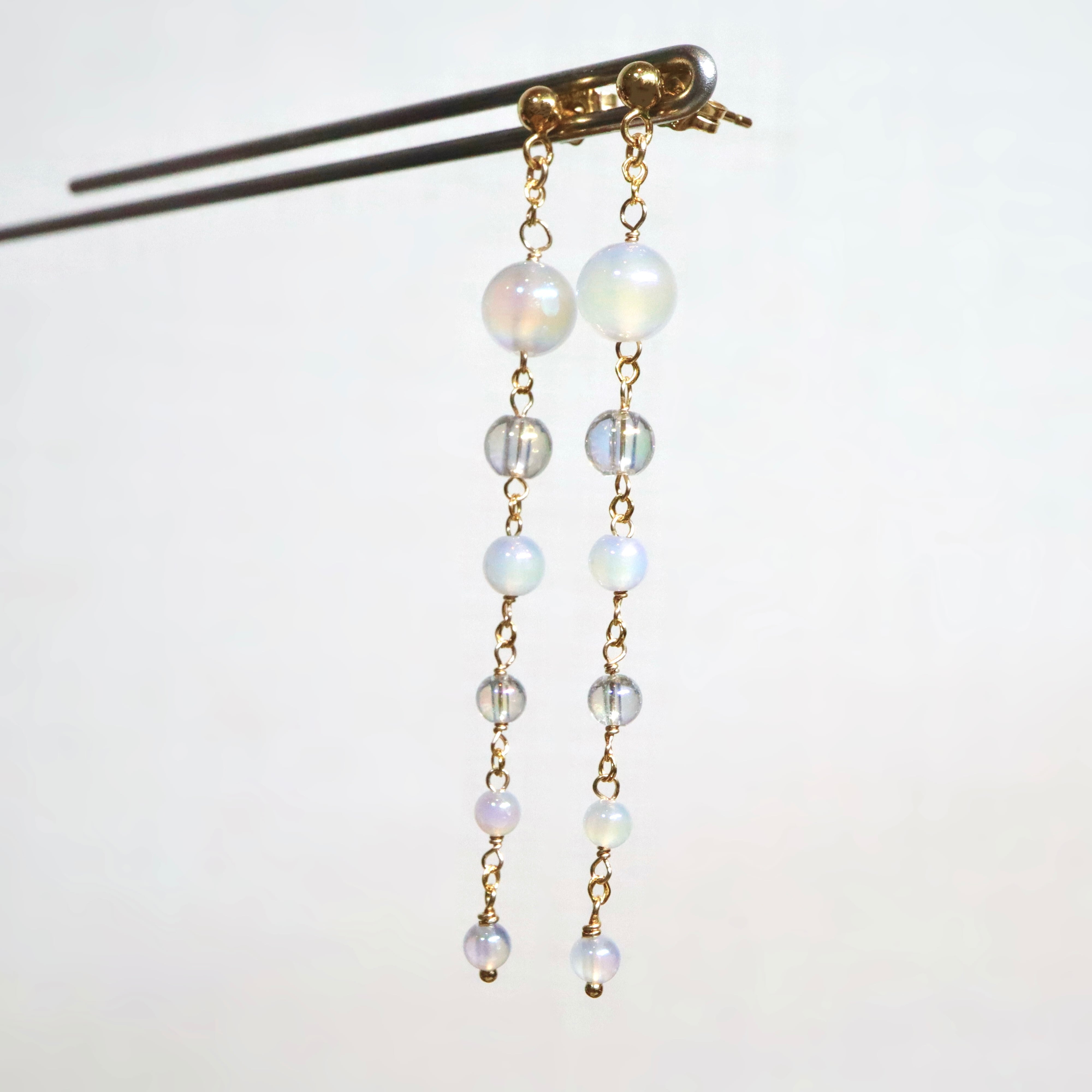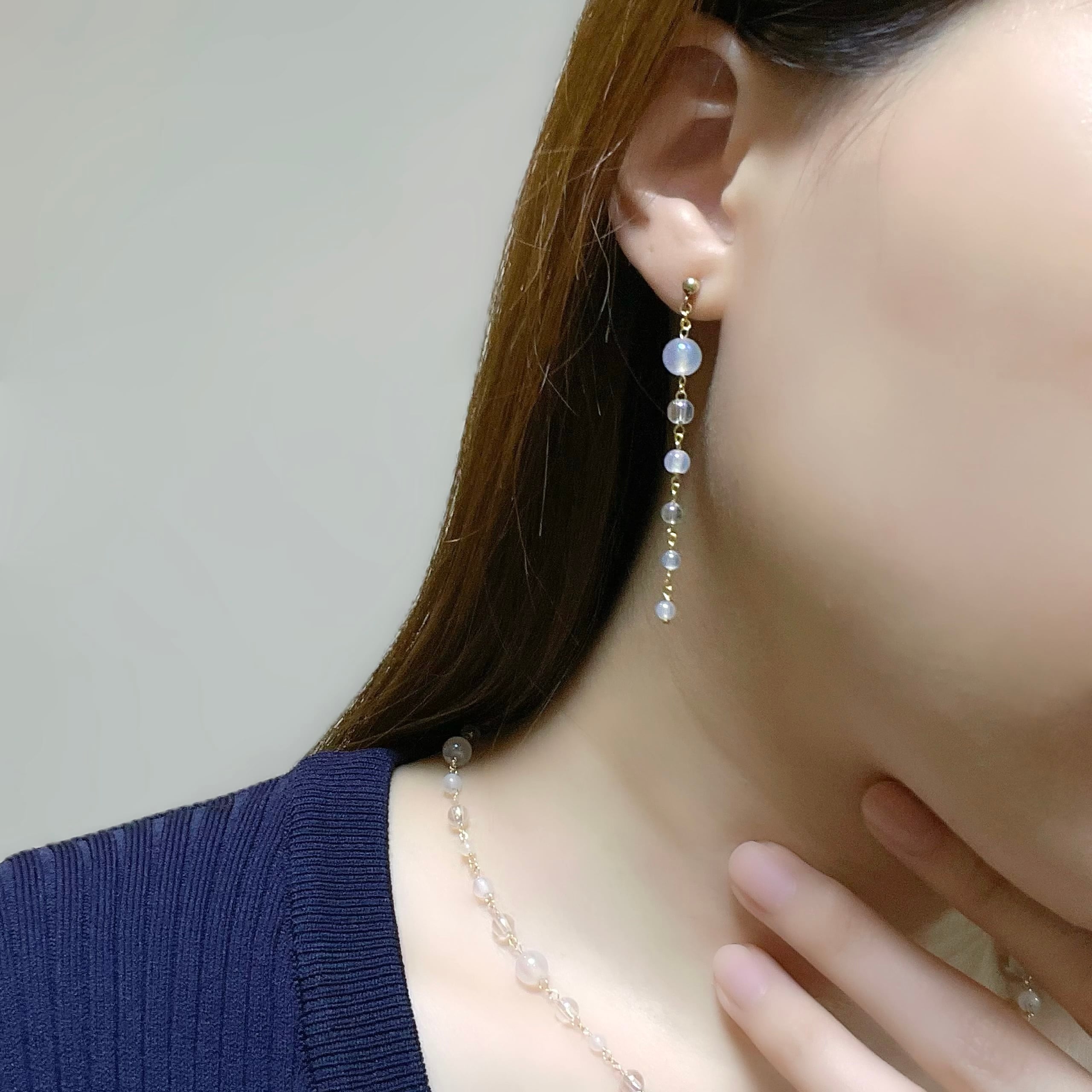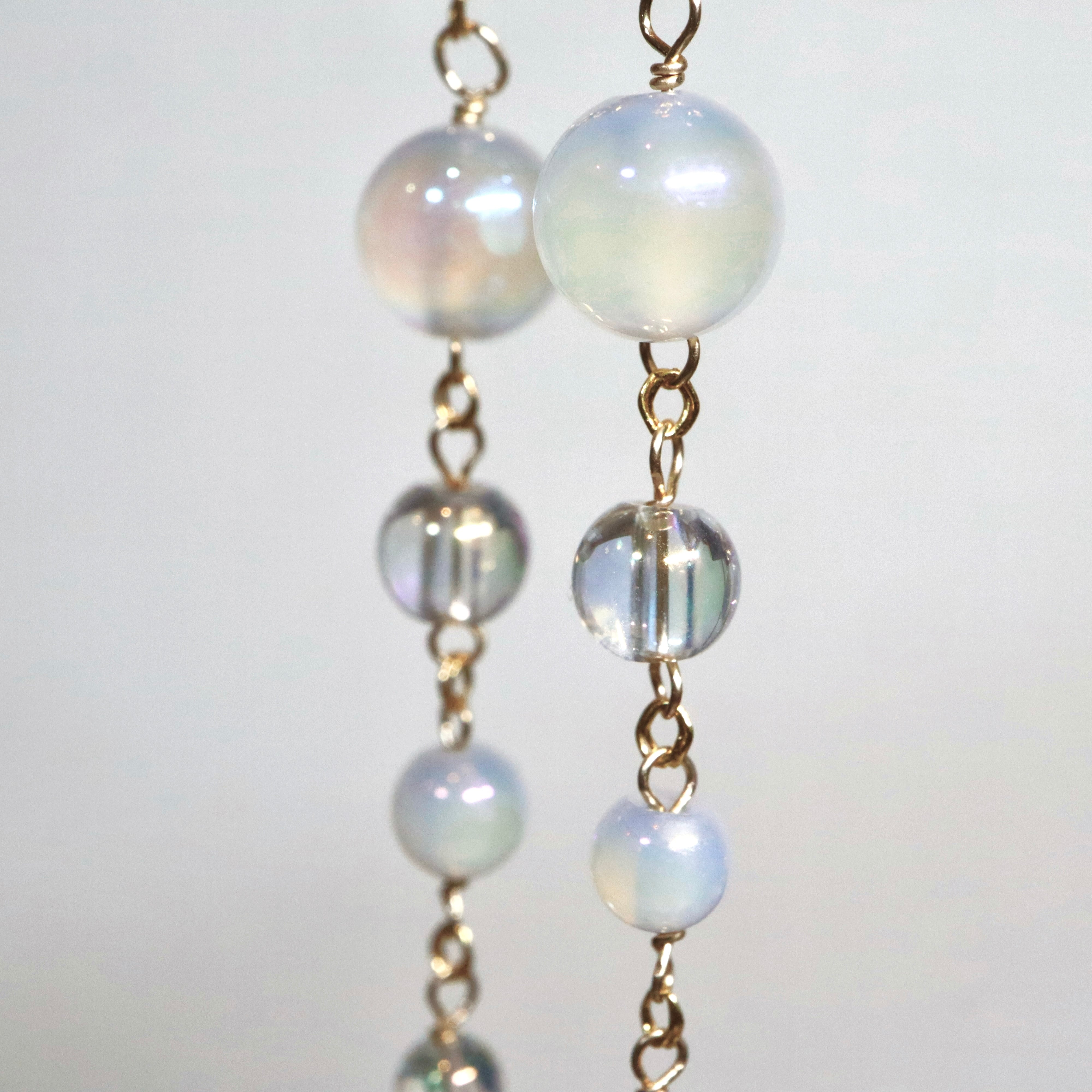 オーロラ調のコーティングが施された透明感あふれるクリスタルと、ミルキーカラーのホワイトカルセドニーを使用し、上品でやわらかな印象に。