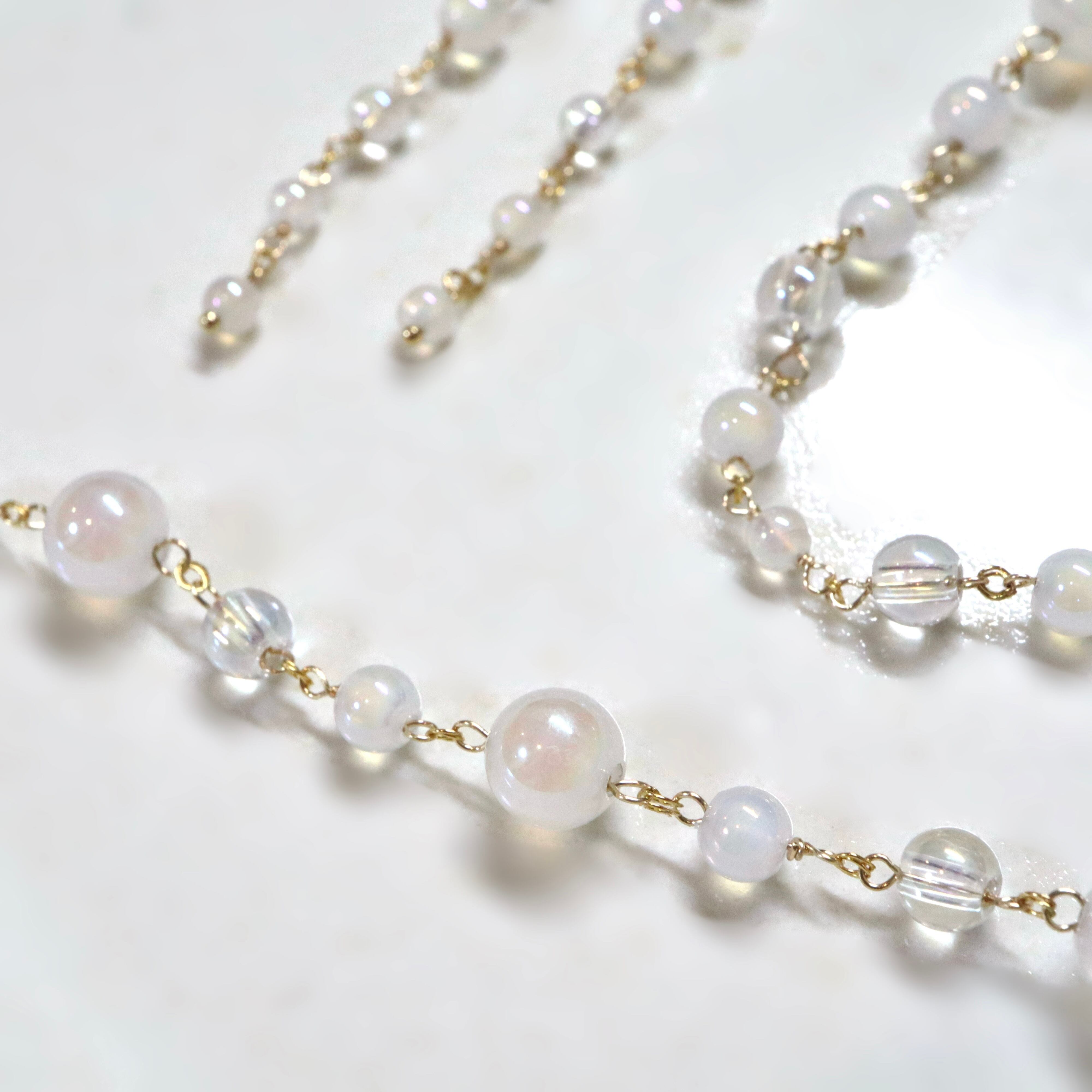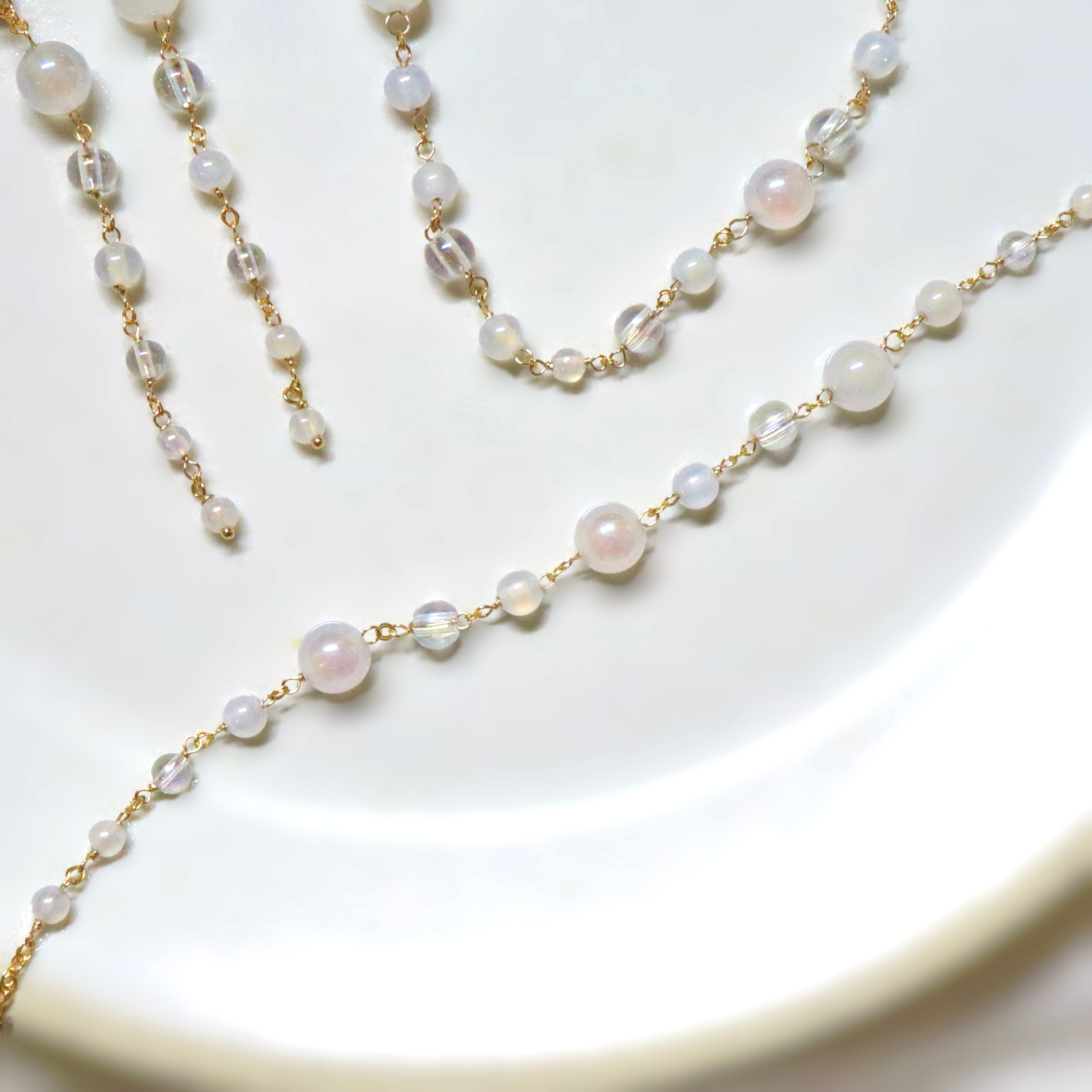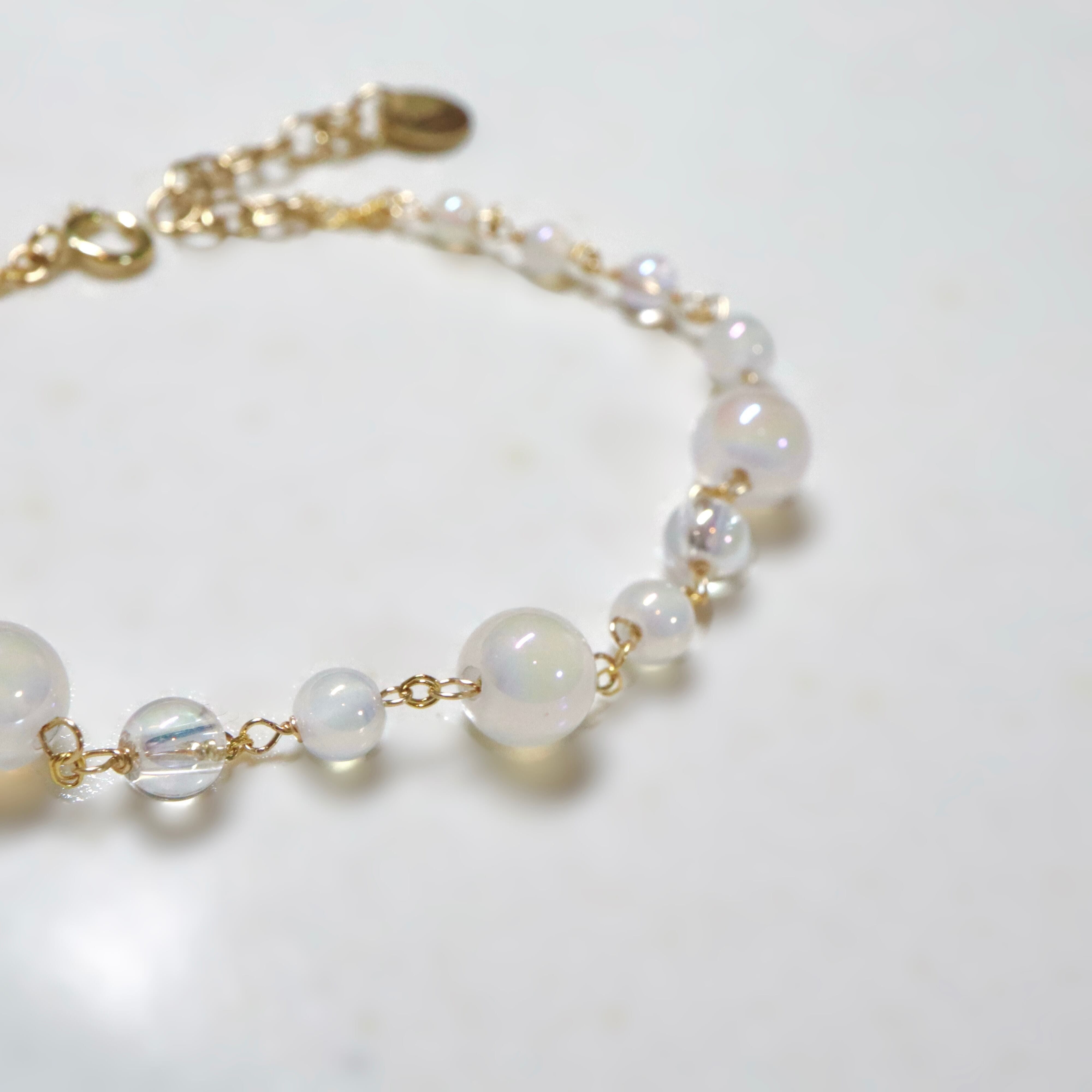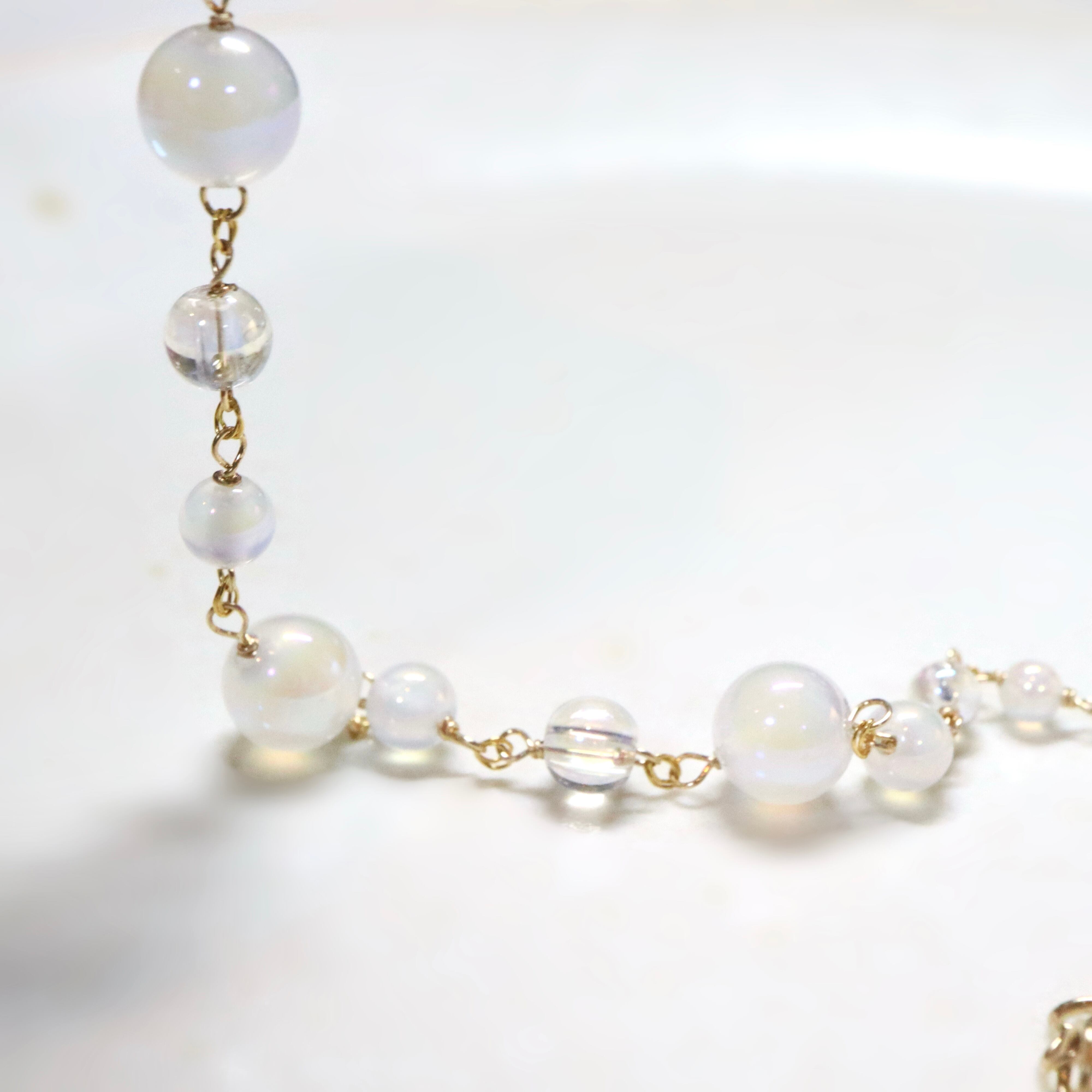 オーロラ調のコーティングが施された透明感あふれるクリスタルと、ミルキーカラーのホワイトカルセドニーを使用し、上品でやわらかな印象に。