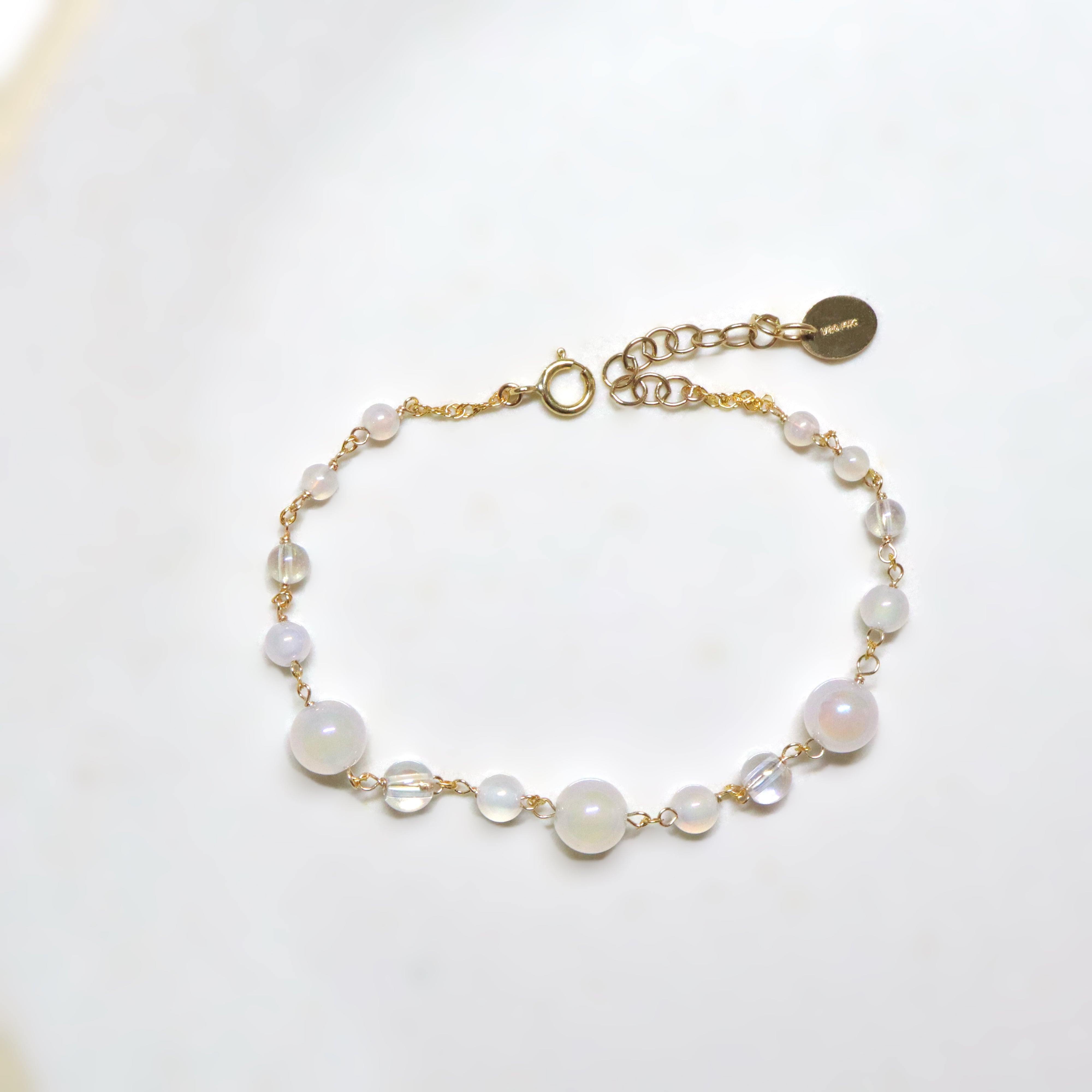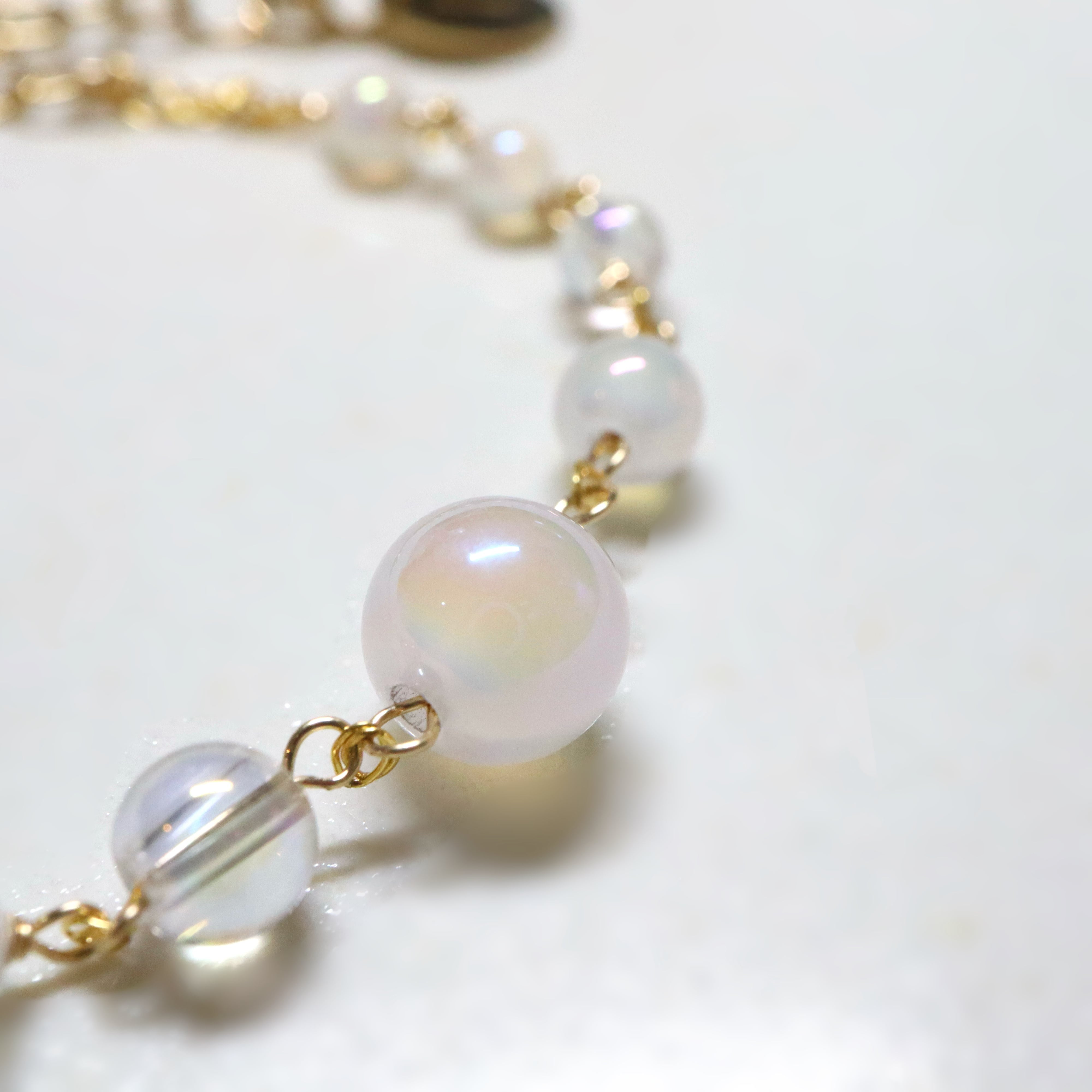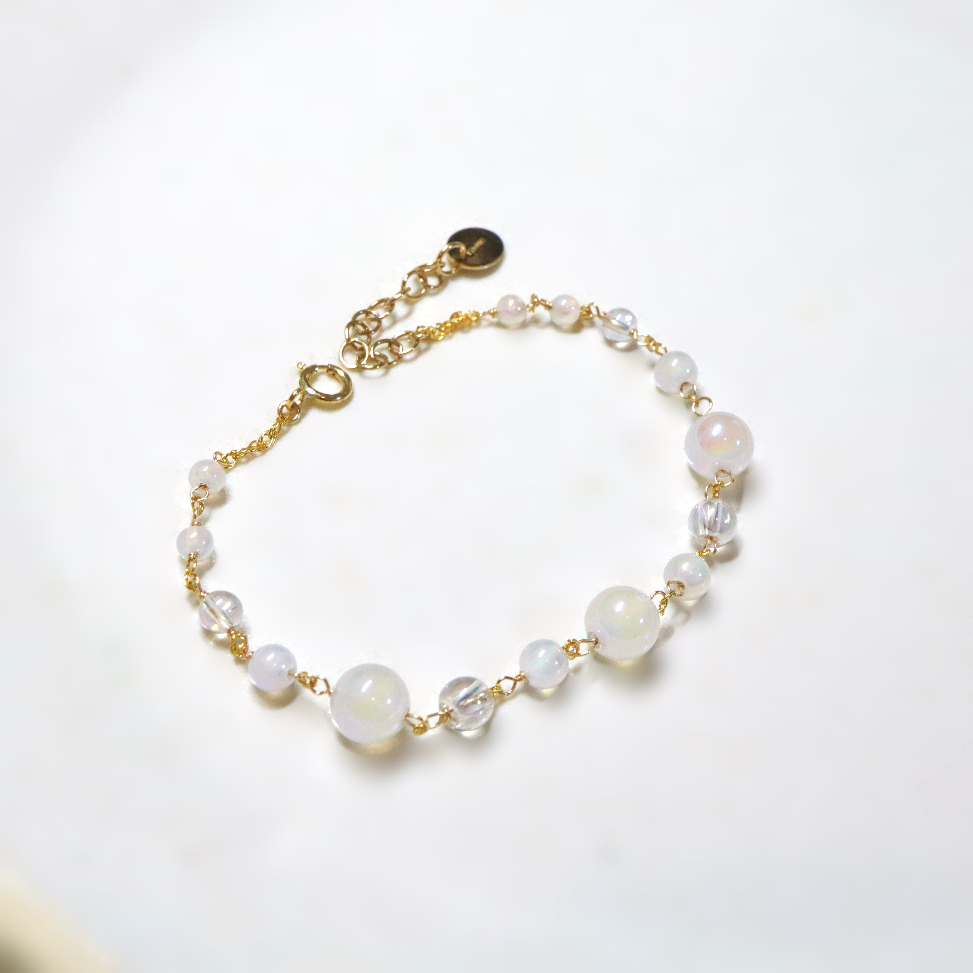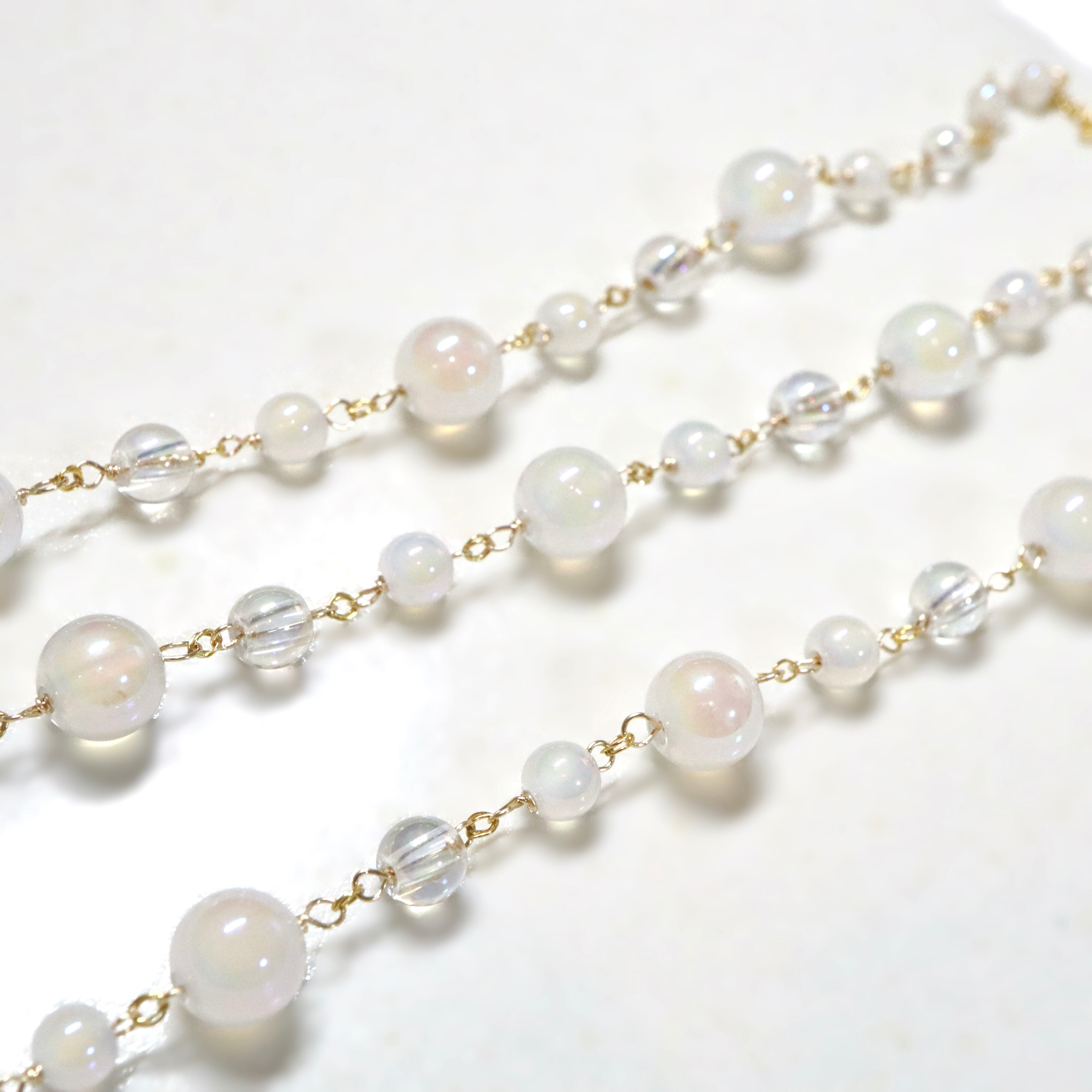 オーロラ調のコーティングが施された透明感あふれるクリスタルと、ミルキーカラーのホワイトカルセドニーを使用し、上品でやわらかな印象に。