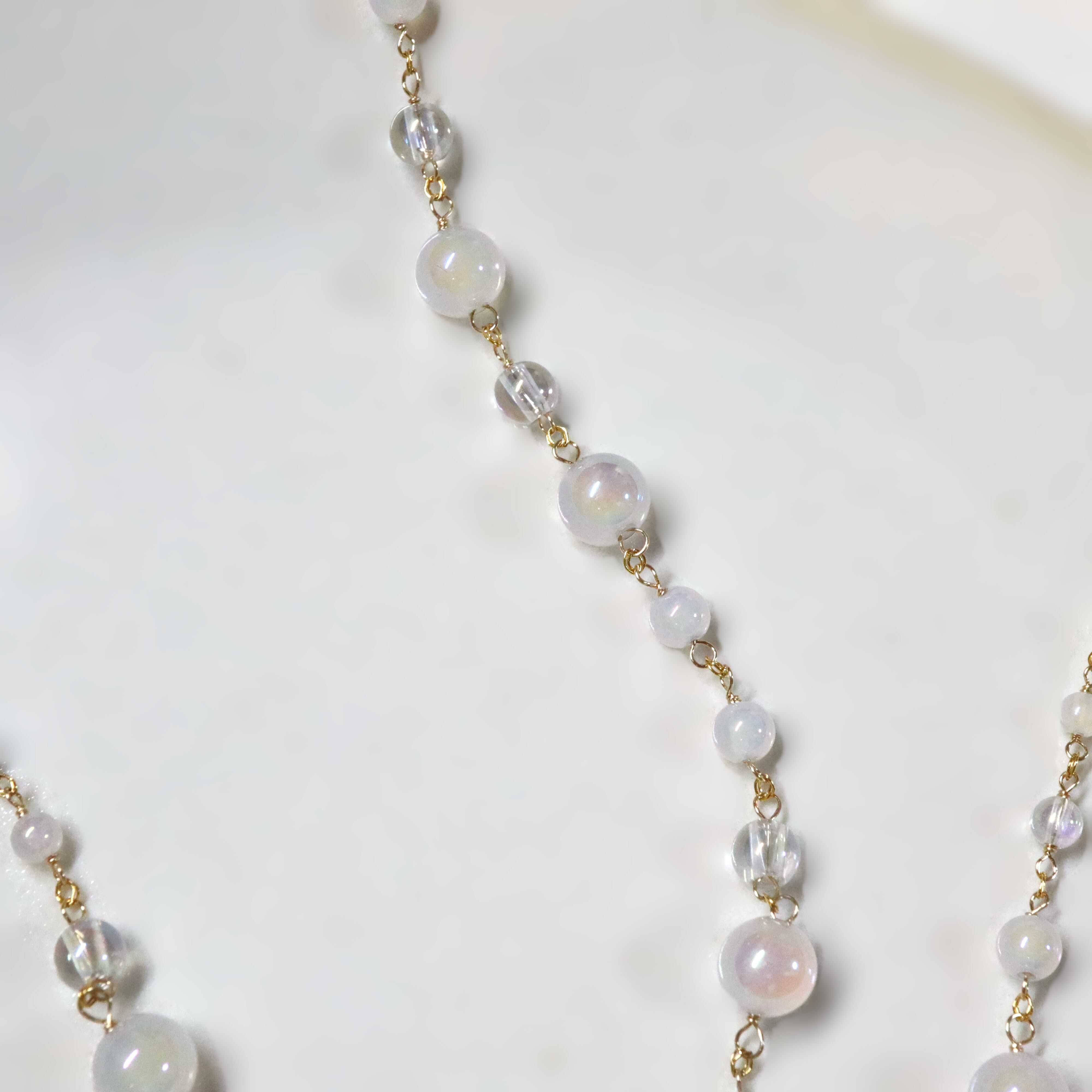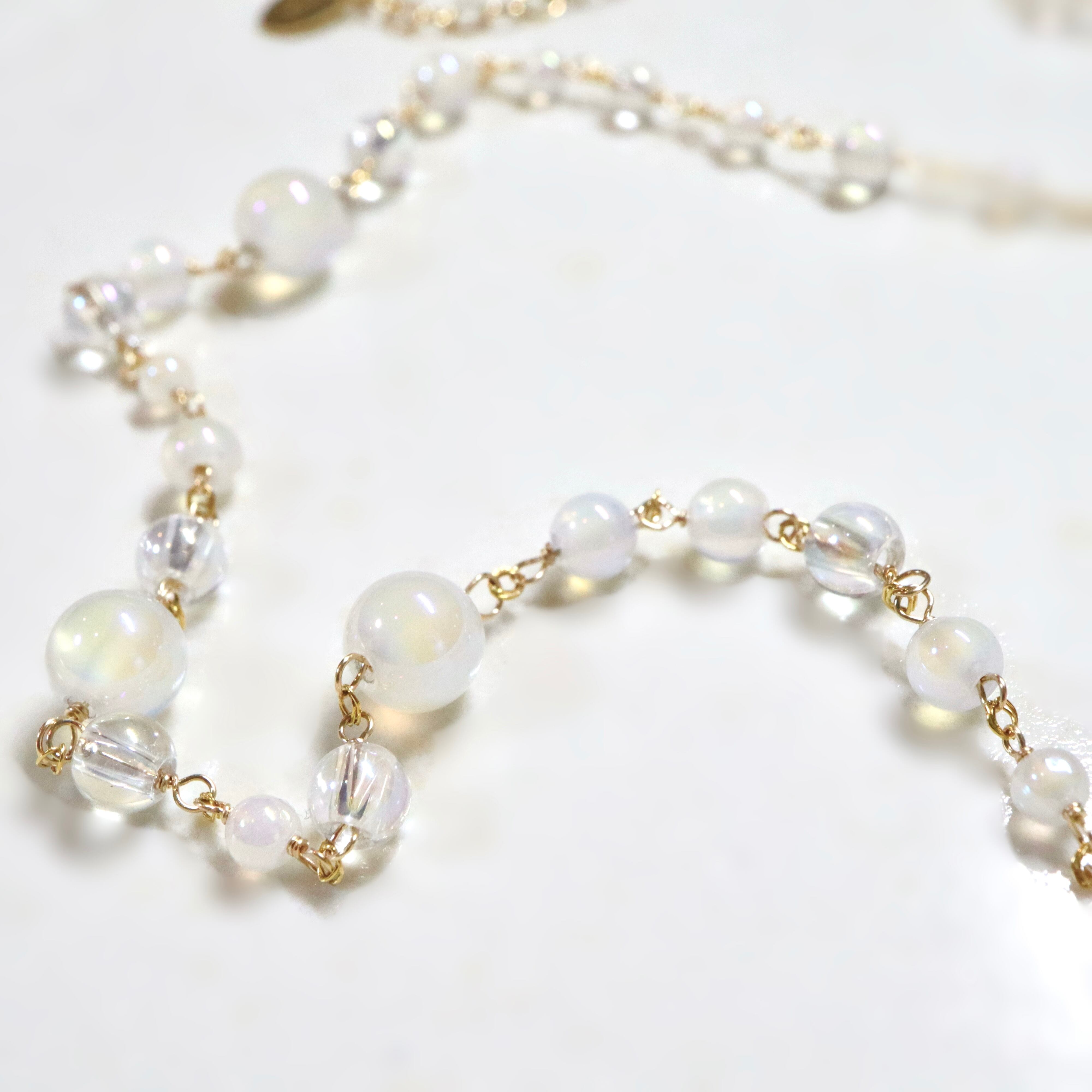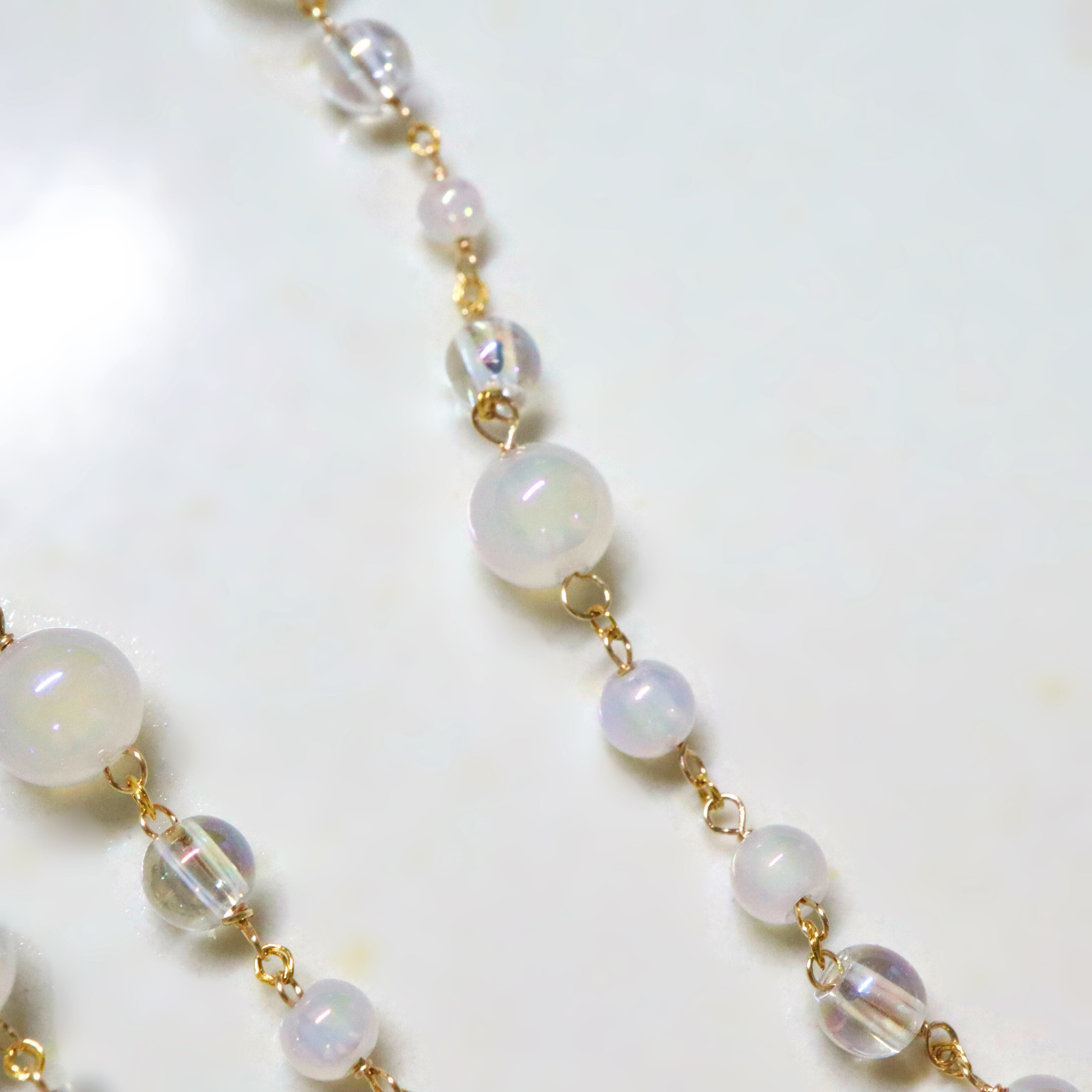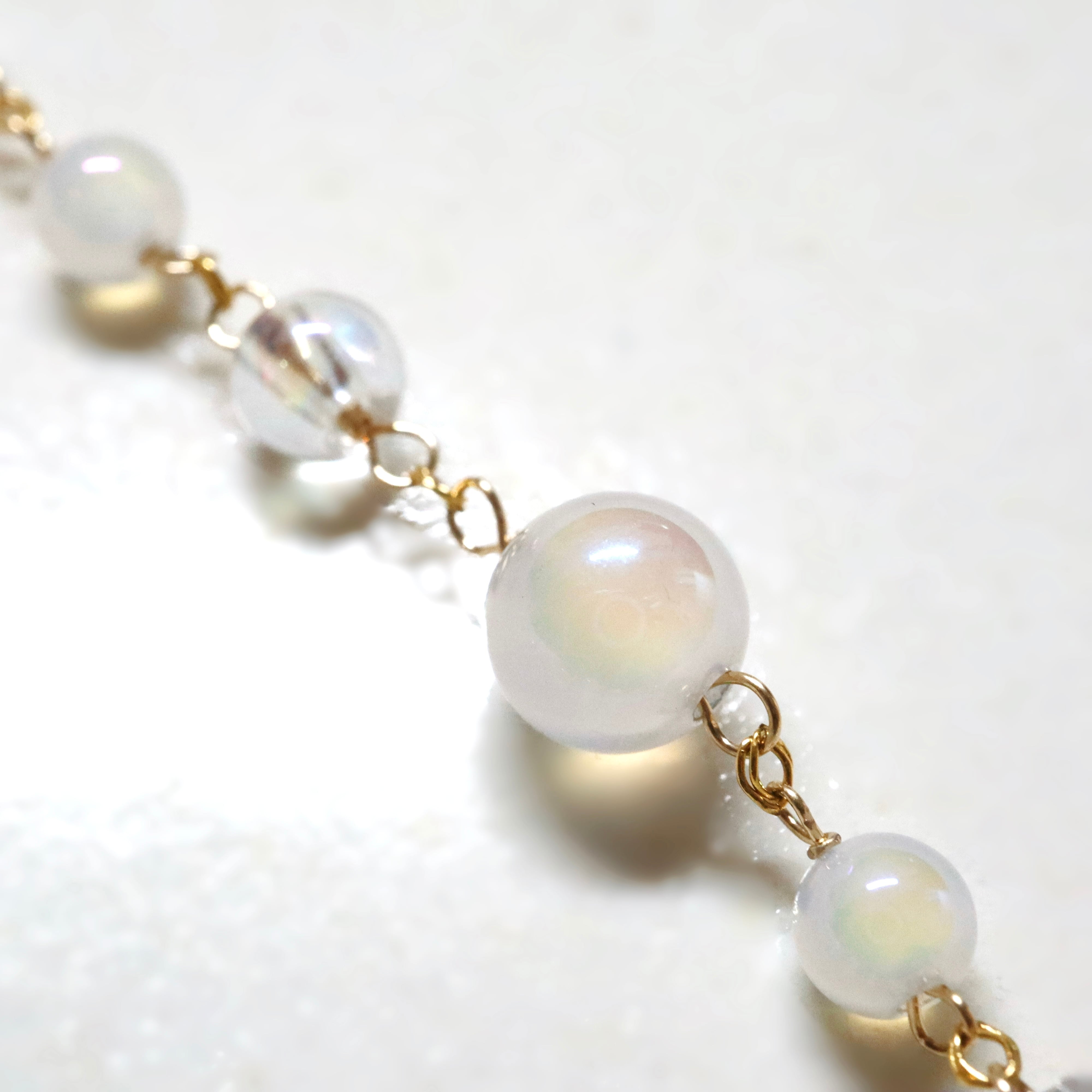 オーロラ調のコーティングが施された透明感あふれるクリスタルと、ミルキーカラーのホワイトカルセドニーを使用し、上品でやわらかな印象に。