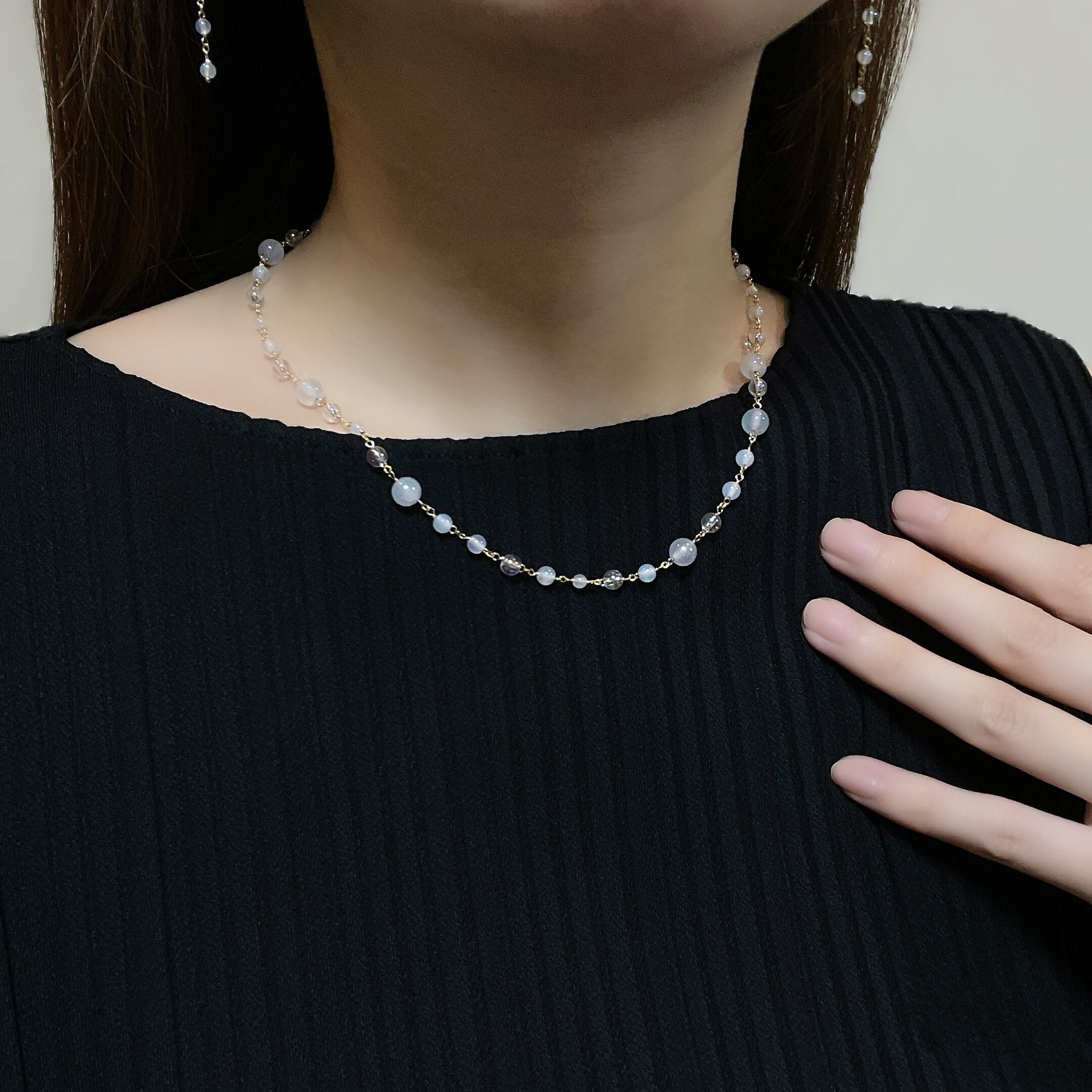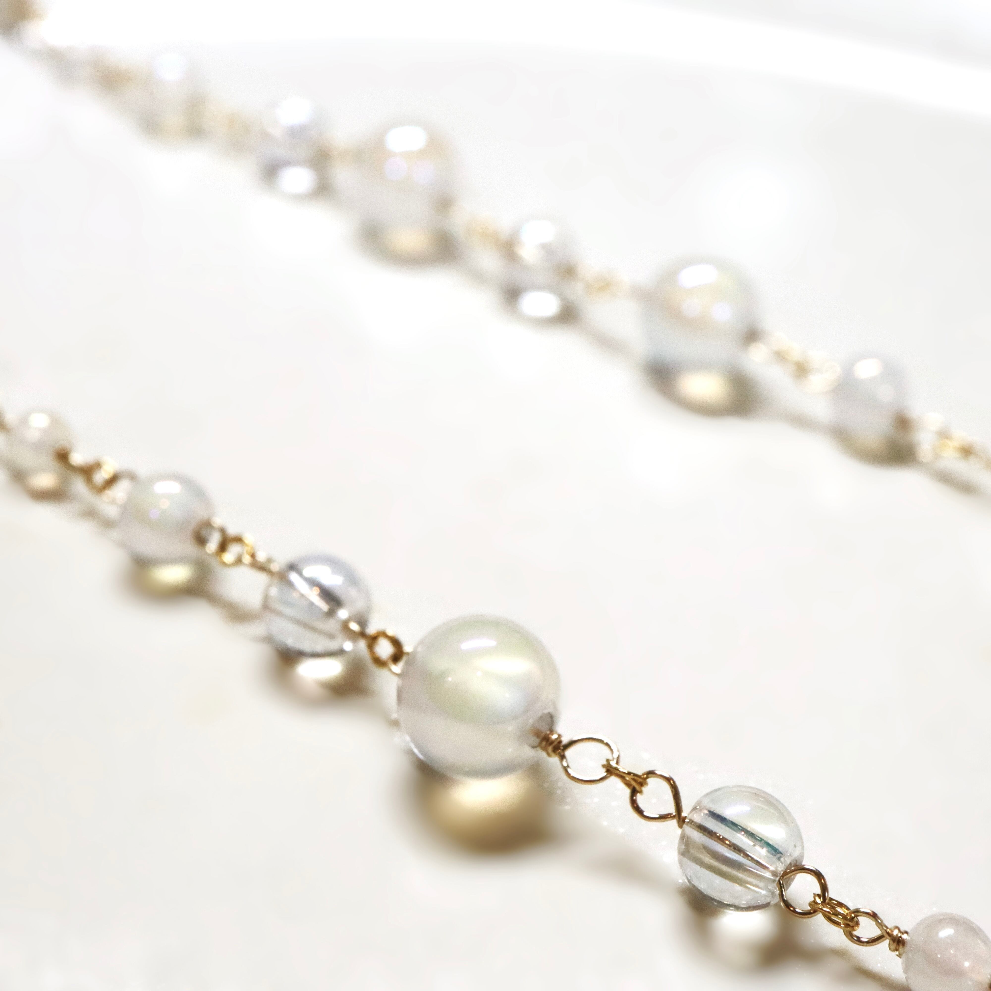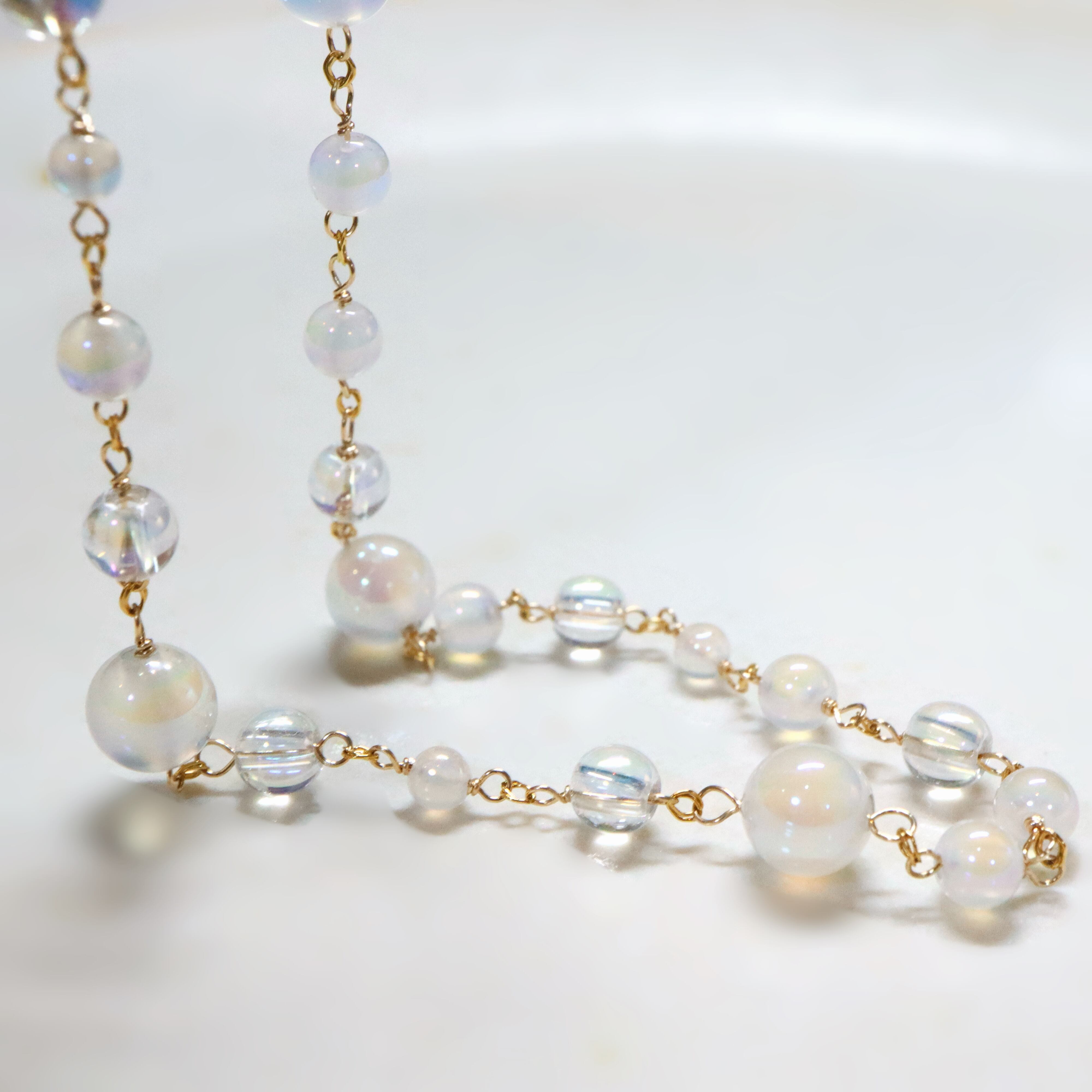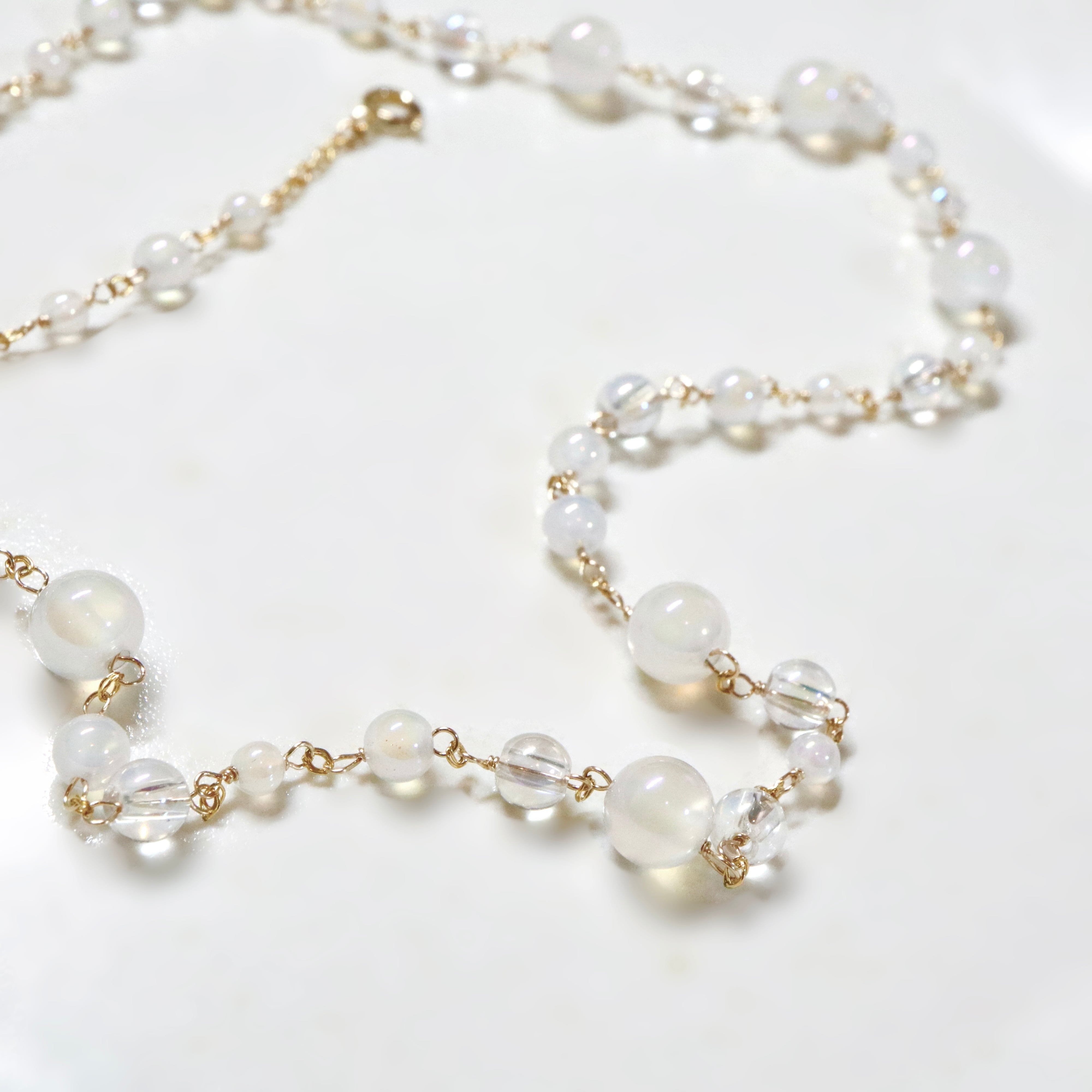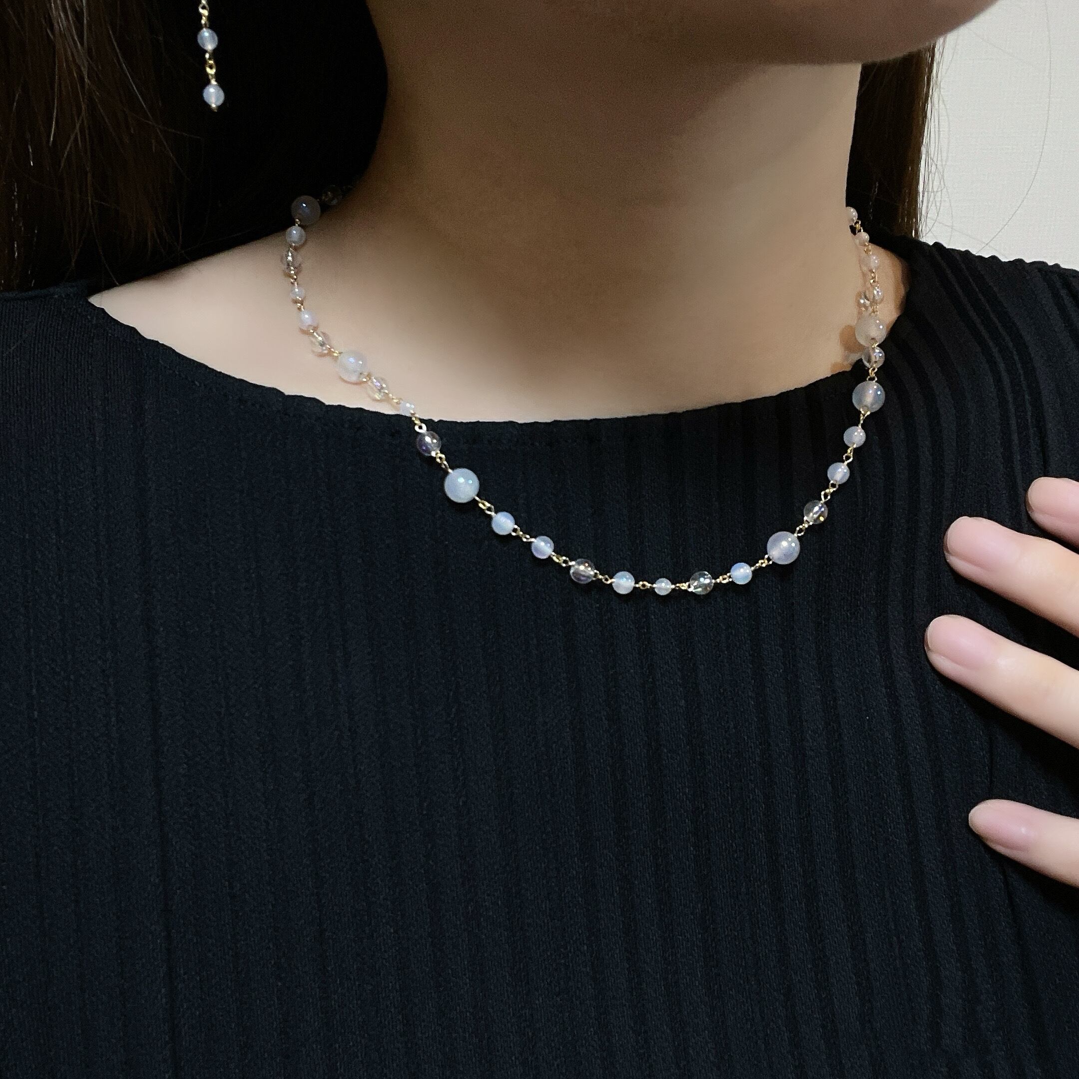 オーロラ調のコーティングが施された透明感あふれるクリスタルと、ミルキーカラーのホワイトカルセドニーを使用し、上品でやわらかな印象に。