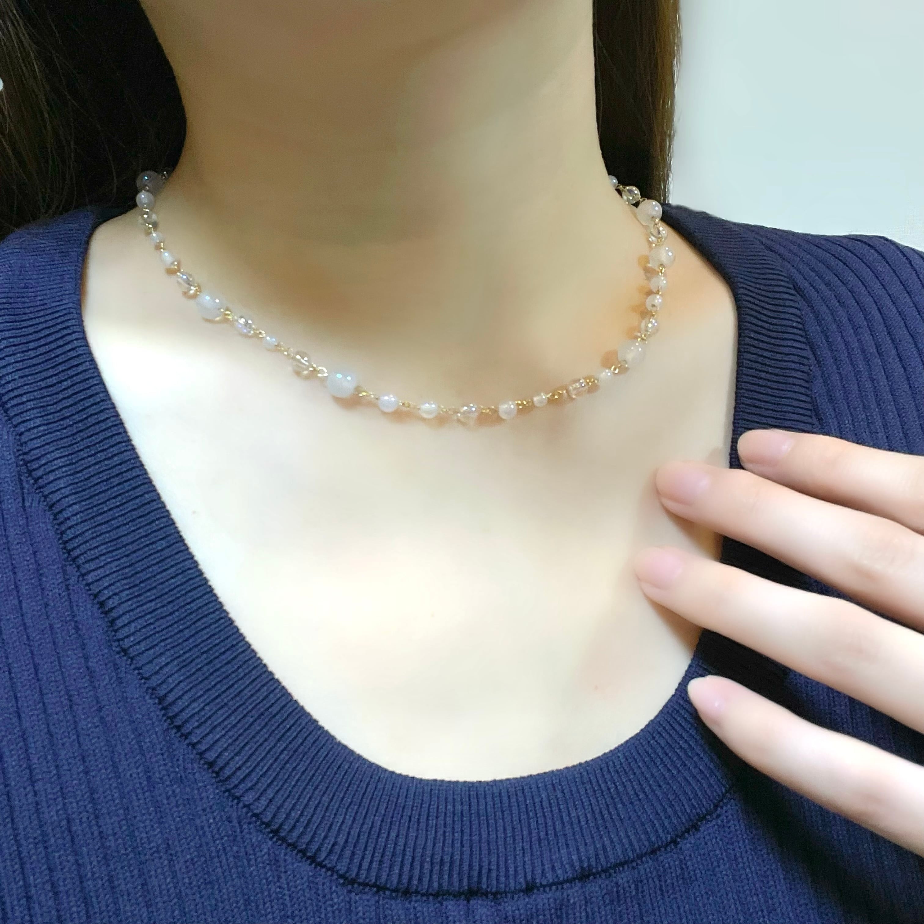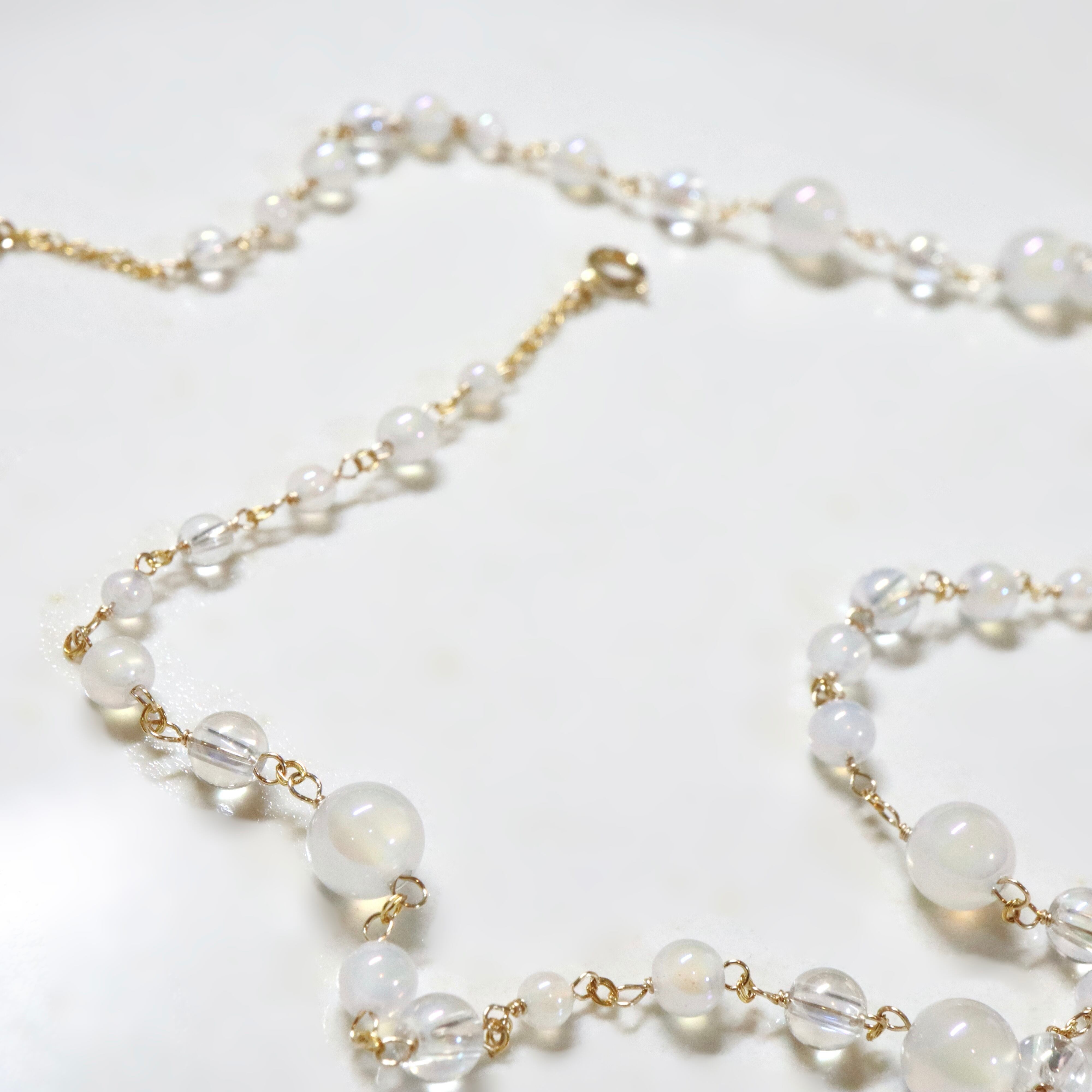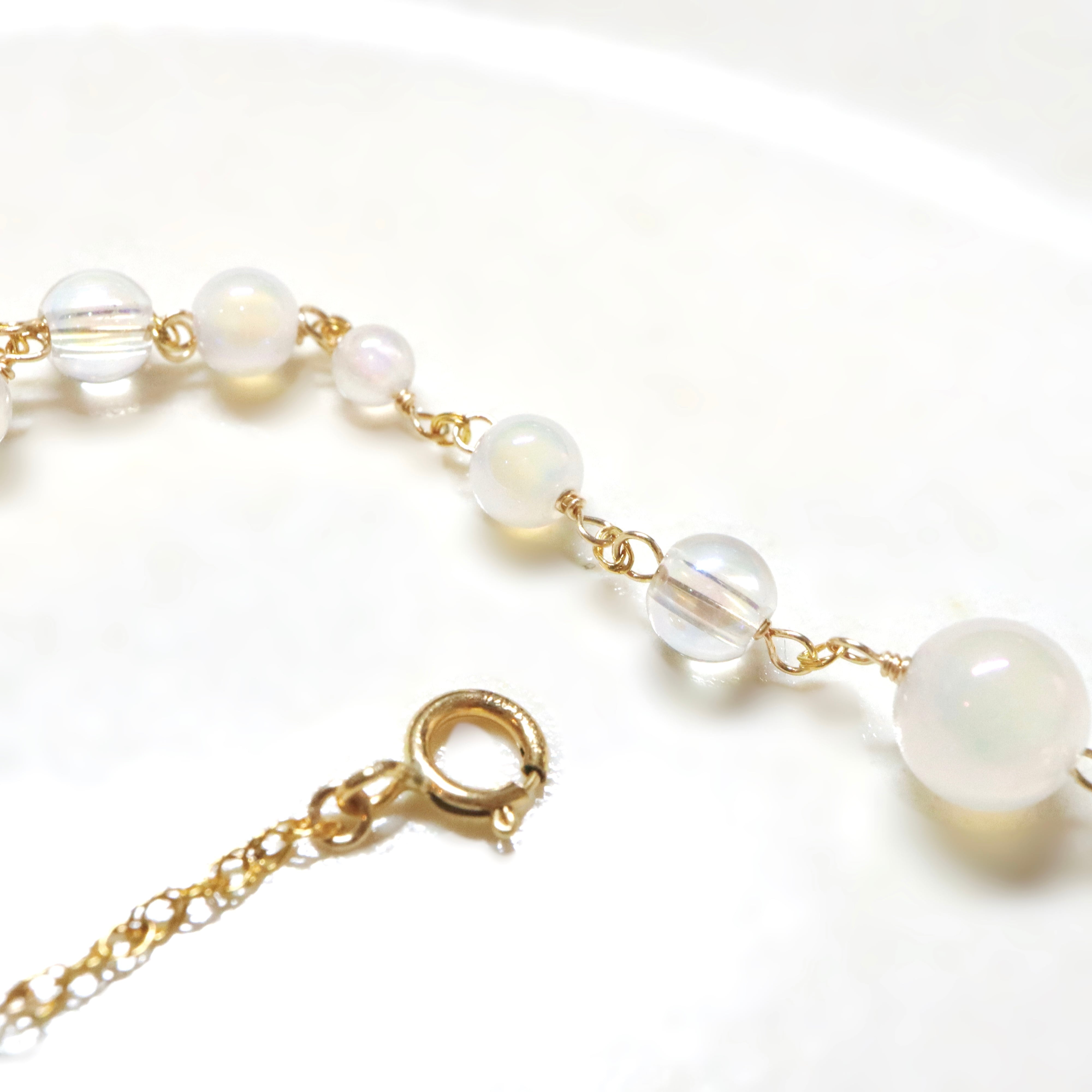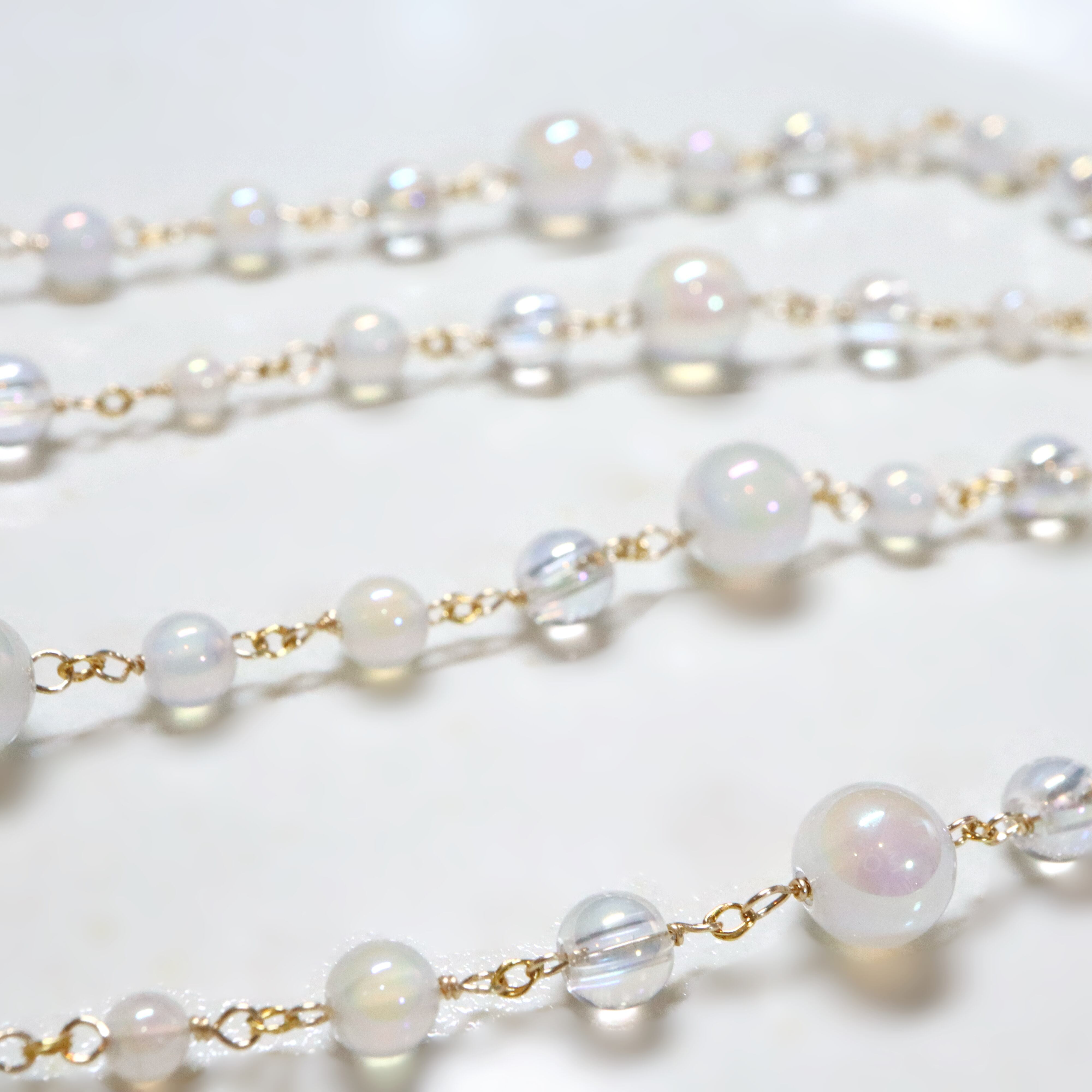 オーロラ調のコーティングが施された透明感あふれるクリスタルと、ミルキーカラーのホワイトカルセドニーを使用し、上品でやわらかな印象に。