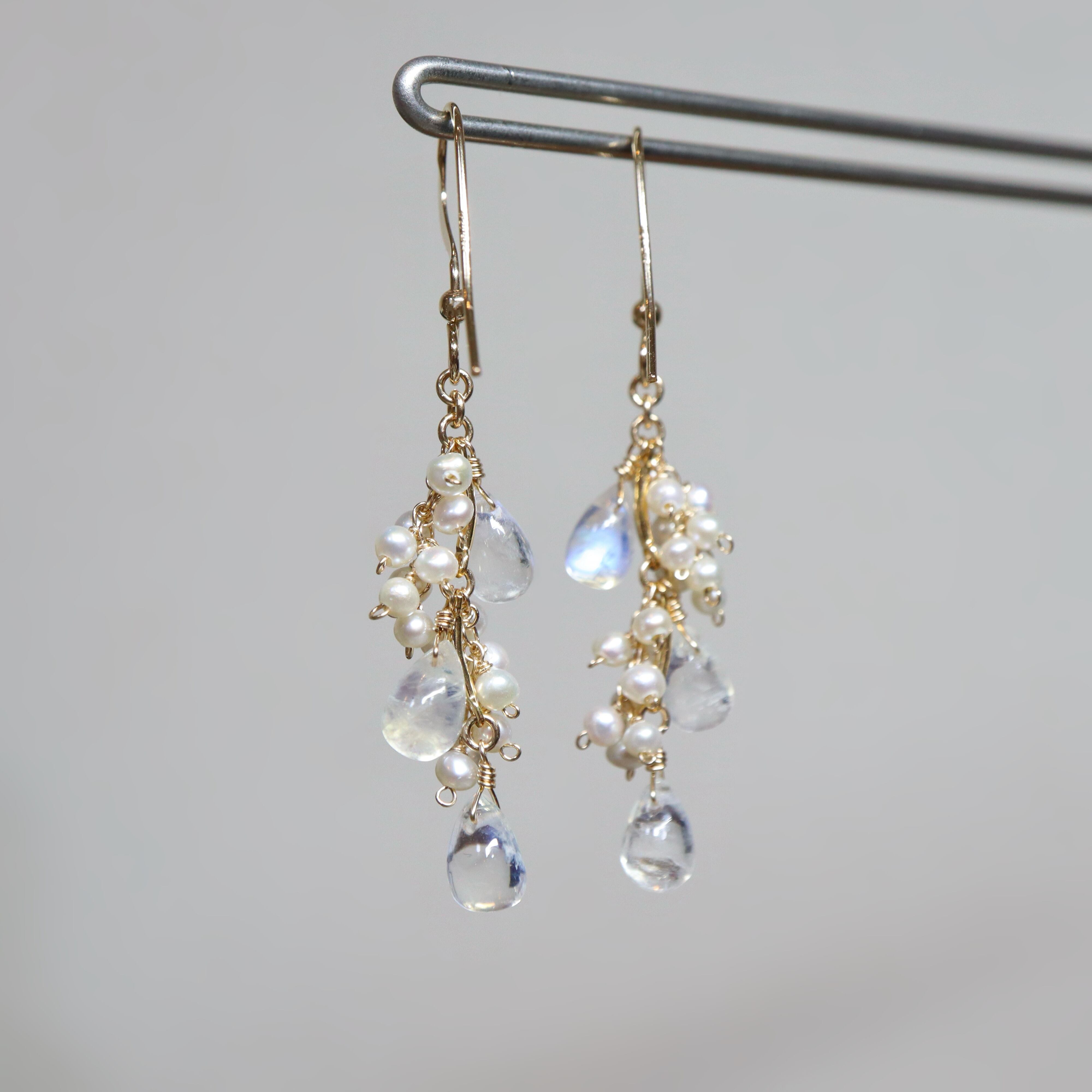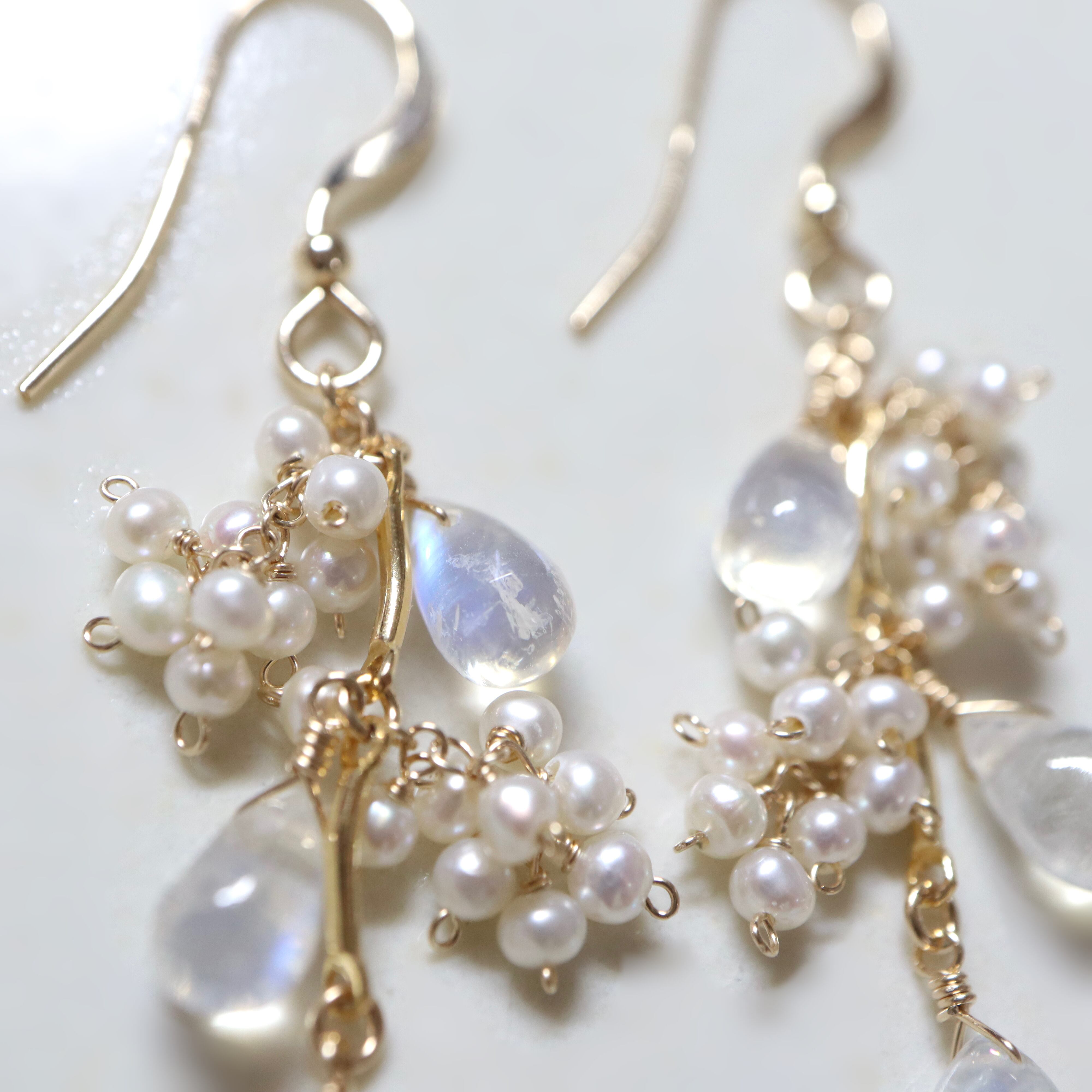 たわわに実る、レインボームーンストーンのドロップを贅沢に使用した、デイリーに身につけやすいショートデザイン。