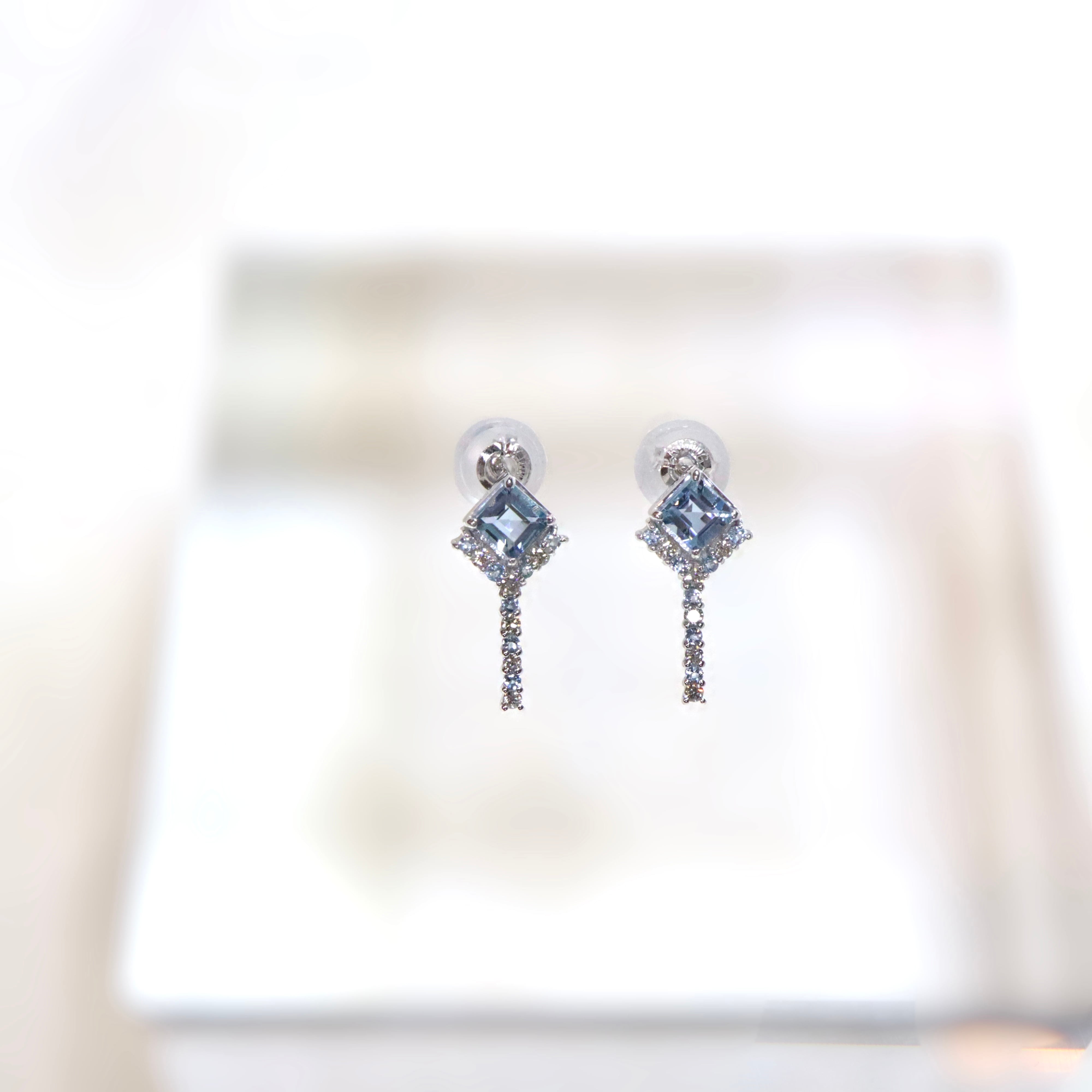 ボトムには小粒ながらも華やかに煌めく天然ダイヤモンドと淡いブルーカラーのスカイブルートパーズを交互に配置し、耳元から滴るような華奢なラインに。