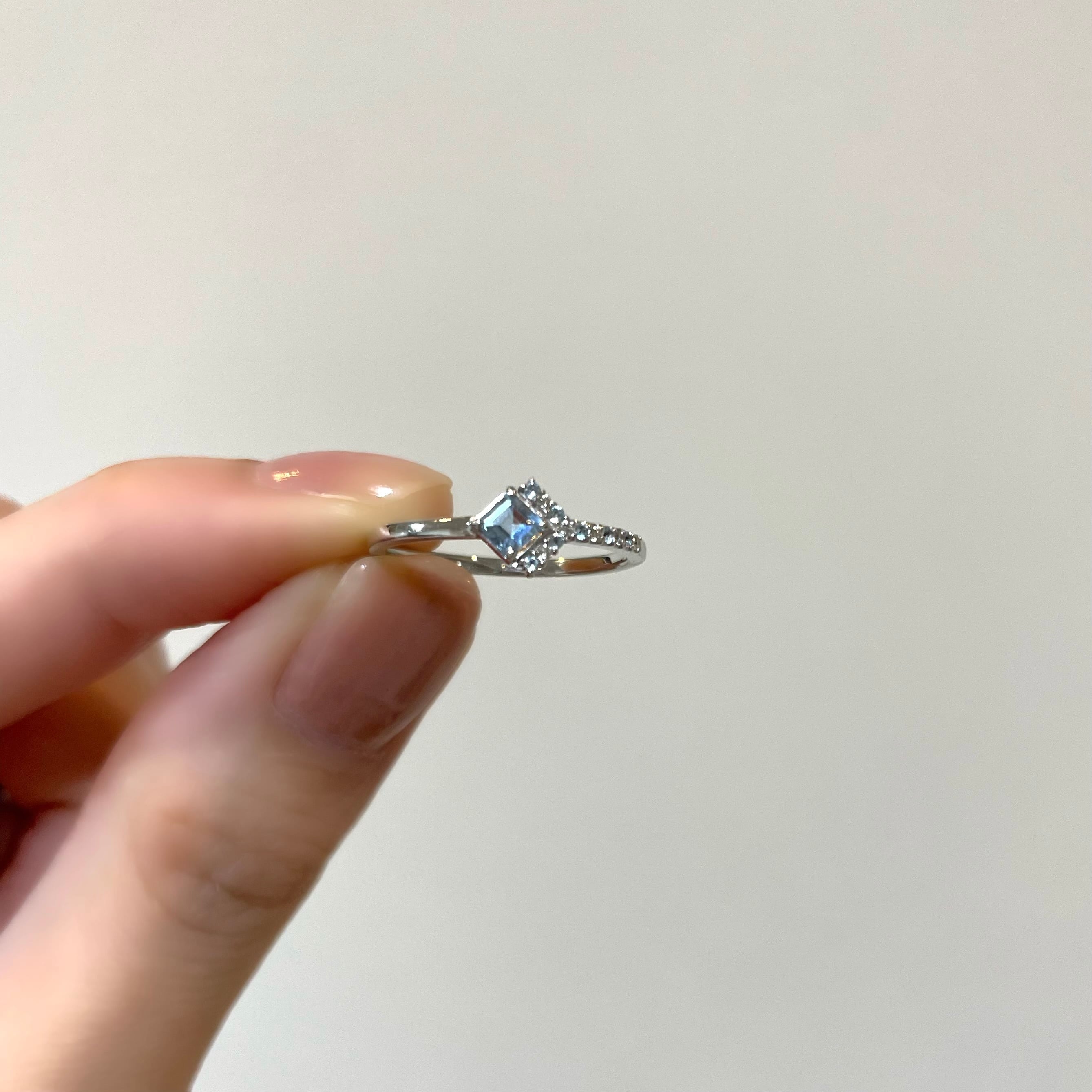 アシンメトリーなサイドには小粒ながらも華やかに煌めく天然ダイヤモンドと淡いブルーカラーのスカイブルートパーズを交互に配置。指周りに滴るような華奢なラインに仕上げました。